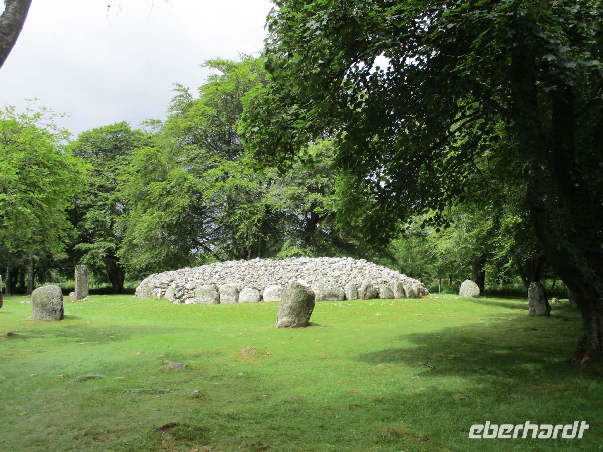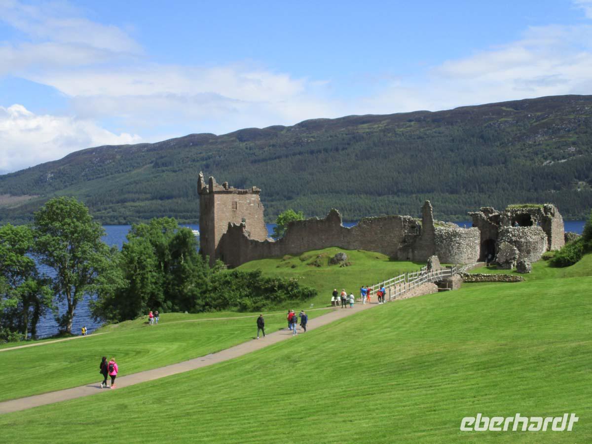 Dieser Tag beginnt mit der Besichtigung von Fort George. 1746 errichtet, bietet es Militärgeschichte zum anfassen. Die Kaserne ist im Originalzustand erhalten. Trotz der Tatsache, dass dort auch Soldaten stationiert sind, ist man mit einem Museum und Audioguides auf Besucher eingestellt. Von den mächtigen Bastionen zwischen alten Kanonen hat man einen guten Blick aufs Meer. Danach unternehmen wir einen Abstecher zu den Clava Cairens, eine uralte Grabanlage mit Megalithgräbern aus der Zeit um 2000 v. Chr. Nach einem Toilettenstop am Schlachtfeld von Culloden fahren wir dem Höhepunkt des Tages entgegen. Es ist die Bootsfahrt über den Loch Ness. Das berühmte Ungeheuer bekommen wir aber nicht zu Gesicht. Tiefschwarz ist das Wasser weil es von den eingeschwemmten Huminstoffen der Hochmoore aus den umliegenden Bergen durchsetzt ist. Das Boot legt direkt am Urquhard Castle an, einer der größten Burgruinen des Landes. Mächtig blickt es uns von Land schon auf dem Boot an.