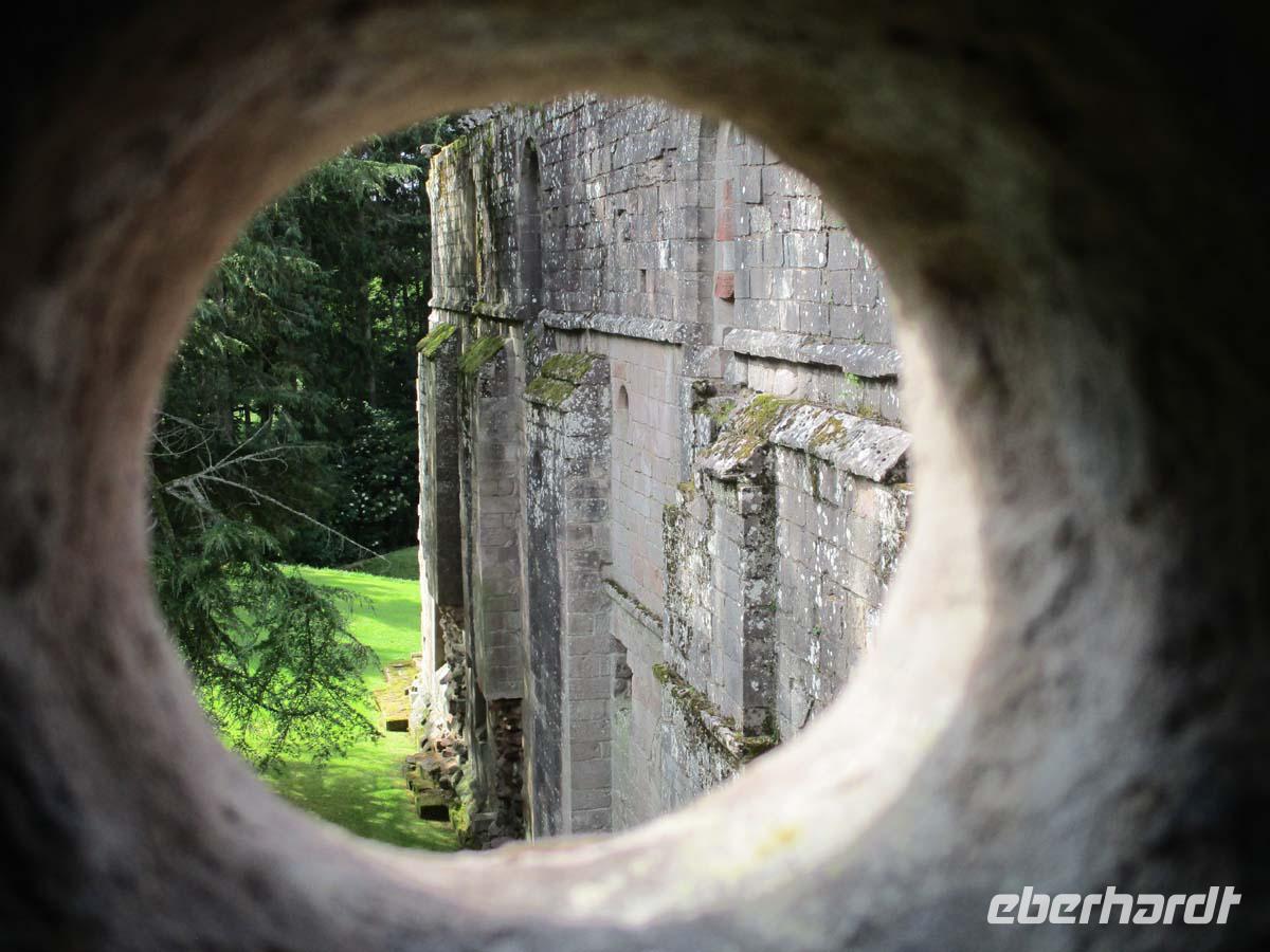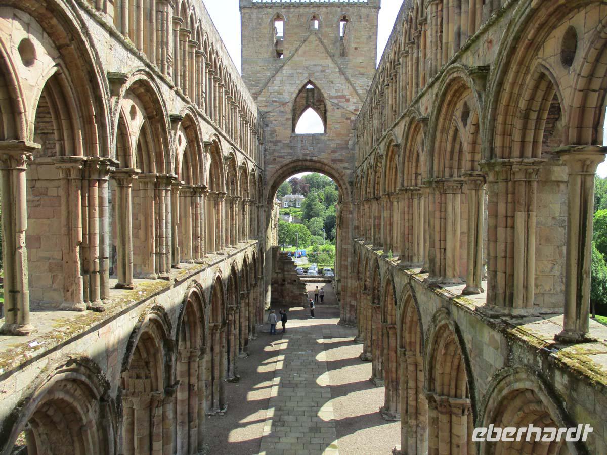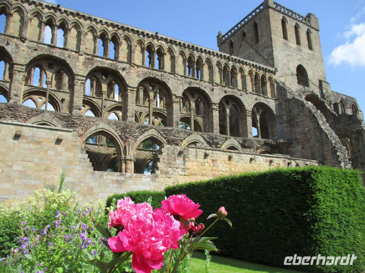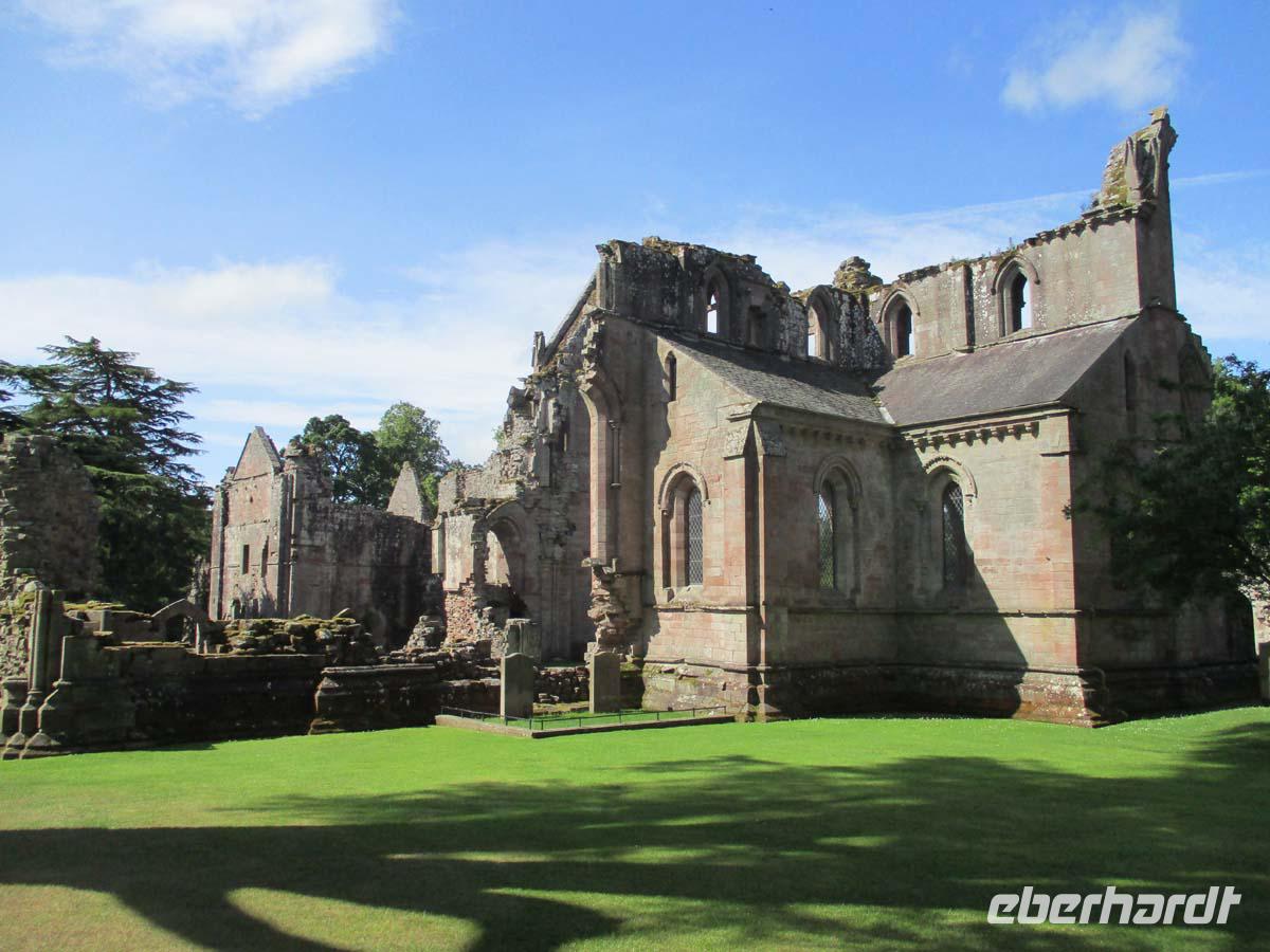Nach dem Frühstück vom Buffet, verabschieden wir uns von den Flugreisegästen und setzen unsere Reise in Richtung Jedburgh fort. Wir besichtigen die uralte Augustinerabtei in Jedburgh, die auch als Ruine noch einen gewaltigen Eindruck bei allen hinterlässt. Ausgegrabene Grundmauern der Klausur und Wirtschaftgebäuden an der Kirche sind hervorragend konserviert.