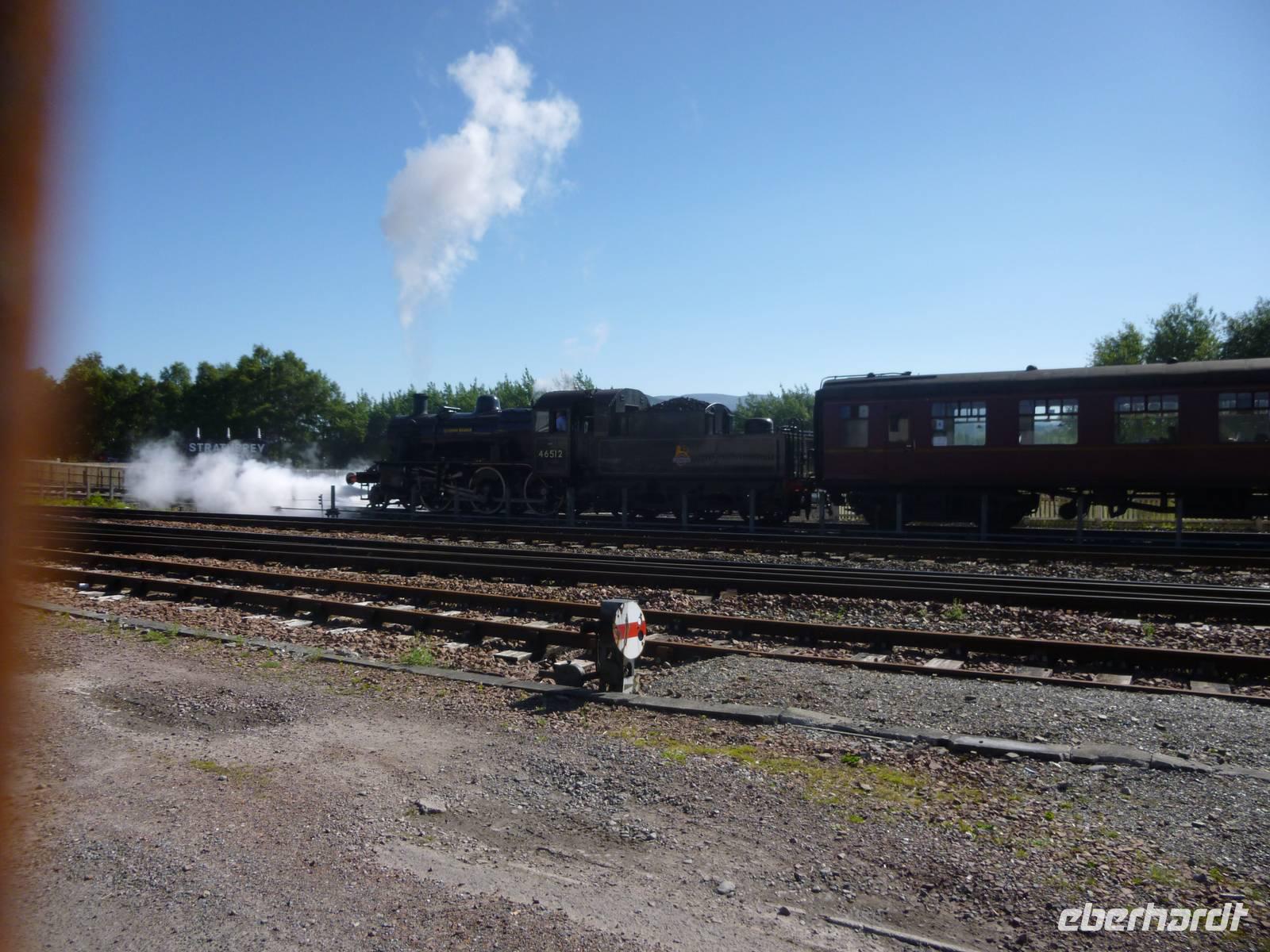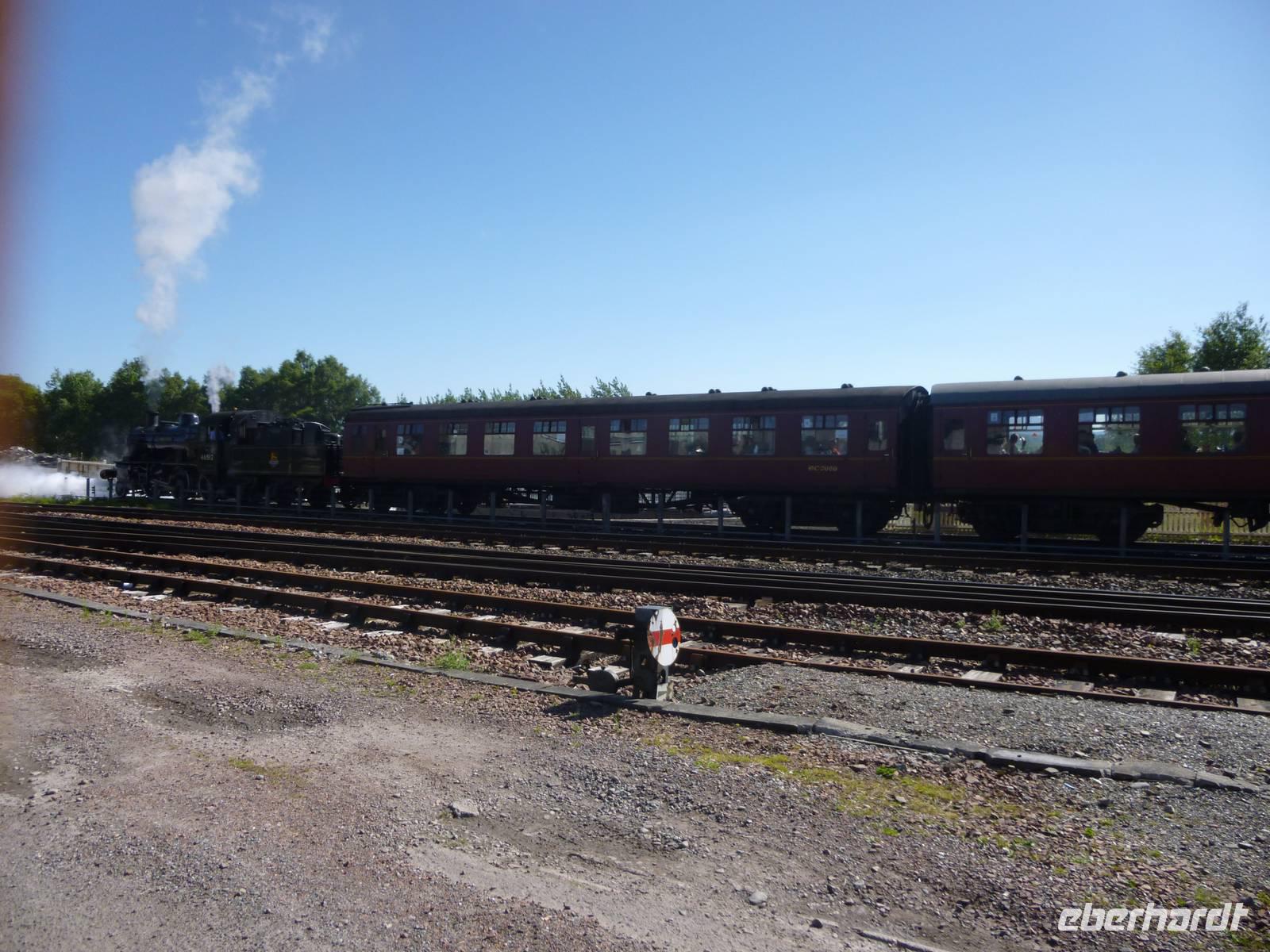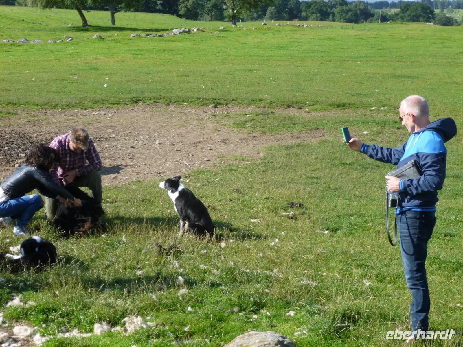 Die Erziehungs-Künste des Schäferpaares bestaunten wir auf einer Wiese, wo die Schäfer- Hunde seit dem ersten Lebensjahr auf Pfiff- und Stimmkommandos eingeübt werden, jedoch in ihrer Kindheit durch Freude ohne Kommandos auswachsen dürfen. So werden sie selbst bewusst und entwickeln das nötige Vertrauen in sich für ihre spätere Arbeit auf der Farm. Hunde-Kleinkinder von 26 Tagen wurden von uns besonders gern gestreichelt und fotografiert. Die Strathspey Steam Railway fotografierten wir direkt am schön mit Blumen geschmückten Bahnhof von Aviemore, bevor wir vorbei fuhren am Corgarff Castle und Schloss Balmoral (wir hatten leider keine Einladung von der dort weilenden Königsfamilie) nach Braemar am Flusse Dee entlang über eine spitzwinklige Brücke, die unser Dieter bravourös meisterte.