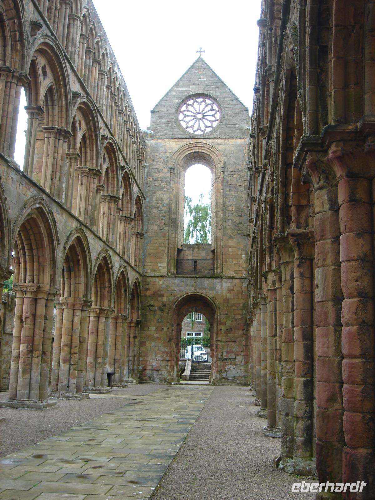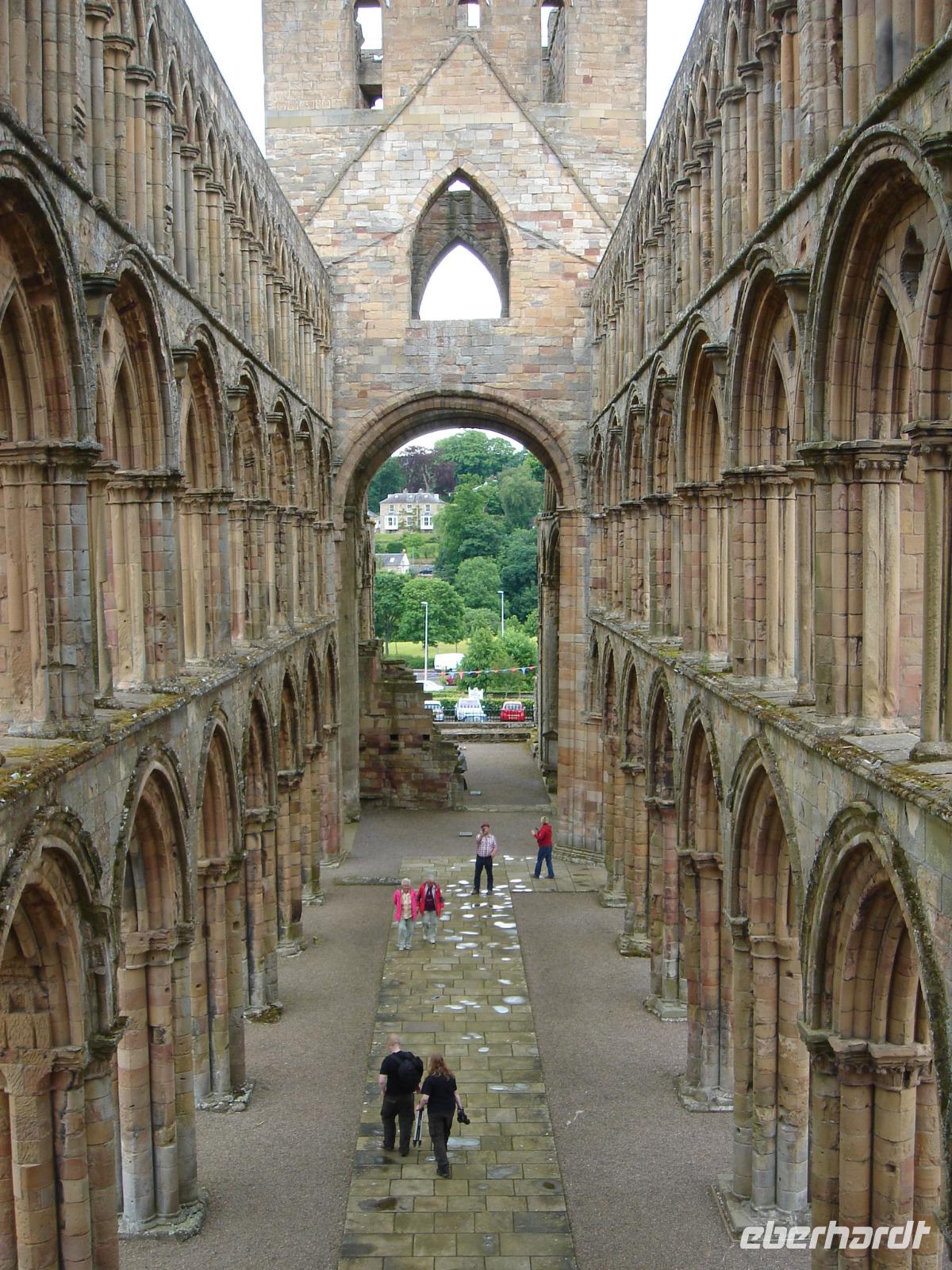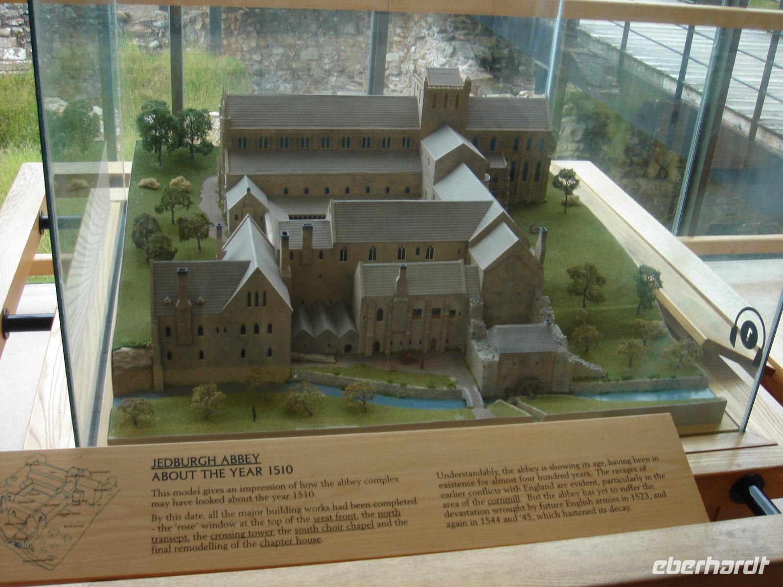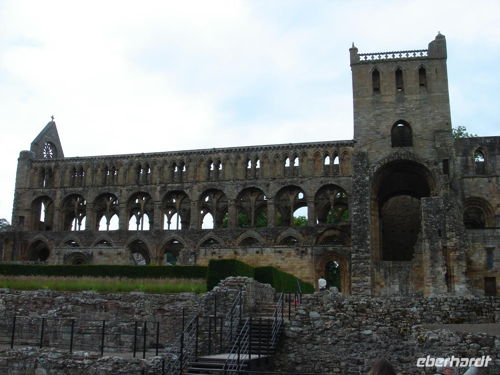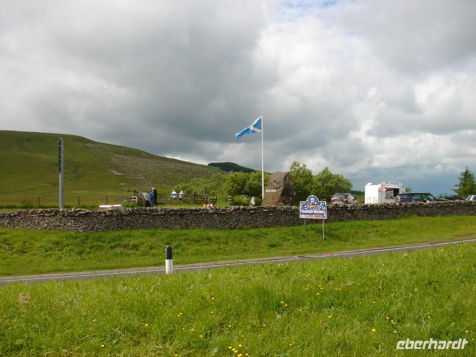 Nach dem Frühstück starteten die Fluggäste per Taxi zum Flughafen, die Busgäste per Bus gen Newcastle. Eine Busfahrt durch interessantes und geschichtsträchtiges Gebiet ohne Stopp wäre langweilig. Stefan organisierte erst einmal einen Zwischenstopp in Jedburgh, wo wir erst die letzten Pfunde in der Jedburgh Woolen Mill ausgaben, dann jenes Haus besichtigten, in dem Maria Stuart 1566 wahrscheinlich den folgenschweren Entschluss fasste, ihren damaligen Ehemann umbringen zu lassen und wieder allein zu regieren. Dies war leider der Anfang ihres Endes, für uns jedoch ein interessanter Ausflug in die Vergangenheit. Dann schauten wir uns noch Jedburgh Abbey an und fuhren weiter zur schottisch-englischen Grenze, wo wir an Carter Bar beim Verzehr unserer Bordküchenwürstchen nahe der englischen Wolken standen. Später ging es weiter nach Newcastle upon Tyne und da am Nachmittag auf die Fähre, wo schon wieder mitteleuropäische Sommerzeit galt, wir also die Uhren gleich um eine Stunde vorstellten. Nach dem Auslaufen der Fähre gab es wieder Abendessen vom großen Buffet und später eine angenehme Überfahrt gen Festland.