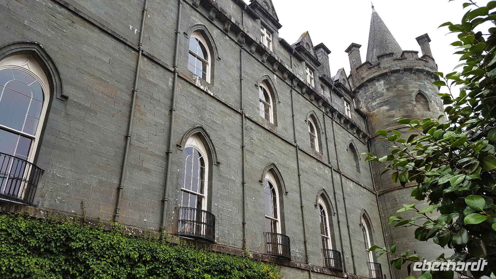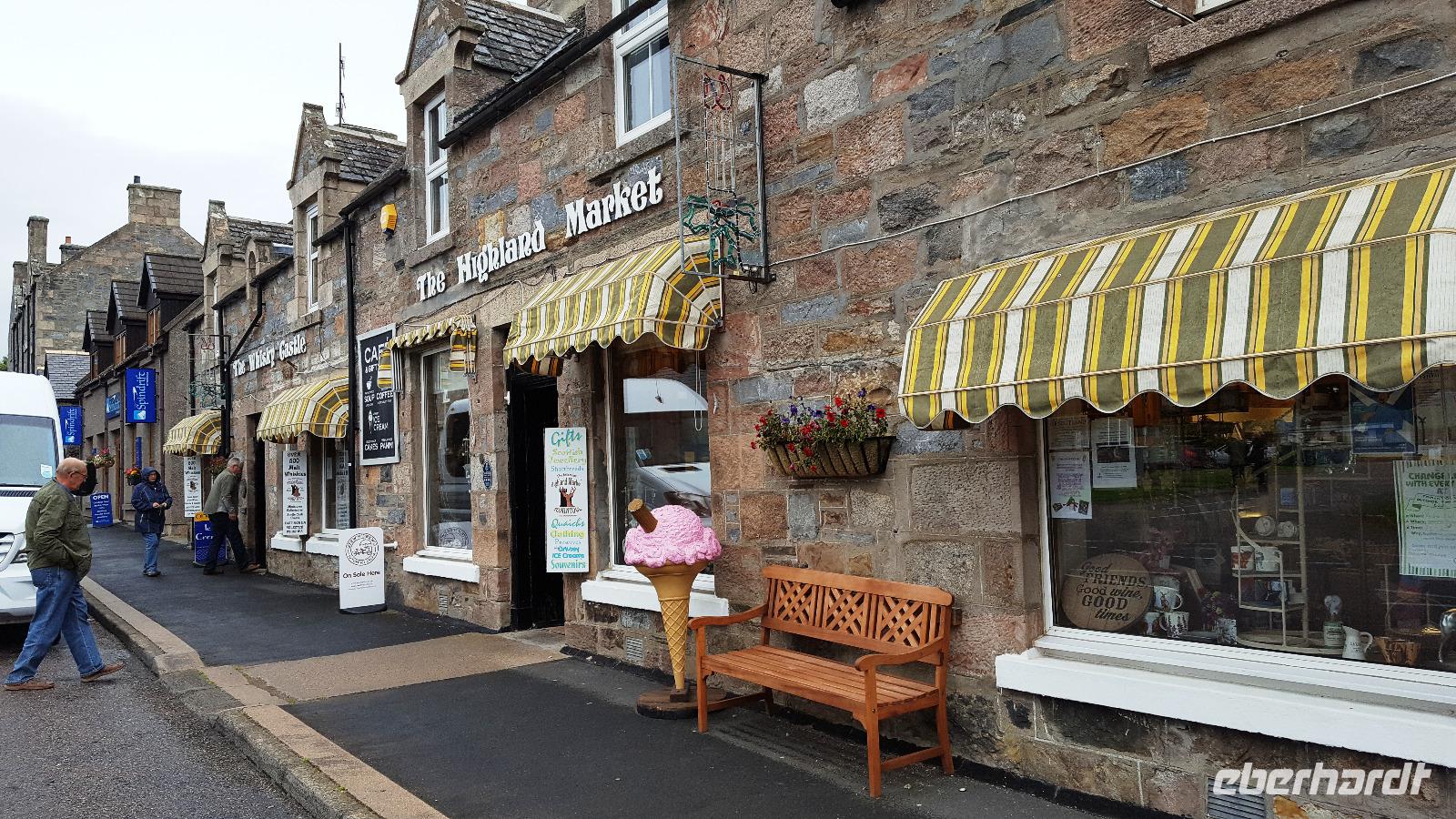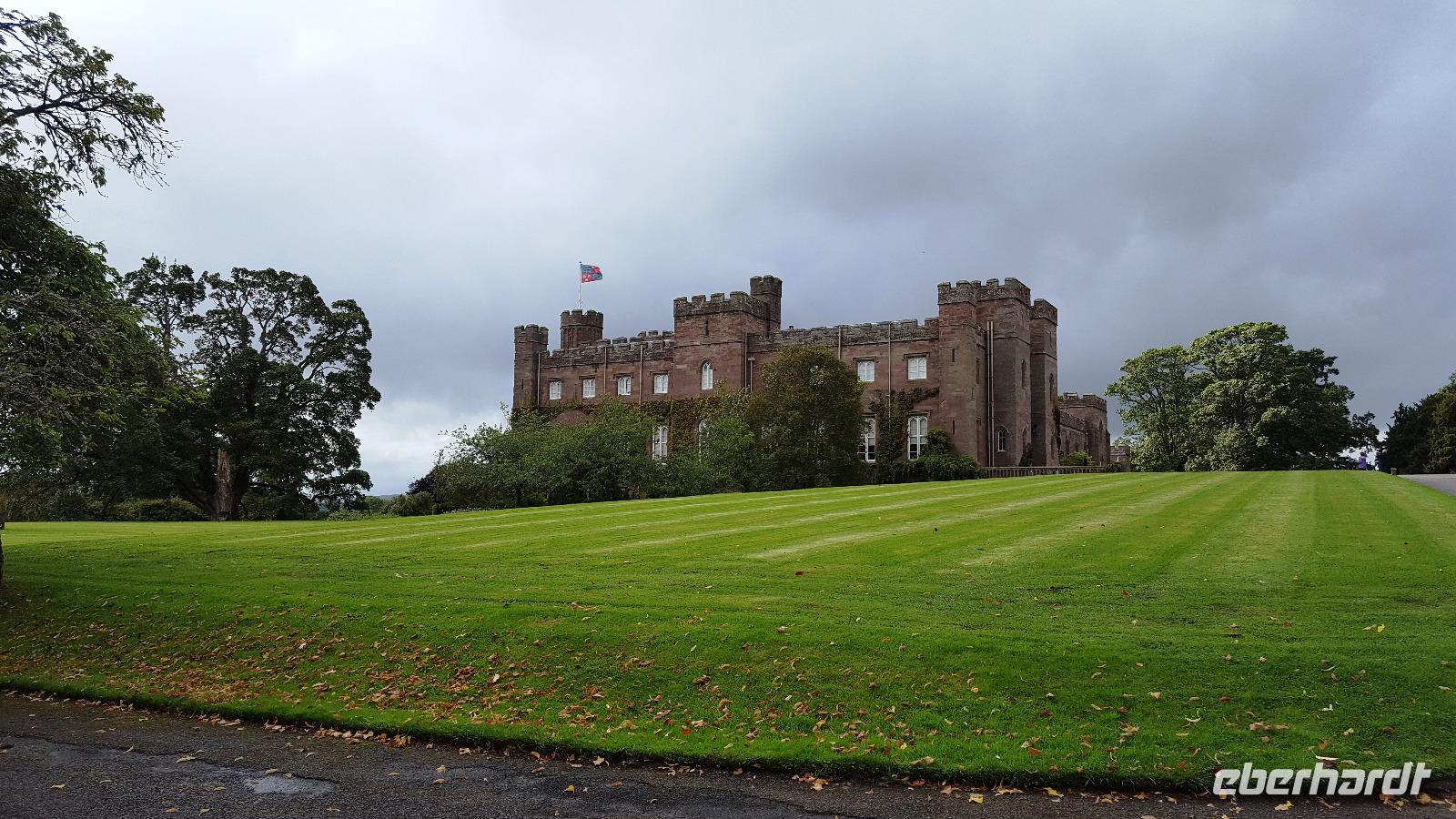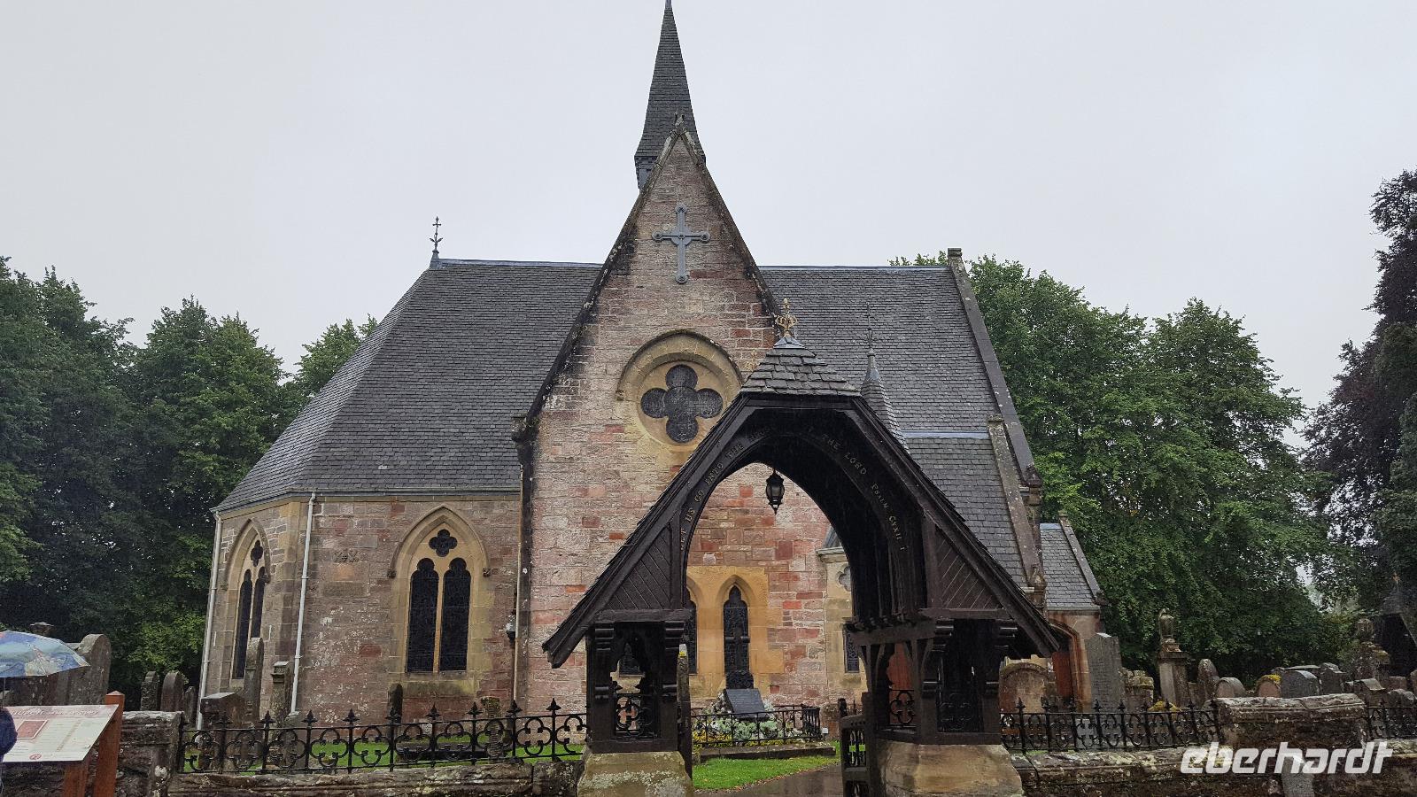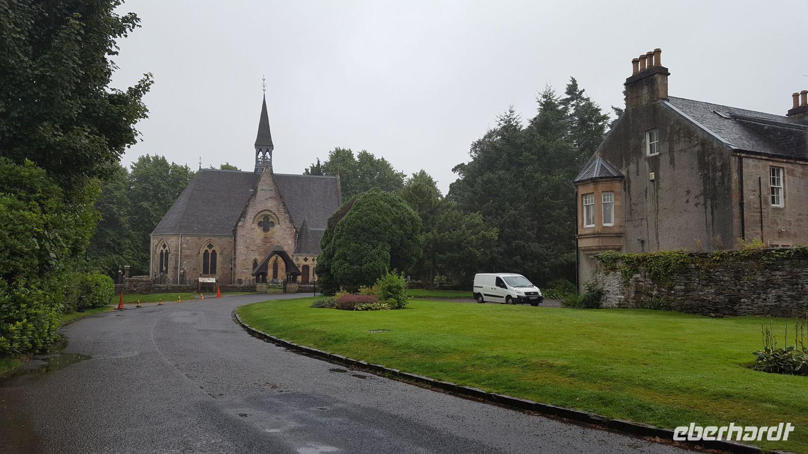 Nach unserem Frühstück verladen wir die Koffer wieder im Bus und brechen auf zu einer Tour durch den Cairngorn Nationalpark. Er ist der größte und zweitjüngste der 15 Nationalparks in Großbritannien. Er ist geprägt durch die Berge der Grampion Mountains, heidebewachsene Berghänge, tiefschwarze Seen, unzugängliche Moore und grüne Wälder. Weite Teile sind verkehrstechnisch nicht erschlossen, das Zentrum des Nationalparks kann nur zu Fuß erreicht werden. Wir folgen der A9 und der A 95 Richtung Aviemore, einem Touristenzentrum am River Spey. Im Glen More weidet die einzige frei lebende Rentierheide Großbritanniens. Weiter geht es auf der A 939. Unser erster Stop ist in Tomintoul. Hier halten wir am berühmten Whisky Castle. Der eine und andere nutzt die Gelegenheit und probiert sich durch die verschiedenen Whiskys. Wir fahren vorbei am Corgarff Castle, leider begleitet uns wieder der Regen. Die A 939 und später die B 976 entpuppen sich als ausgesprochen schmal für unseren Bus, oftmals sind sie nur eine Singletrack Road, also eine Straße, die nur einem Fahrzeug Platz bietet und wo man entgegenkommenden Verkehr an den "passing places" vorbeiläßt. Sie führen durch Ski-Gebiete der Region, steile Bergauffahrten und Bergabfahrten machen die Strecke doppelt interessant. Eine Brücke scheint für unseren Bus zunächst unpassierbar, zu steil Anstieg und Abfahrt, zu kurz die Kuppe- aber unser Busfahrer Thomas gibt alles und lenkt uns sicher darüber. Beifall von allen war dafür selbstverständlich. Ein kurzer Foto-Stop am Balmoral Castle, das um diese Jahreszeit leider geschlossen ist für Besucher, führt uns über den River Dee, der viele Regen macht sich bemerkbar, der Fluß führt entsprechend Wasser. Von hier aus folgen wir der A 93 nach Braemar Castle. Unscheinbar von außen zeigt das ehemalige Jagdschloss im Innern eine beeindruckende Ausstattung. Dann fahren wir für einen Mittagsimbiss in den Ort Braemar. Jeder stärkt sich entweder am Bordservice oder im Ort. Weiter fahren wir Richtung Süden und halten erst wieder in Blairgowrie für einen Service-Stop.