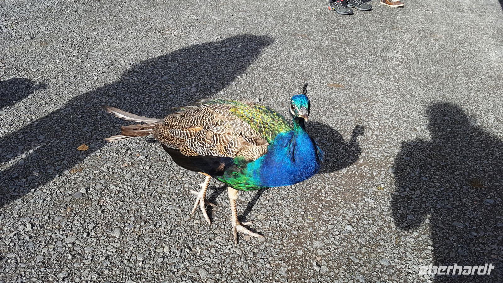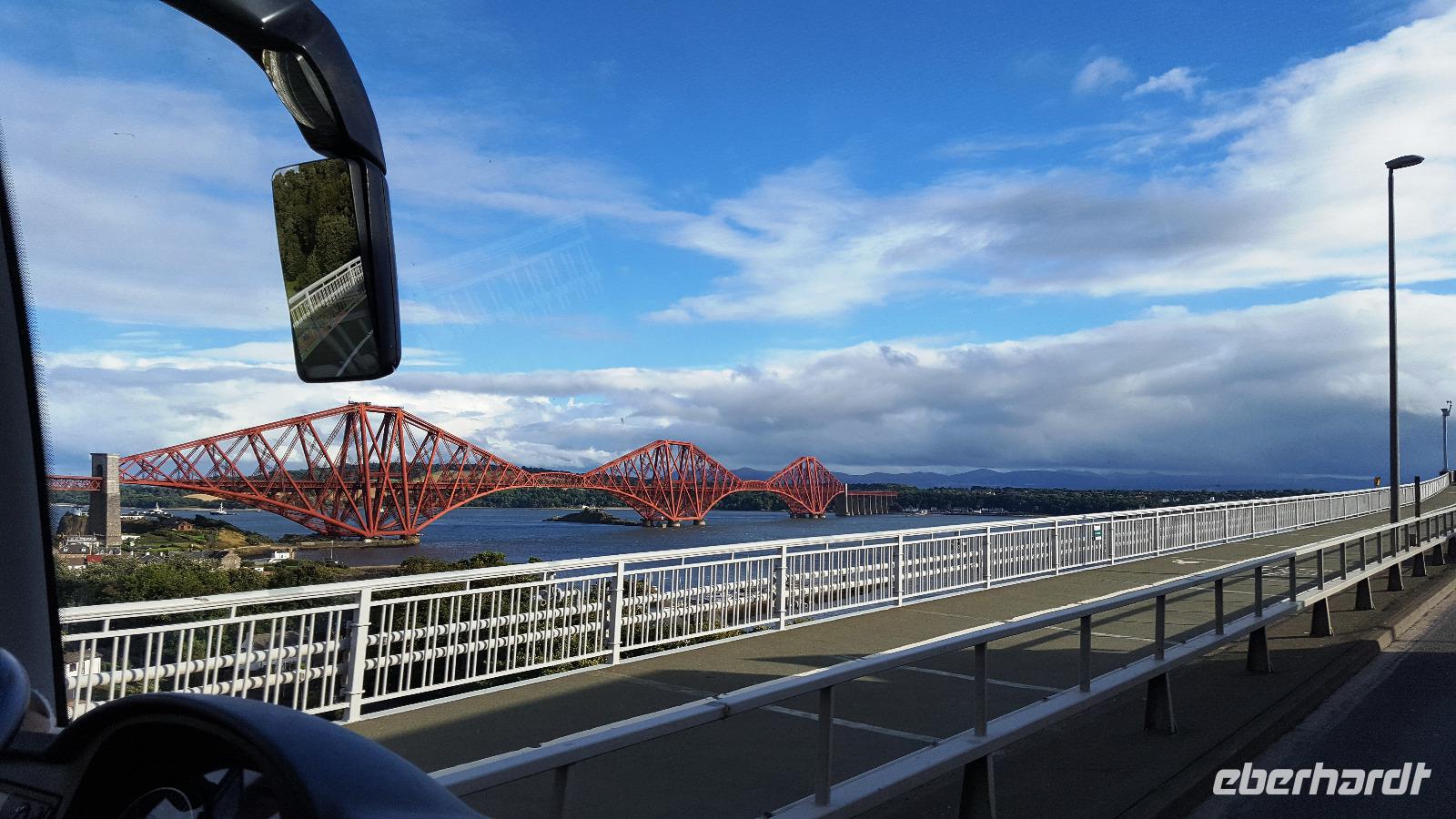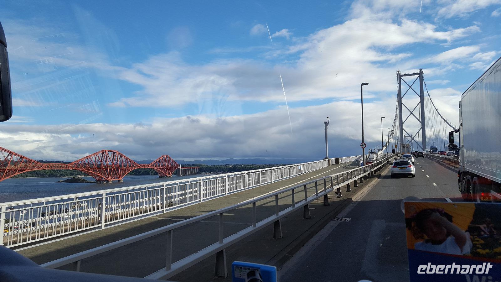 Fast haben wir dann Perth erreicht, statten aber vorher dem Scone Palace einen Besuch ab. Hier wurden fast alle schottischen Könige gekrönt. Der Krönungsstein selber ist heute in der Burg in Edinburgh zu sehen. Am Busparkplatz warten Pfauen auf uns. Sie wissen wohl, dass die Touristen sie gut verpflegen. Sie fressen uns fast aus der Hand. Gegen 17 Uhr endlich fahren wir über die Forth Road Bridge. Die Hängebrücke, die 1964 eröffnet wurde galt als Wunderwerk der Technik und war zur Zeit ihrer Entstehung die längste Hängebrücke Europas. Die Eisenbahnbrücke daneben, die Forth Bridge, wurde 1890 eröffnet und galt damals als ingenieurtechnische Meisterleistung viktorianischer Brückenbaukunst. Sie ist immer noch eine der größten Brücken der Welt, 2500 Meter lang und 110 Meter hoch. Zusammengesetzt wurde sie aus 51000 Tonnen Stahl und 8 Millionen Nieten, die letzte soll aus Gold sein...