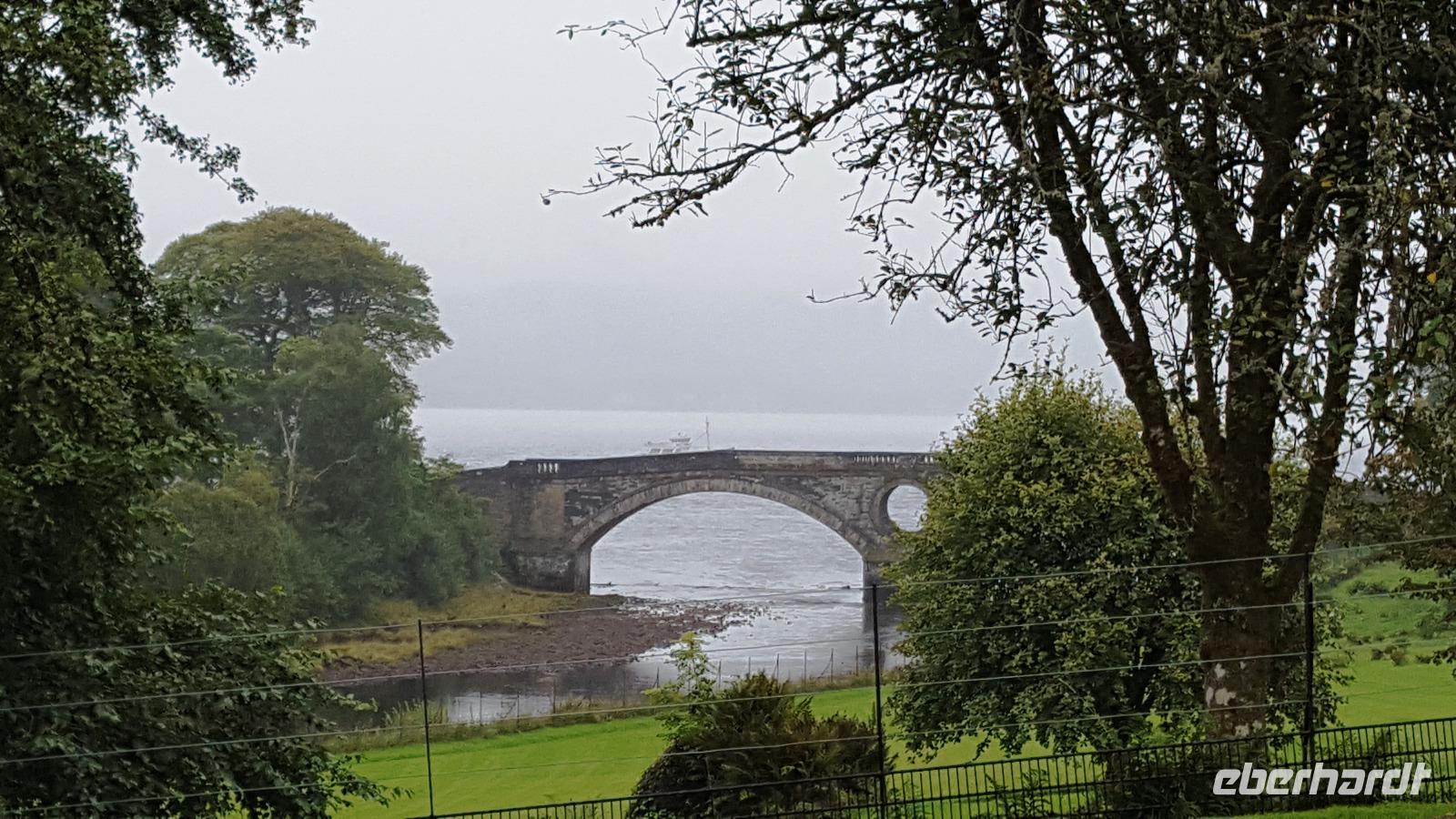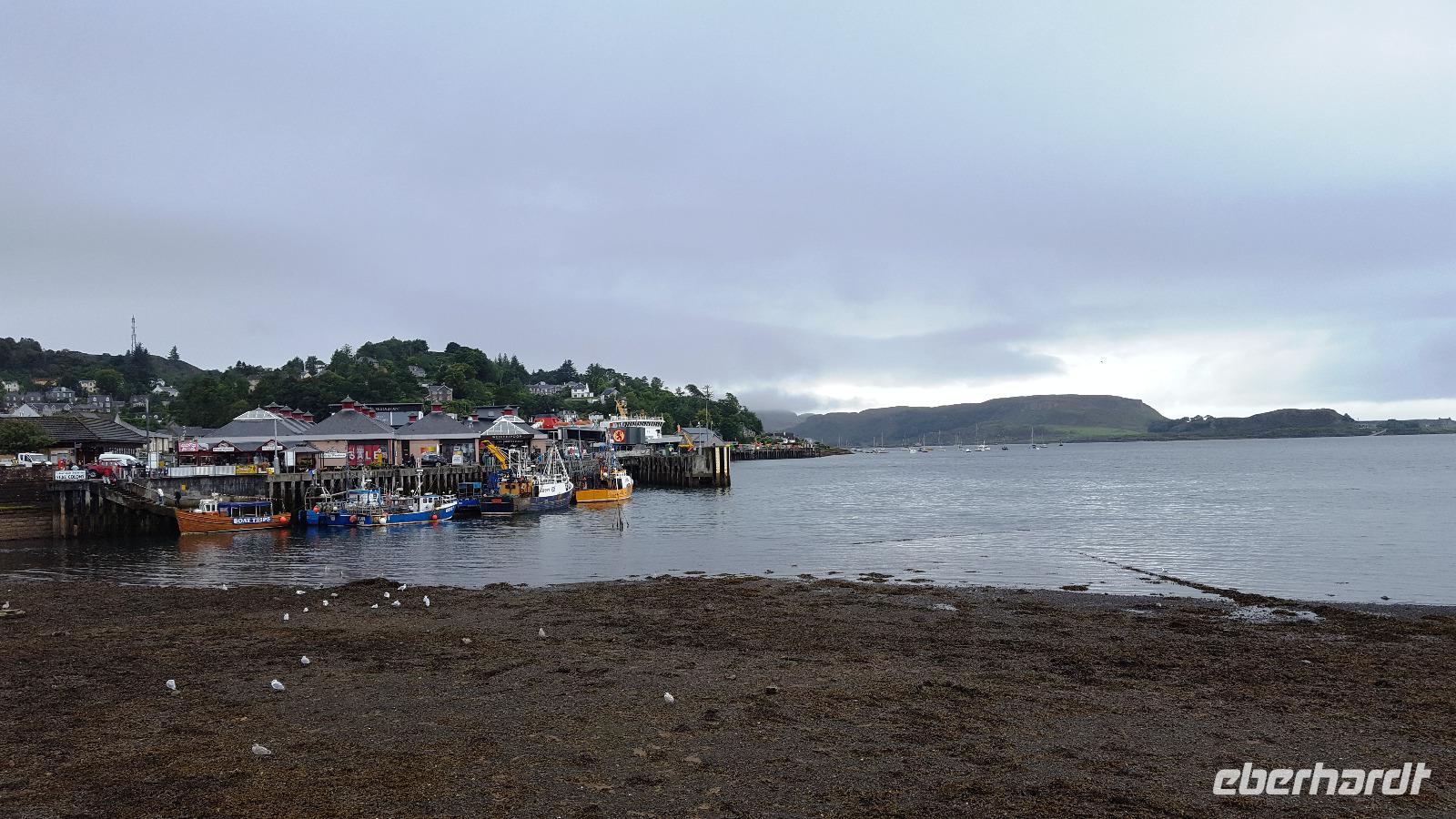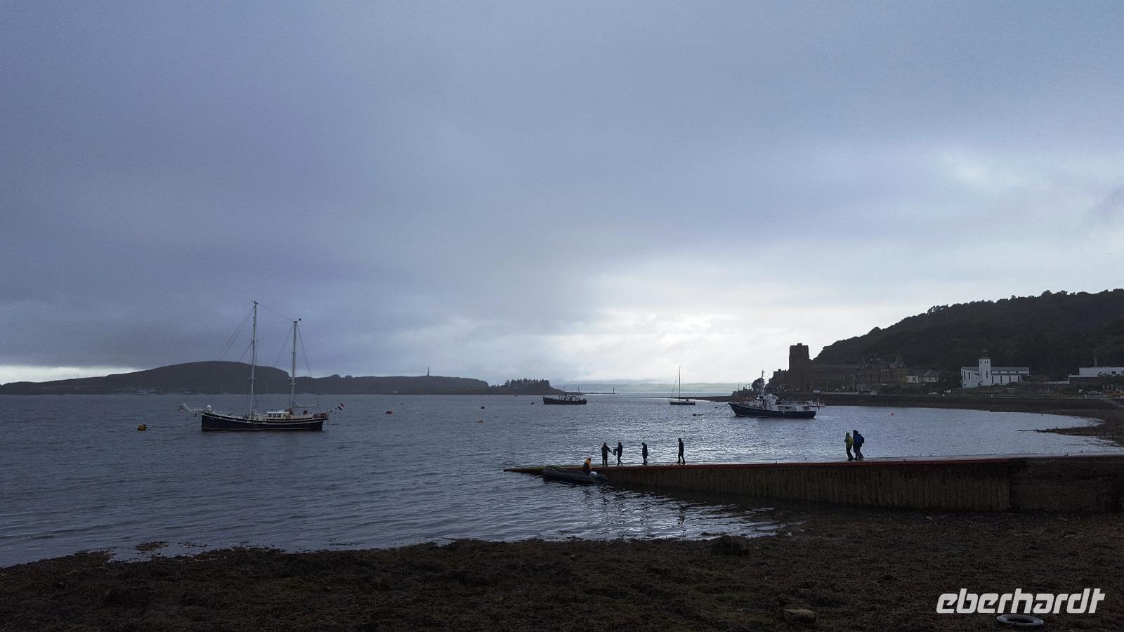 Regen und Niesel begleiteten uns zum Loch Lomond, in Luss, einem kleinen Hafenstädtchen waren dann die Wolken so dicht, dass wir nicht einmal die gegenüberliegenden Berge sehen konnten. Bei Tarbet verpaßten wir auch noch die richtige Abfahrt zur A 83 und mußten ein Stück zurück fahren- gar nicht so leicht, wenn die Straße schmal ist, rechts und links Mauern sind und ständig Busse und LkW entgegenkommen. Aber Thomas meisterte das super und so erreichten wir auf der A 83 den Rastplatz "Rest & be thankvoll". Immernoch verhinderten tiefhängende Regenwolken den Blick auf die Berge, verzauberten aber alles mit einem mystischen Schleier. Weiter auf der A 83 kamen wir nach Inverary. Dort besuchten wir zuerst das Castle und nach einem ausgiebigen Fotostop ging es weiter in den Ort, der als erster direkt am Reißbrett geplant wurde und zeitgleich mit dem Castle wieder aufgebaut wurde. Und hier ließ sich tatsächlich auch zum ersten Mal die Sonne blicken. Weiter ging die Fahrt auf der A 85 nach Oban, einem einstigen Fischerdorf an der Westküste, dem Tor zu den Inseln. Ausgerüstet mit Stadtplänen konnte jeder individuell die Stadt erkunden, den Hafen mit den Fähranlegestellen- keine andere Stadt hat so viele Fährverbindungen wie Oban- oder auch den Nachbau des römischen Kolosseums, der leider unvollendet blieb und von manchen Einheimischen McCaigs Folly- McCaigs Torheit- genannt wird. Trotzdem sollte sich McCaigs Bau bald als Wahrzeichen der Stadt Oban herausstellen.