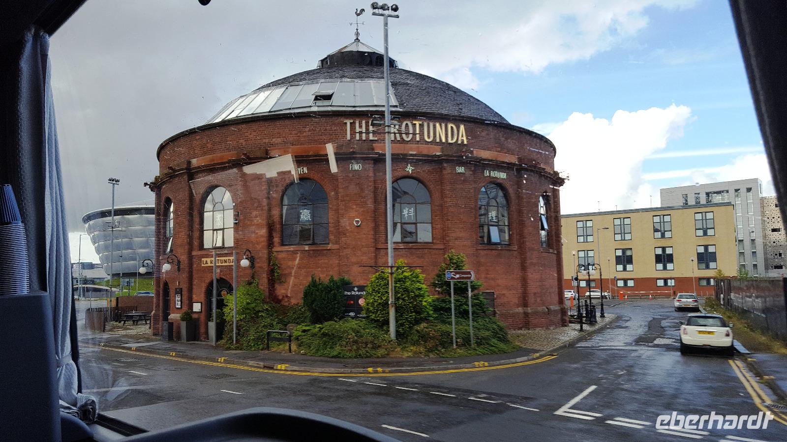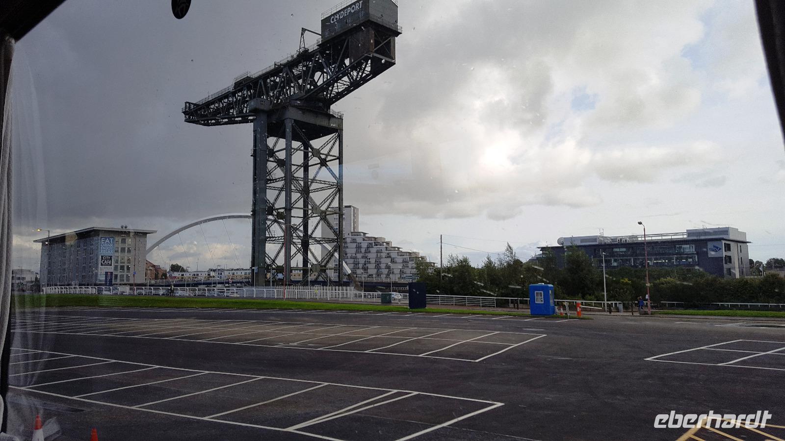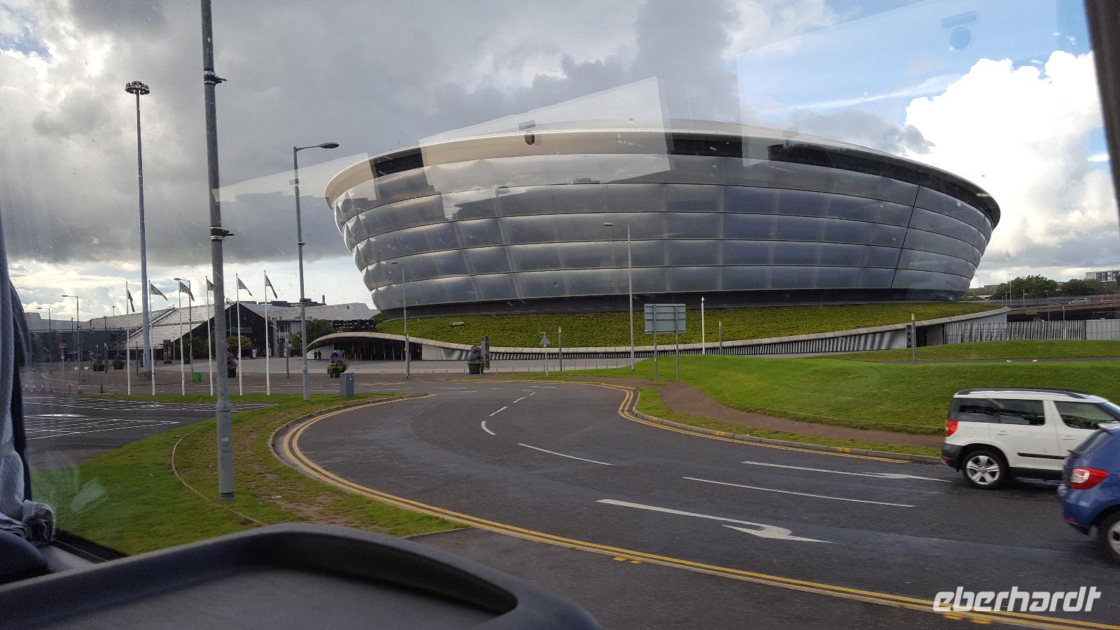 Nach einem ausgiebigen Bummel ging es weiter über die M74, leider mit etlichen Baustellen, so dass wir unser Hotel in Glasgow erst mit einer Stunde Verspätung erreichten. Wir begrüßten also rasch unsere Fluggäste und los ging es mit unserem Guide Gordon Fraser, die Stadt zu entdecken. In Glasgow fand an diesem Sonntag ein Radrennen statt- nicht gut für uns, denn da Stadtzentrum war weiträumig abgesperrt. Trotzdem konnten wir die Universität sehen, am Hafen die neuen Gebäude, die die Glasgower liebevoll ihr "Gürteltier" oder ihre "fliegende Untertasse" nannten. Zurück am Pond Hotel (benannt nach dem Teich neben dem Hotel) konnten wir kurz ausruhen, bis wir um 19:30 Uhr gemeinsam unser Abendessen einnahmen.