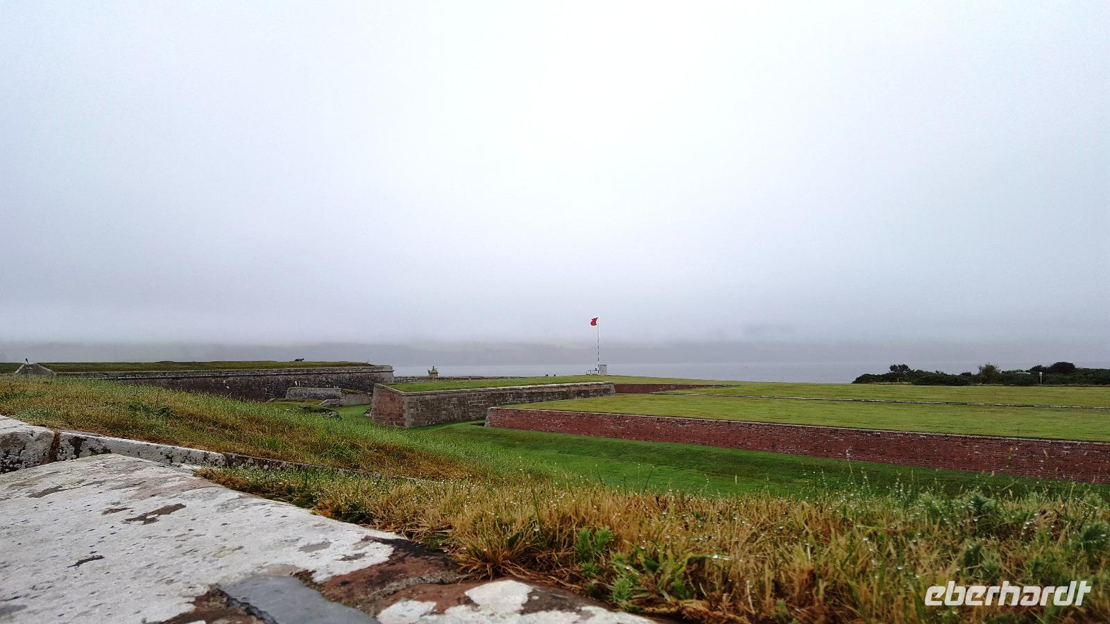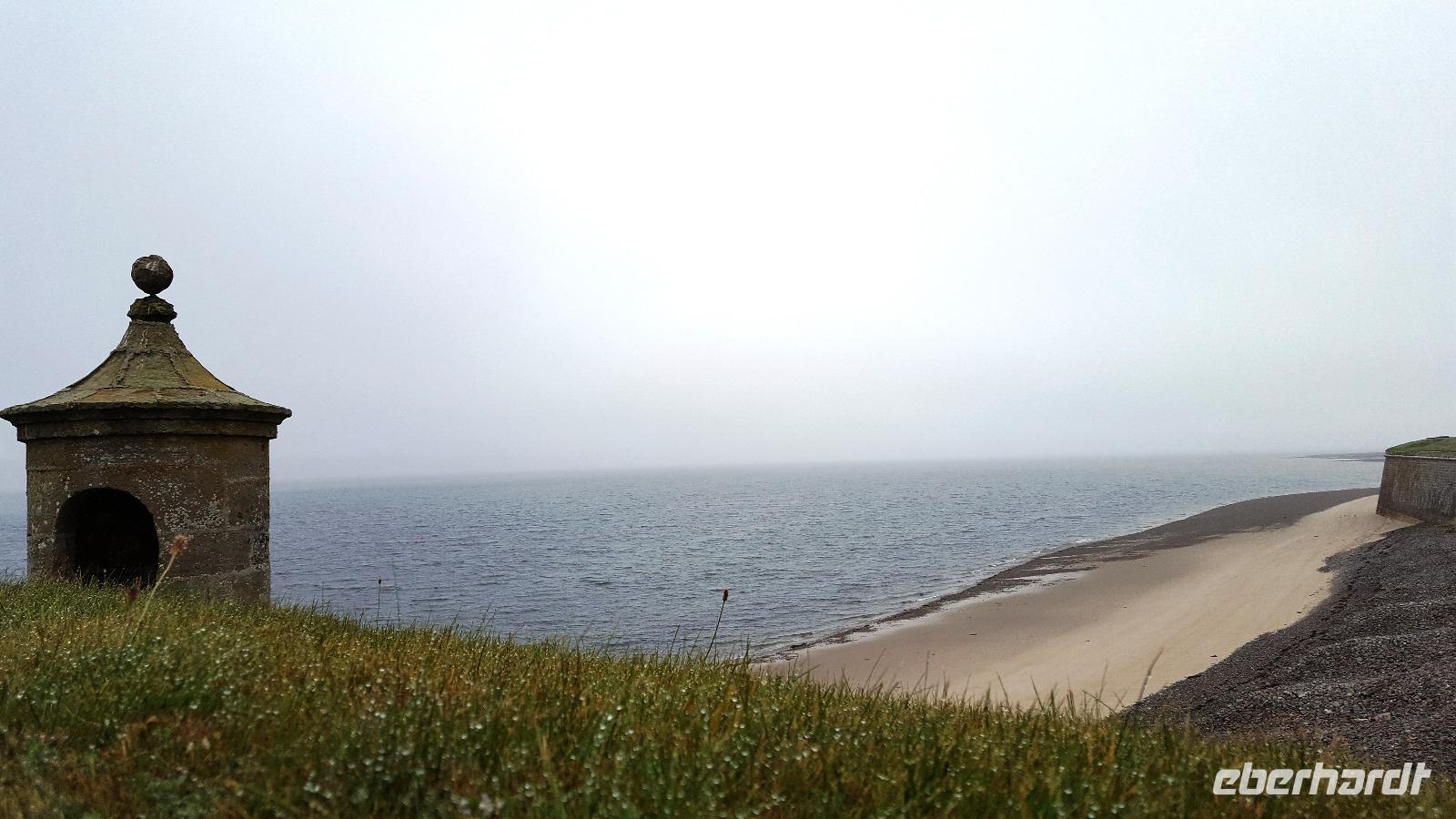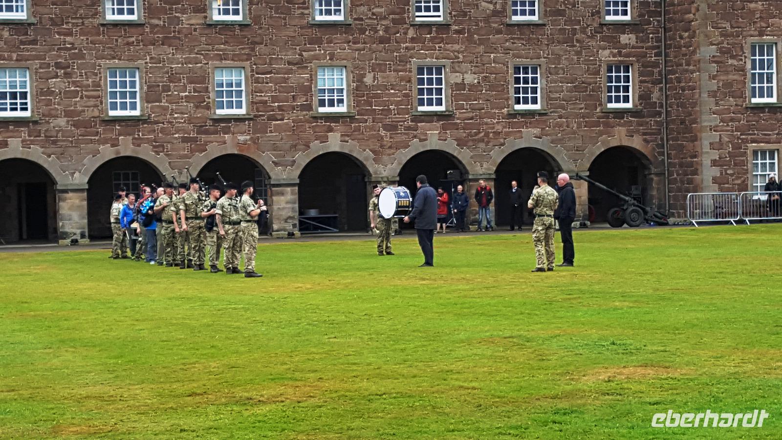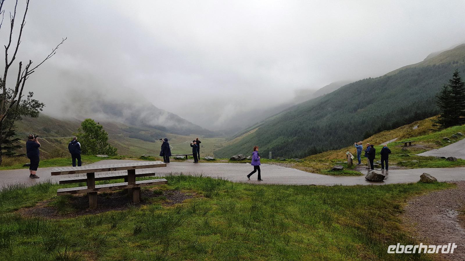 Ausgerüstet mit einem Audio-Guide hatte jeder die Möglichkeit, die Anlage kennenzulernen. Leider spielte das Wetter nicht mit und die Küste gegenüber verschwand in Regenwolken, welche dann auch mit permanentem Niesel ziemlich nervten. Auf dem großen Paradeplatz konnten wir zusehen, wie für ein Tattoo am Wochenende geübt wurde. Wettermäßig ähnlich schaute es auf dem weiterem Weg aus. Am Culloden Schlachtfeld, wo die Jakobiten entscheidend geschlagen wurden, machten wir kurz Rast, der Nebel ließ aber keinerlei Aussicht oder Ausblick zu.