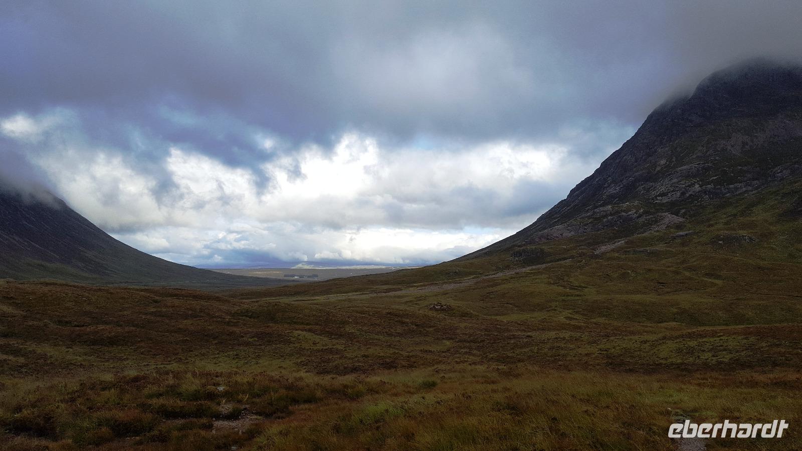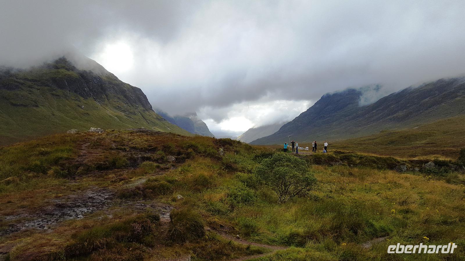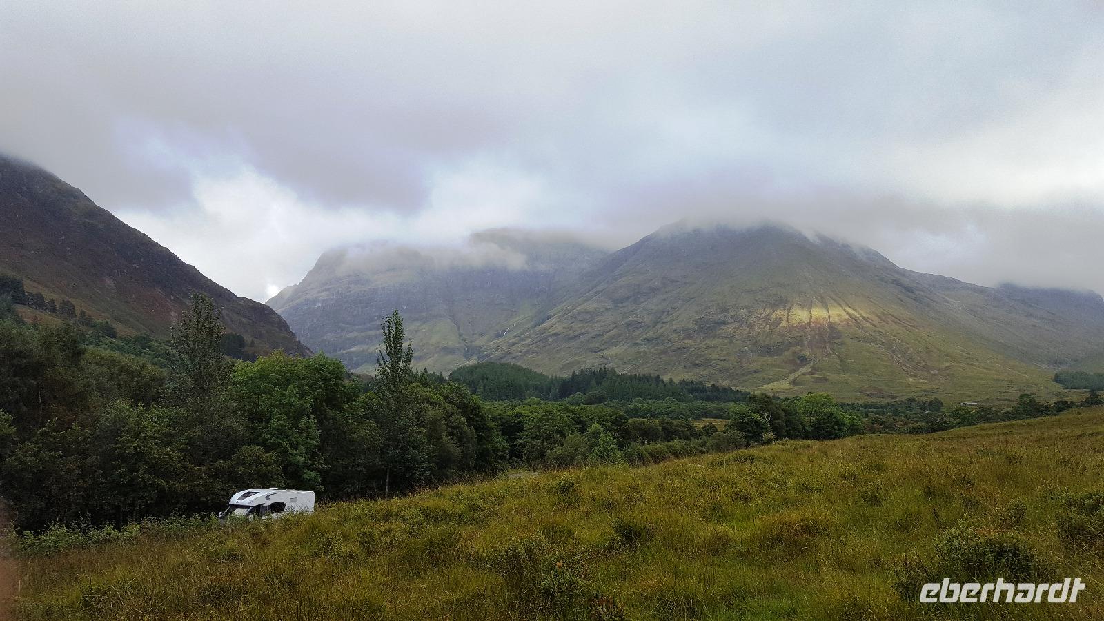 Von Oban aus starteten wir ins Glen Coe, dem berühmten Tal der Tränen. Am Besucherzentrum öffnete sich das Tal und die Regenwolken gaben einen ersten Blick auf die Berge ringsherum frei. Überwältigend. Die Geschichte des Tales war daher um so düsterer. Eines der höchsten Güter der Schotten ausnutzend- die Gastfreundschaft- ermordeten hier Mitglieder des Campbell-Clan auf Befehl des Königs die McDonalds. Alle unter 70 -jährigen wurden ermordet, der Ort ging in Flammen auf und wer in die Berge flüchten konnte, erfror oder verhungerte. Aus dieser Zeit stammt das Wort "Never trust a Campbell" - vertraue niemals einem Campbell.