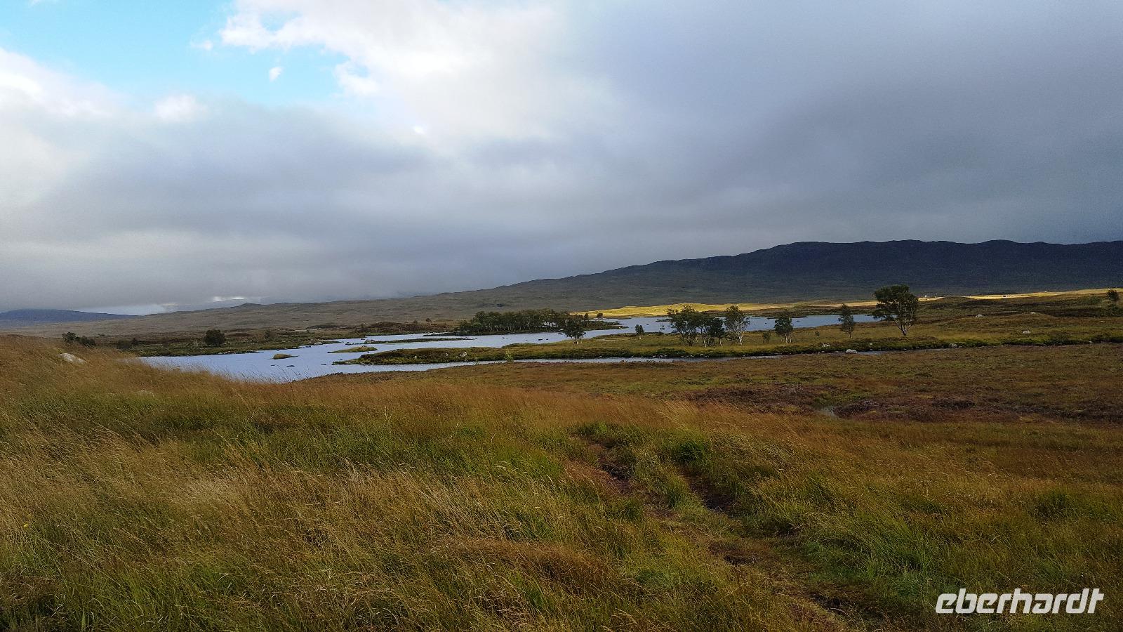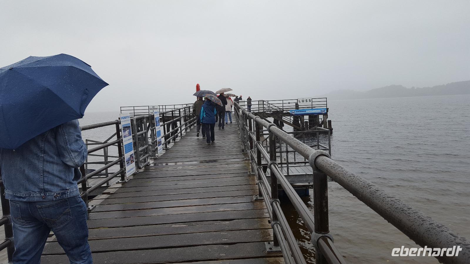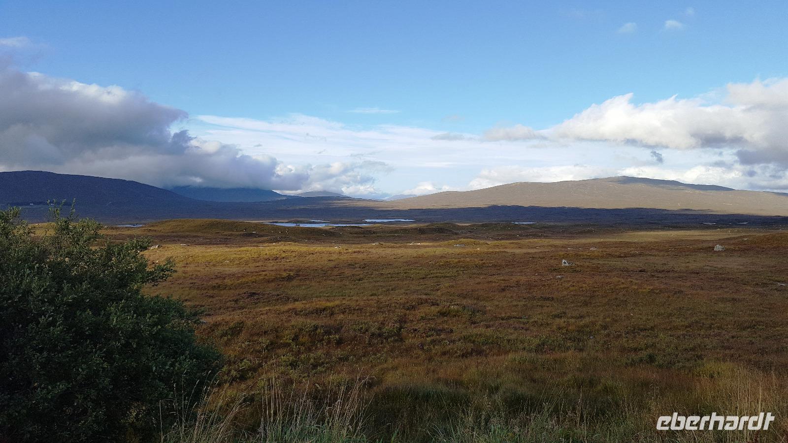 Am Ausgang des Tales erreichten wir das Rannoch Moor. Bei einem kurzen Ausstieg konnte jeder das Federn unter den Füßen spüren, weites, einsames Land ringsumher, nur gekreuzt von unserer Straße, der Eisenbahnverbindung und dem Wanderweg, der von Glasgow nach Fort William führt. Hier hatte sich auch die Sonne endgültig durchgekämpft und auf der Rückfahrt hielten wir nochmals am Loch Lomond, der sich hier in aller Schönheit präsentierte.