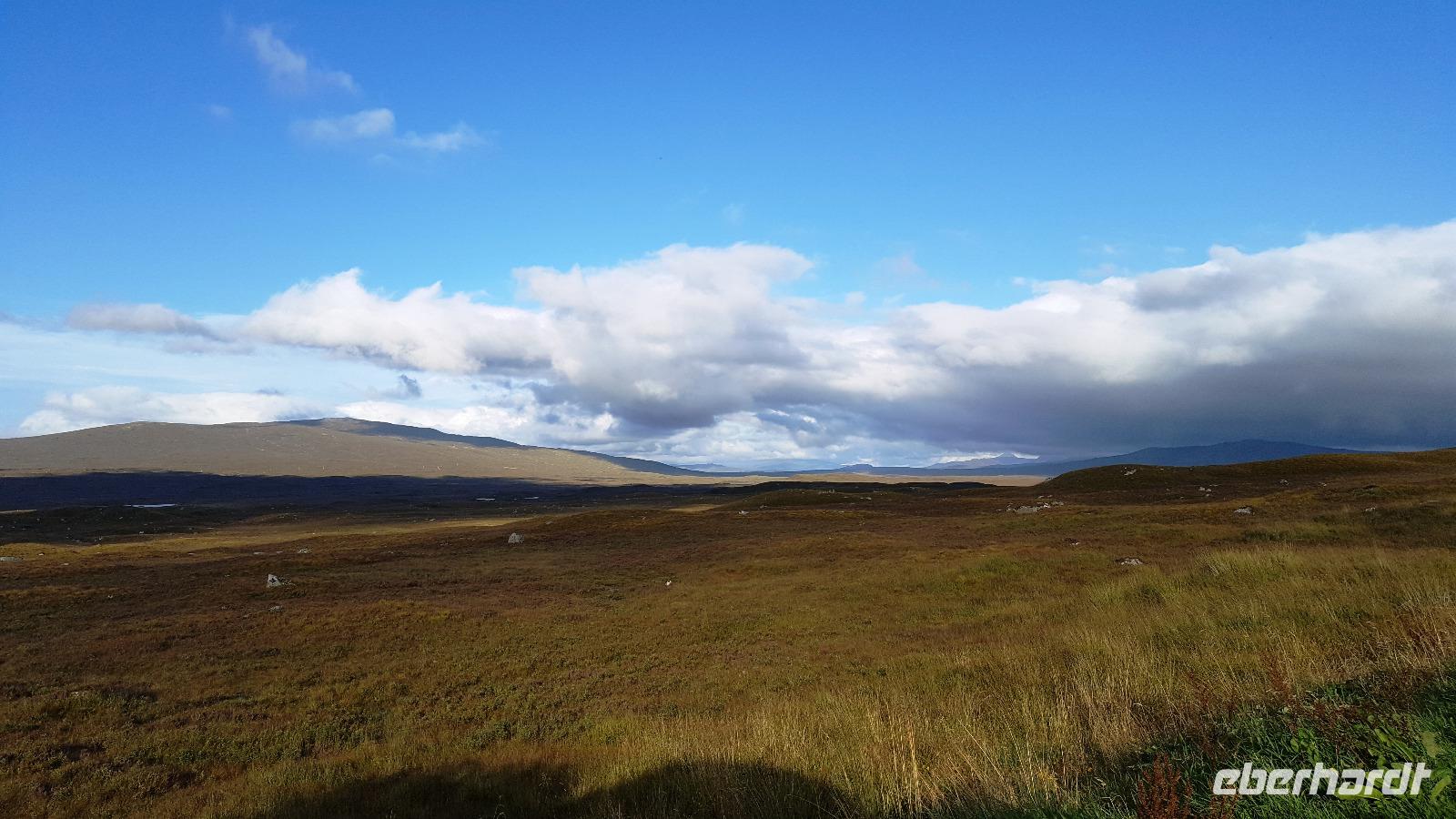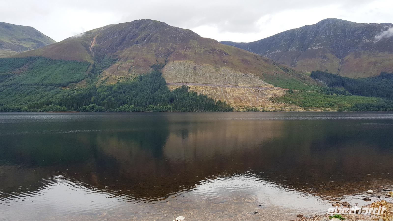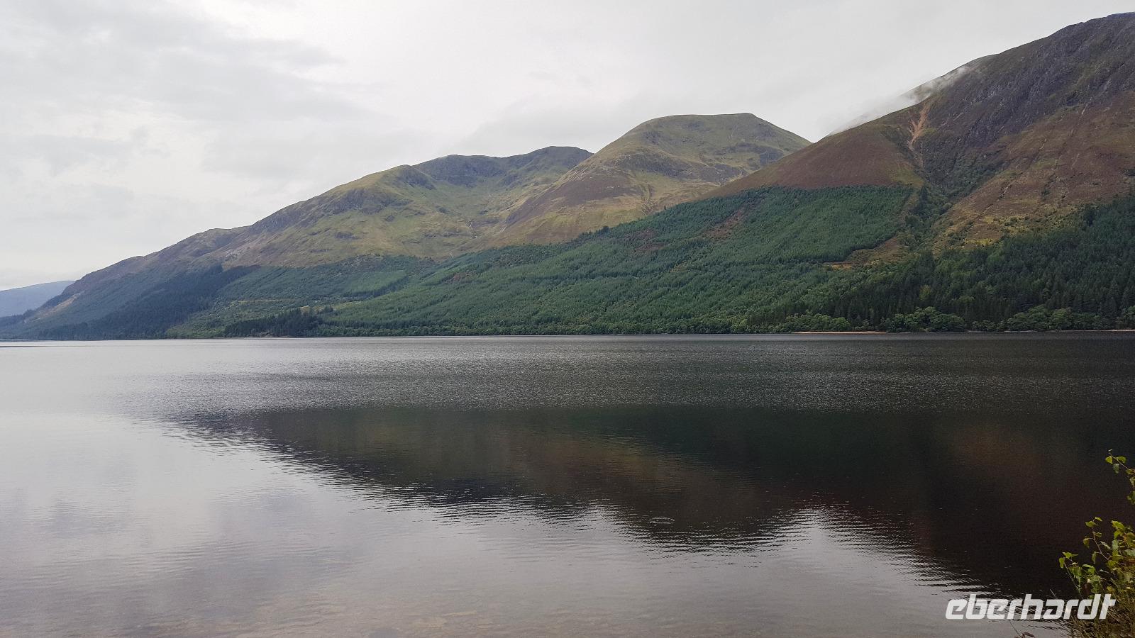 Am Ausgang des Tales erreichten wir das Rannoch Moor. Bei einem kurzen Ausstieg konnte jeder das Federn unter den Füßen spüren, weites, einsames Land ringsumher, nur gekreuzt von unserer Straße, der Eisenbahnverbindung und dem Wanderweg, der von Glasgow nach Fort William führt. Hier hatte sich auch die Sonne endgültig durchgekämpft und auf der Rückfahrt hielten wir nochmals am Loch Lomond, der sich hier in aller Schönheit präsentierte.