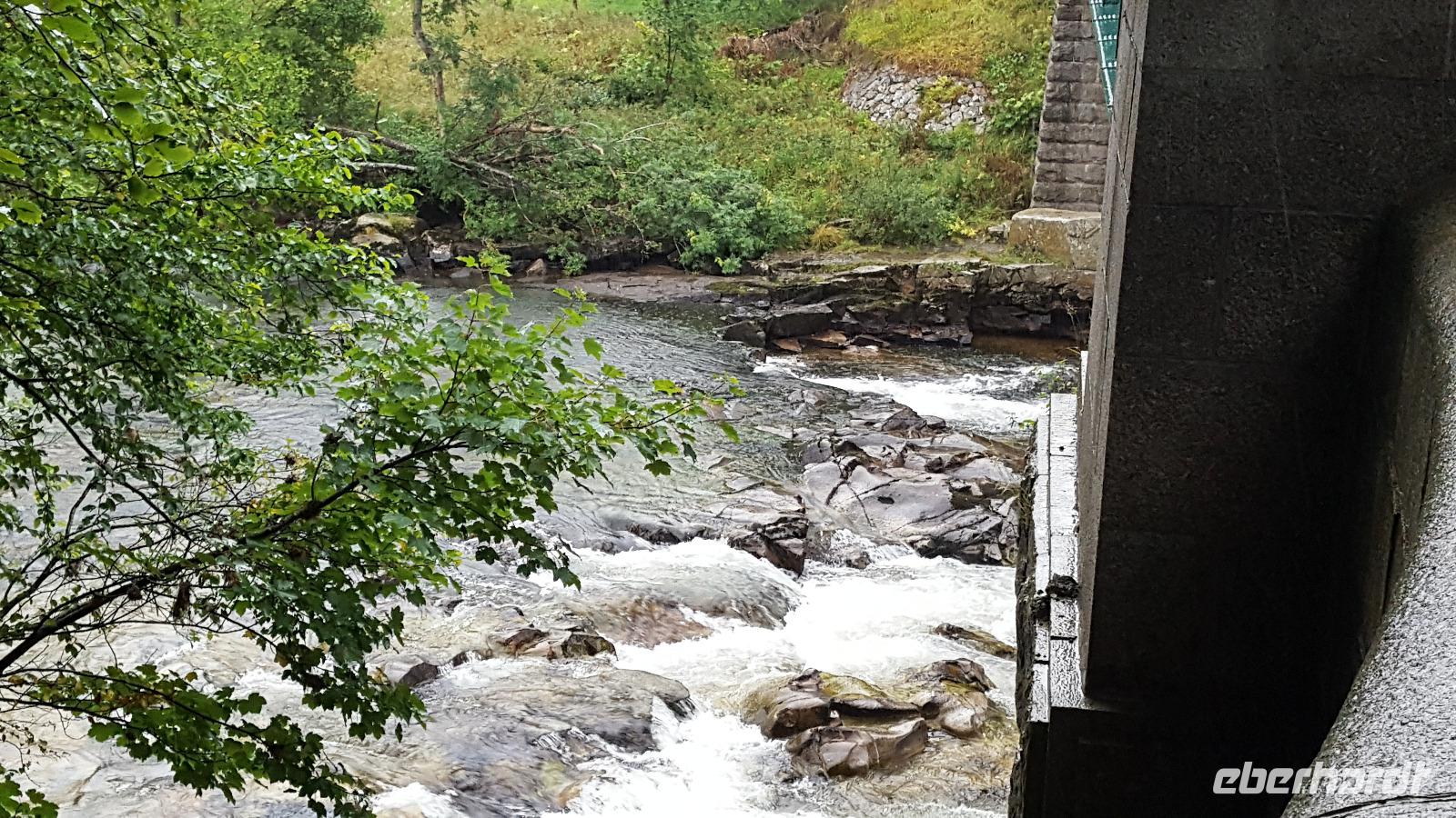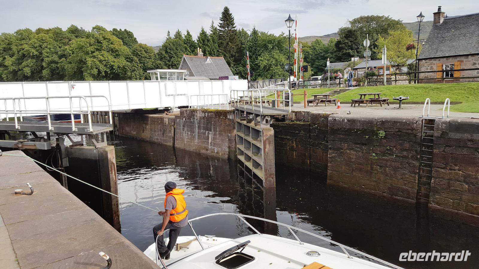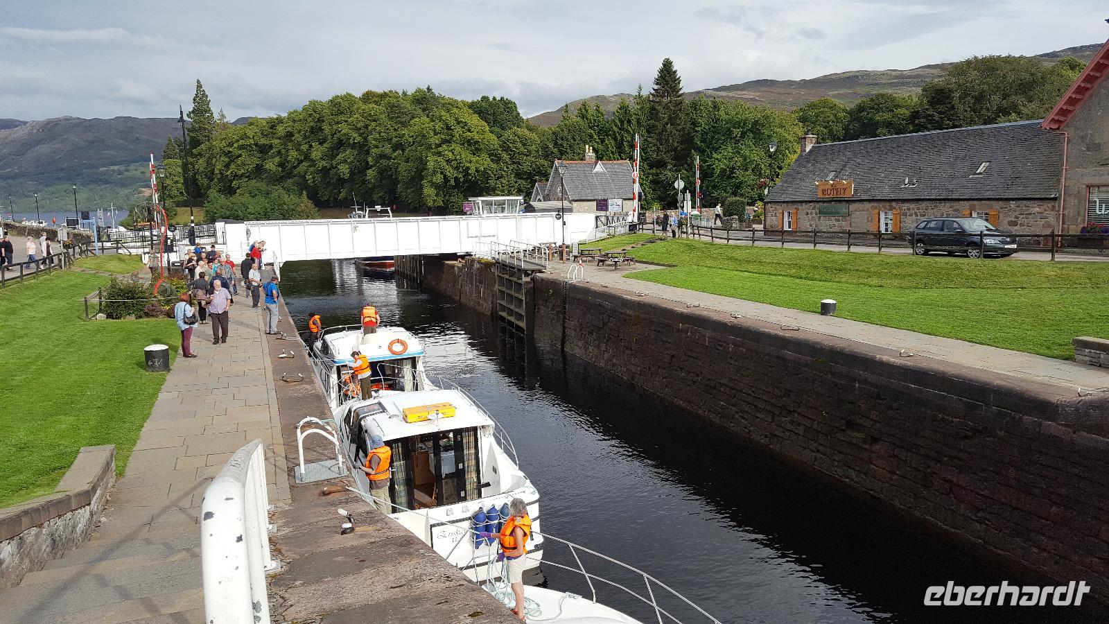 Danach machten wir einen kleinen Abstecher nach Drumnadrochit, ein Fotostop am Loch Ness Exhibition Center ermöglichte einen Aufnahme von Nessie, die wir ja auf der Bootsfahrt vergeblich gesucht hatten. Weiter ging es nach Fort Augustus. Die Schleusentreppe dort hat 5 Stufen und ist Teil des Kaledonischen Kanals, der Verbindung der Ost- zur Westküste. Insgesamt 29 Stufen gleichen hier die Höhenunterschiede zwischen den einzelnen Lochs (Seen) aus. Gerade noch können wir den letzten Schleusengang für heute beobachten.
