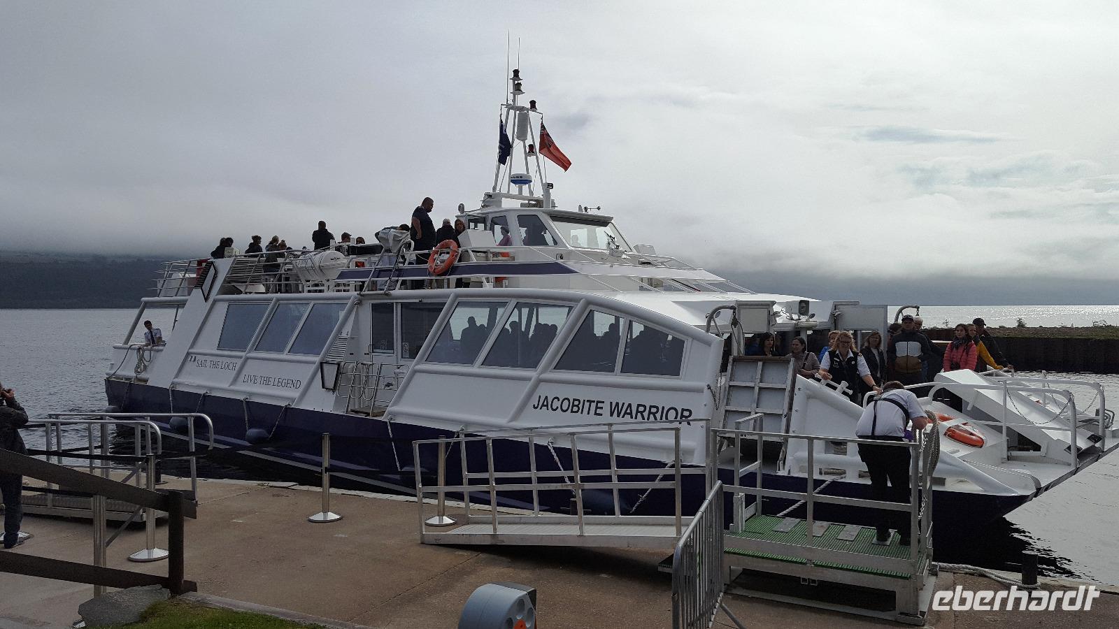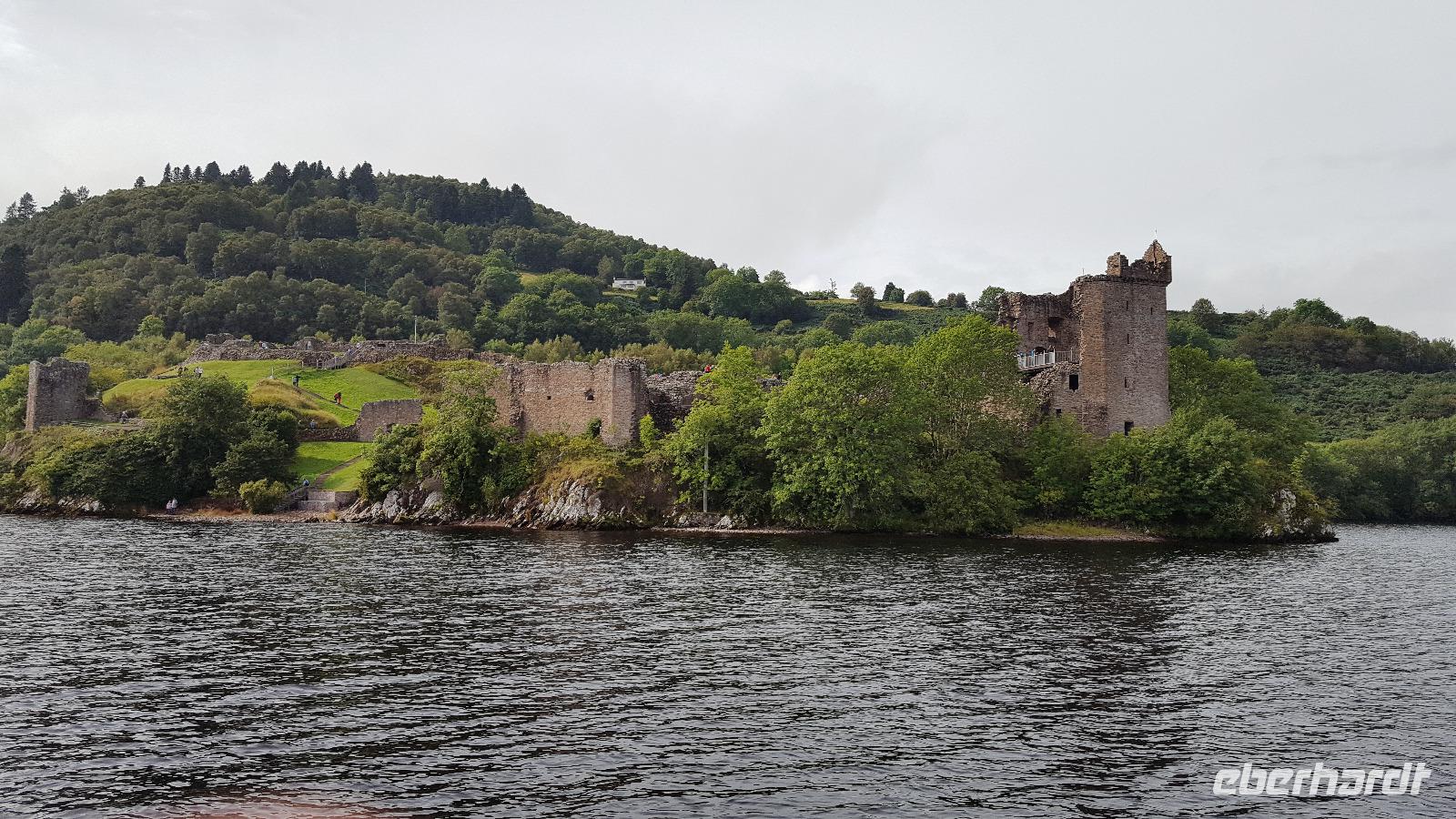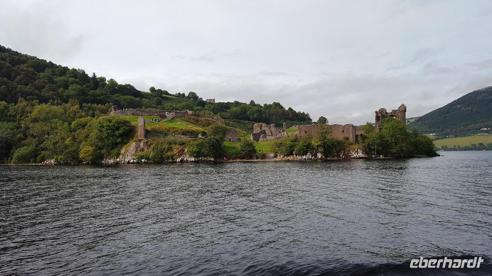 So fuhren wir weiter zum Loch Ness. Erst hier riss die Wolkendecke auf und als wir an Bord unseres Schiffes gingen schien endlich auch die Sonne. So genossen wir die Fahrt bis zum Urqhart Castle auf dem oberen Deck. Auf Urqhart Castle machte uns ein Film mit der Geschichte vertraut, unübertroffen dann der Ausblick nach dem Film, als der Vorhang zu Seite