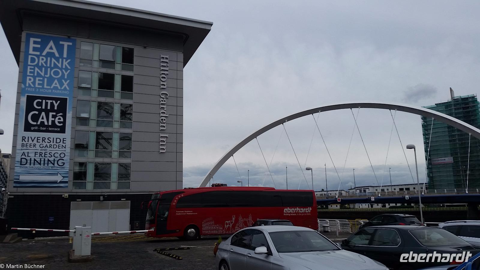 Wir übernachten im Hilton Garden Inn, unmittelbar am Clyde Arch.