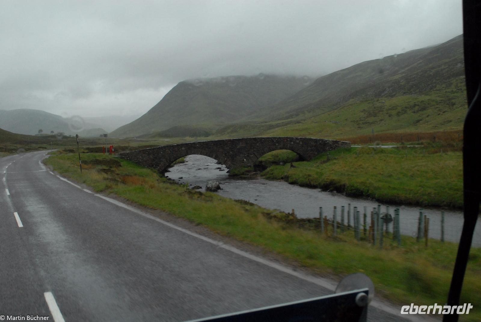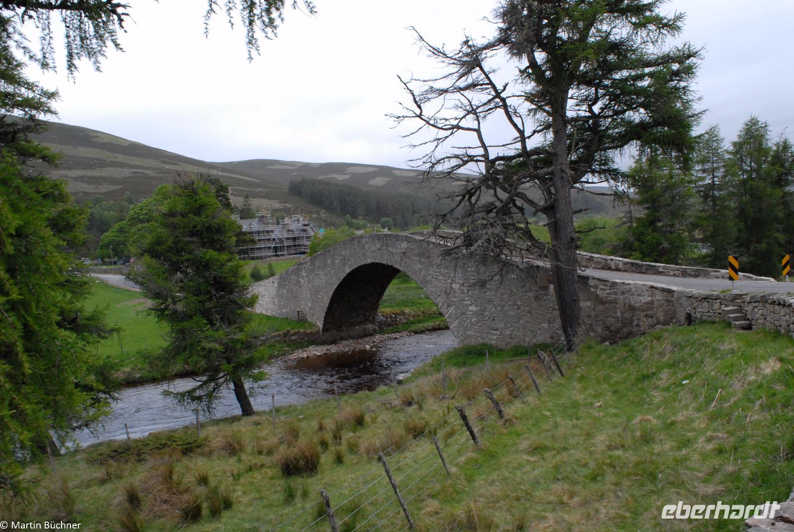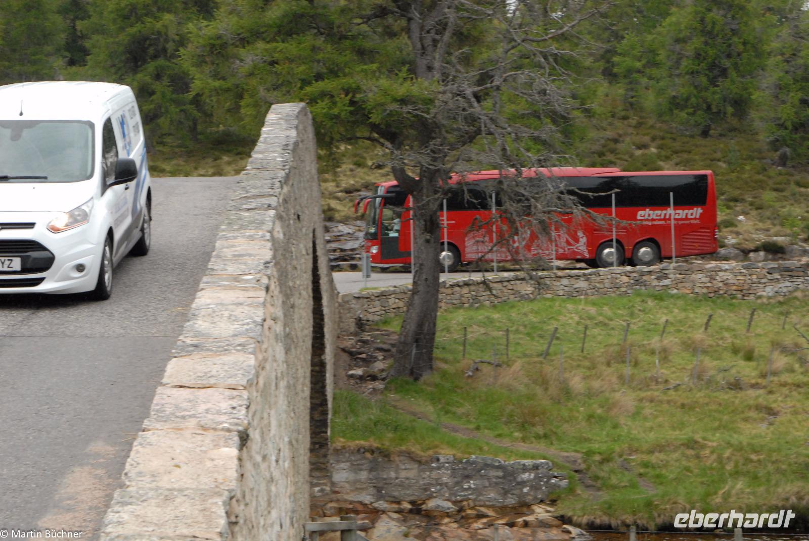 Auf dem Weg in Richtung Ballater überqueren wir die River Gairn Bridge. Wir steigen aus und gehen zu Fuß über die Brücke, natürlich nur um die spektakuläre Überfahrt unseres Busses über diese steile alte Steinbrücke zu beobachten. Unser Bus von Bustouristik Schreiter hat einen perfekt gepflegten Unterboden!!