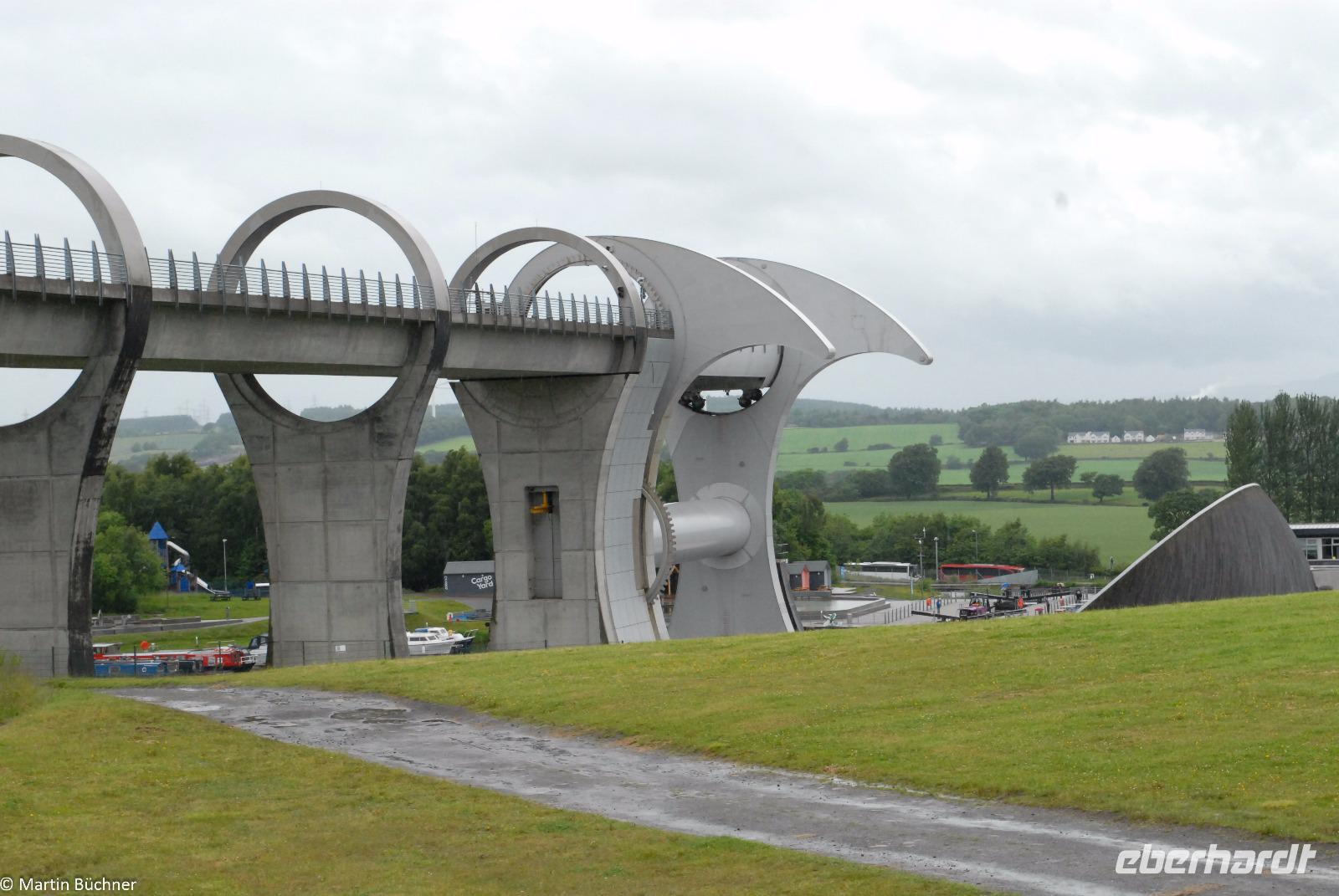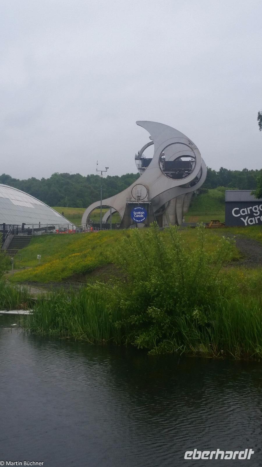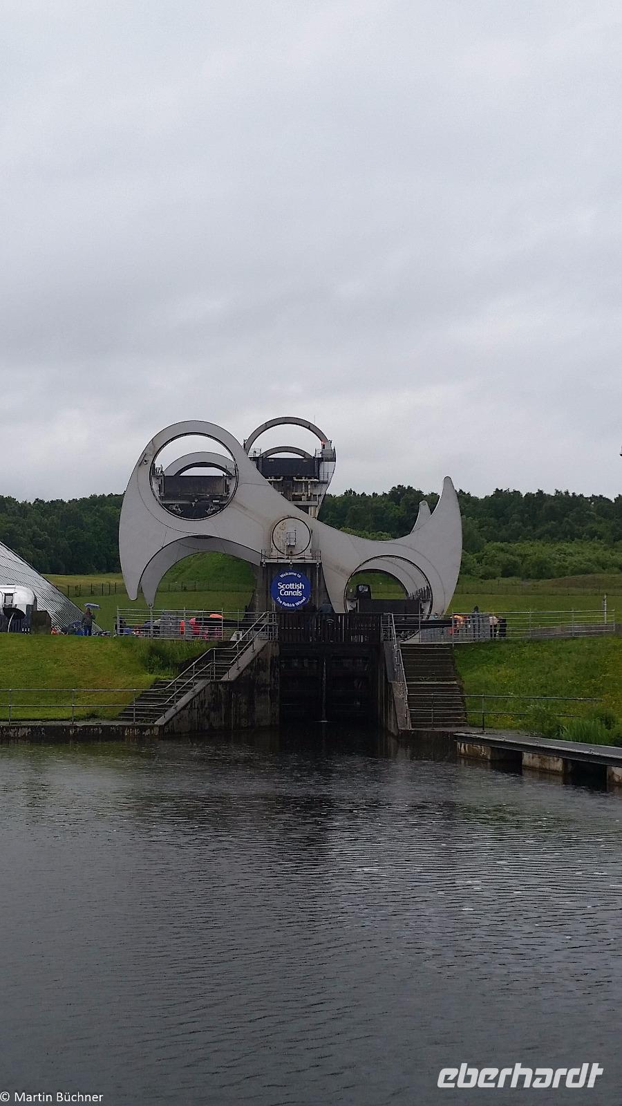 Wir starten zu einem weiteren Millennium Projekt, dem sogenannten Falkirk Wheel in Falkirk. Dabei handelt es sich um ein riesiges Schiffshebewerk in Form eines Riesenrades. Mit wenig Kraftaufwand können nach dem archimedischen Prinzip zwei Schiffe gleichzeitig befördert werden. Das Falkirk Wheel ersetzte eine baufällig gewordene Schleusentreppe am Union Canal, einer Narrowboat-Schiffsverbindung zwischen der Nordsee und der Irischen See, quer durch den Central Belt.