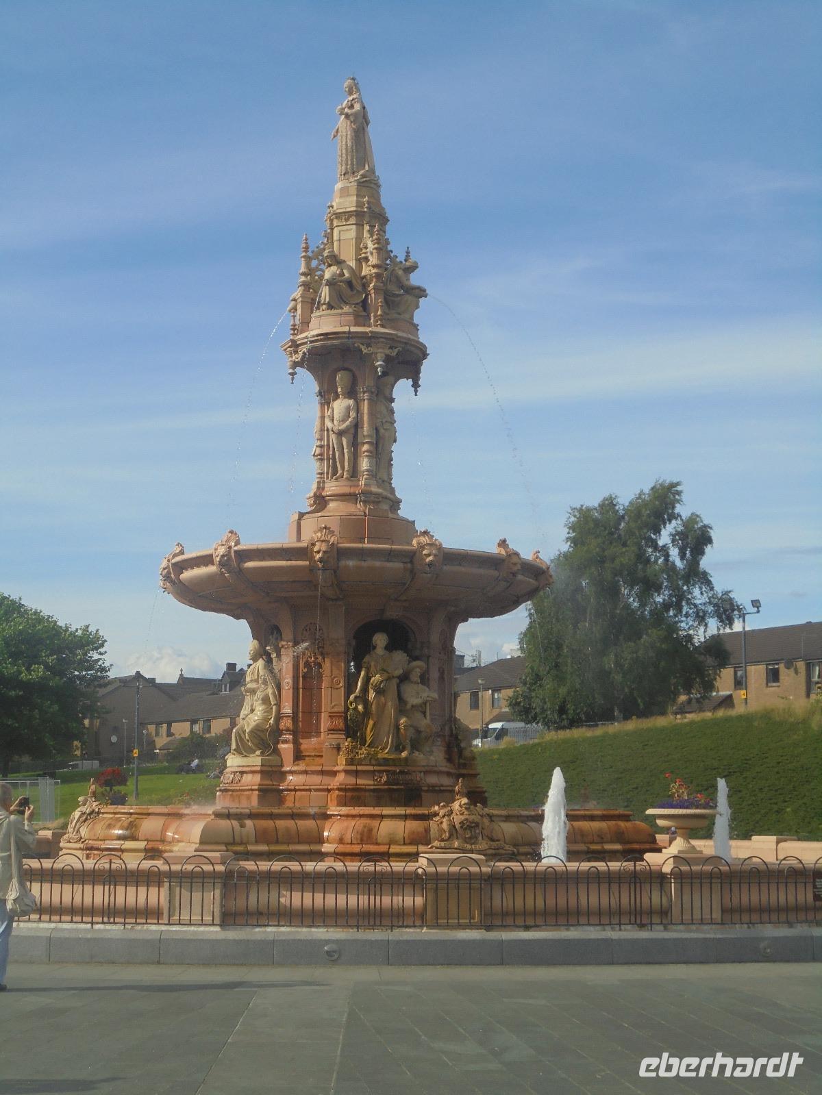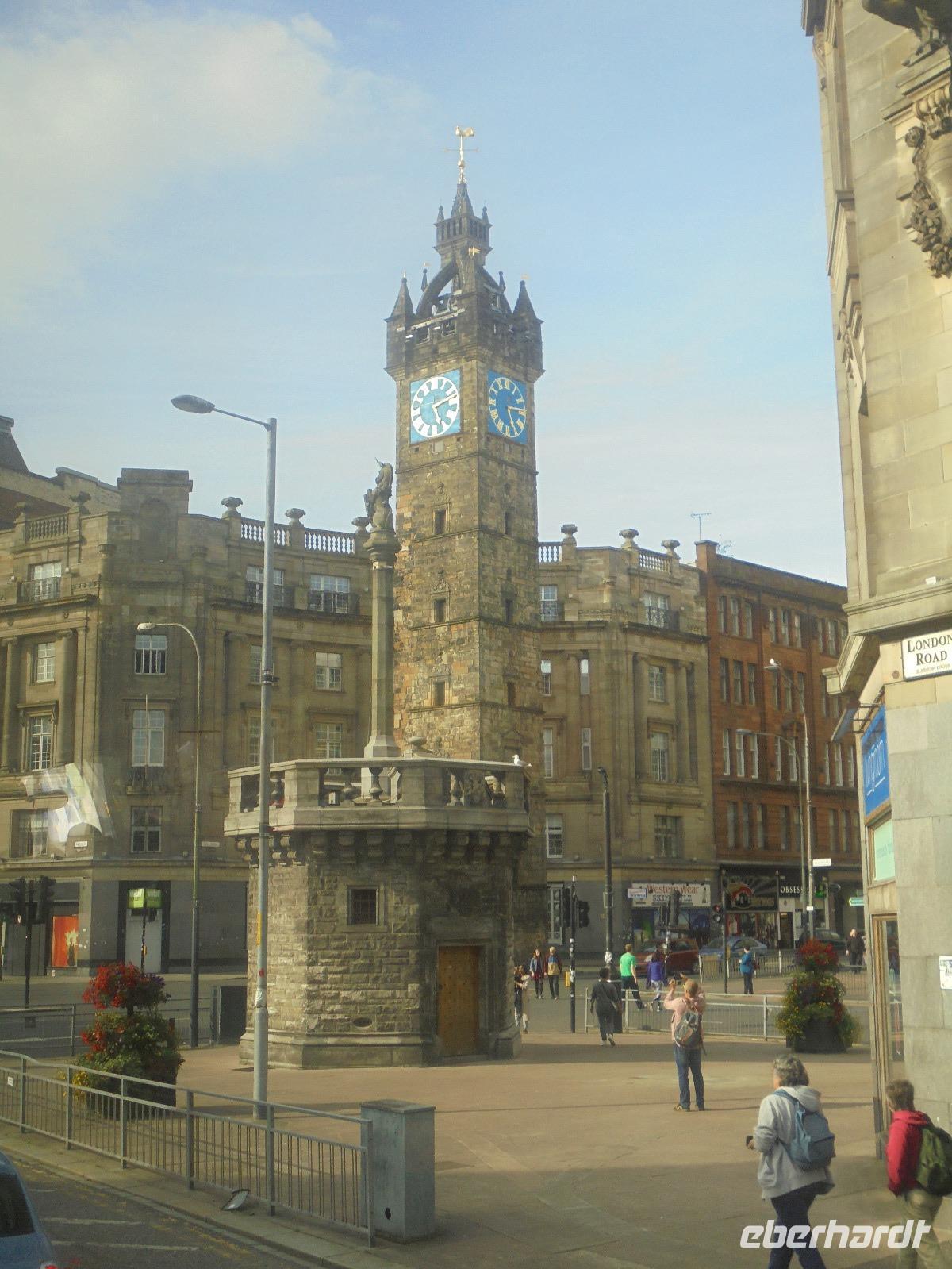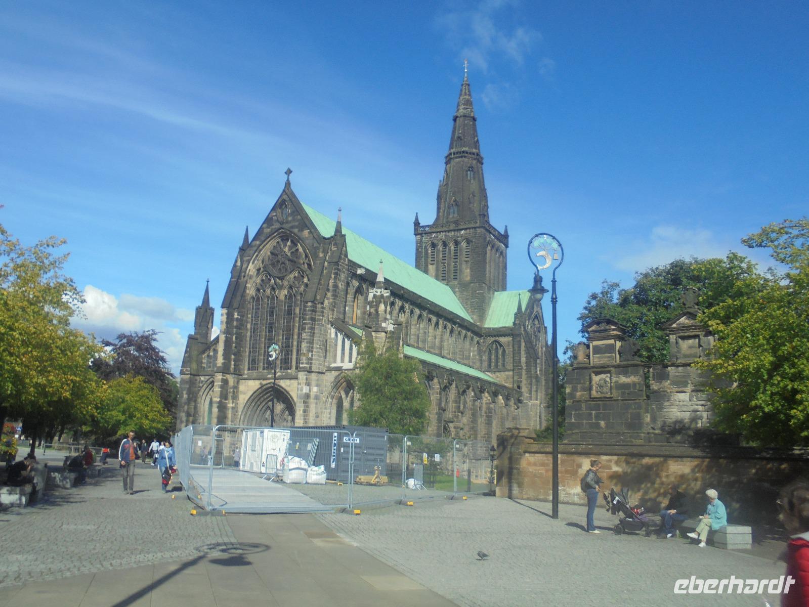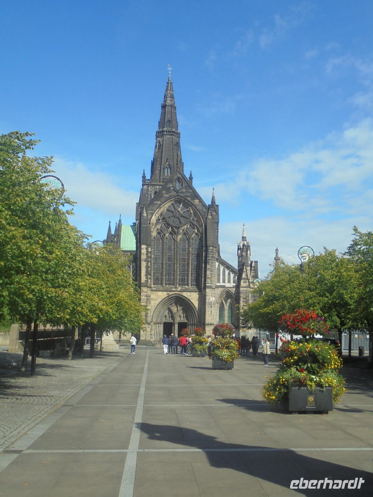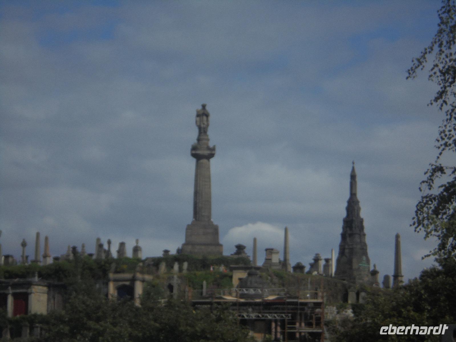 Dann ging es weiter in Schottlands größte Stadt Glasgow. Hier trafen wir am Hotel die Fluggäste für unsere Reise und auch gleich unseren Stadtführer Fraser Gordon. Der machte uns auf einer dreistündigen Rundfahrt mit den Schönheiten seiner Stadt vertraut. Oft wird Glasgow nur als Industriestadt gesehen, aber sie hat einiges zu bieten. Eins ihrer Zentren ist die St.Mungo Kathedrale, der größte Kirchenbau Schottlands mit imposanten Ausmaßen und einer wechselvollen Geschichte. Schon im 12. Jh. wurde hier eine Chorschule gegründet, die - da sie noch heute, wenn auch mit Veränderungen, besteht - die älteste Schule Schottlands ist. Der Heilige Mungo soll hier eine Kirche begründet haben - er ist bis heute Glsgows Schgutzpatron und auf die Legenden über die von ihm bewirkten Wunder geht bis heutre das Stadtwappen zurück. Auch am Marktkreuz der Altstadt kamen wir vorbei und an Sehenswertem auch in der Neustadt.