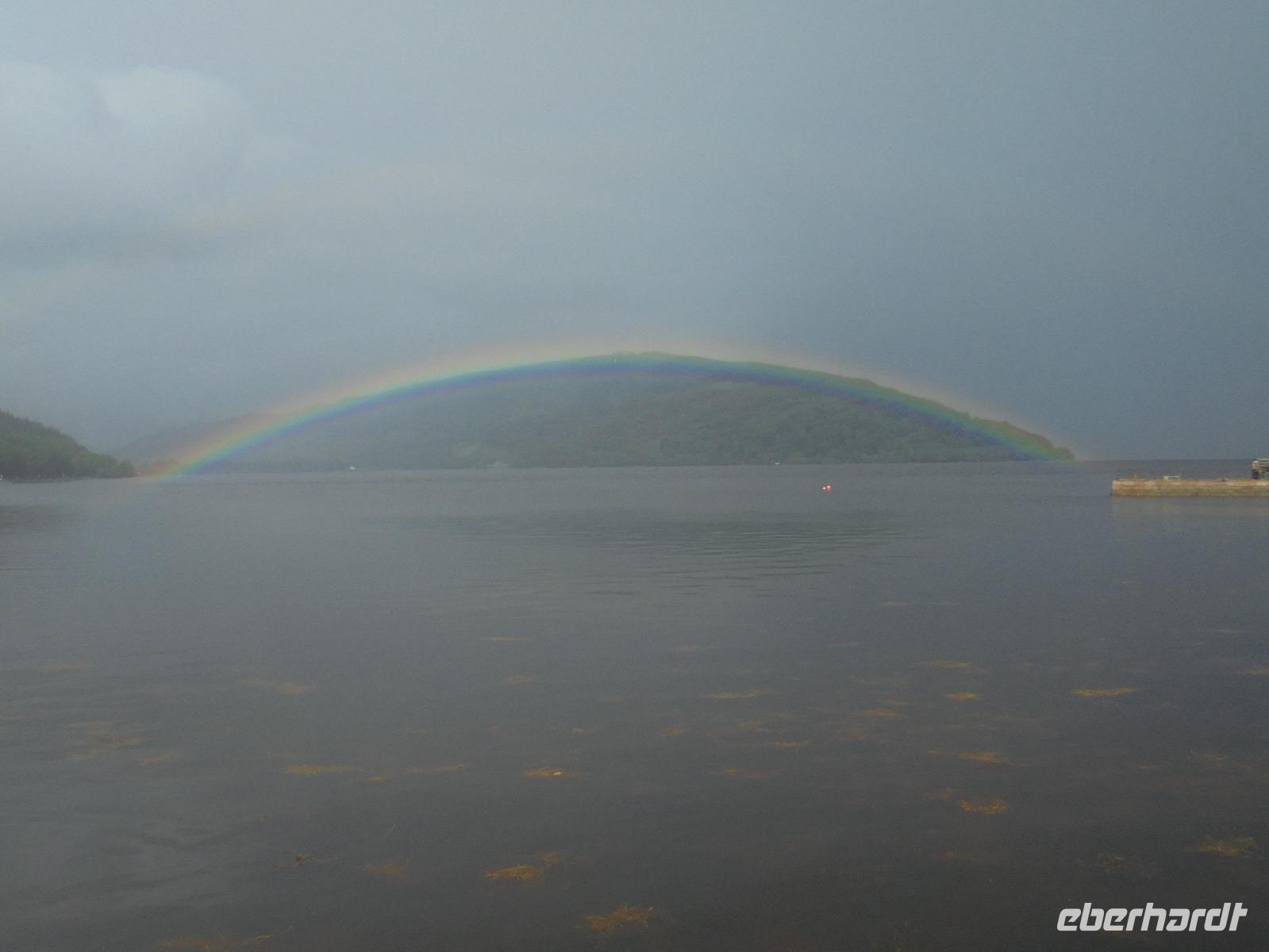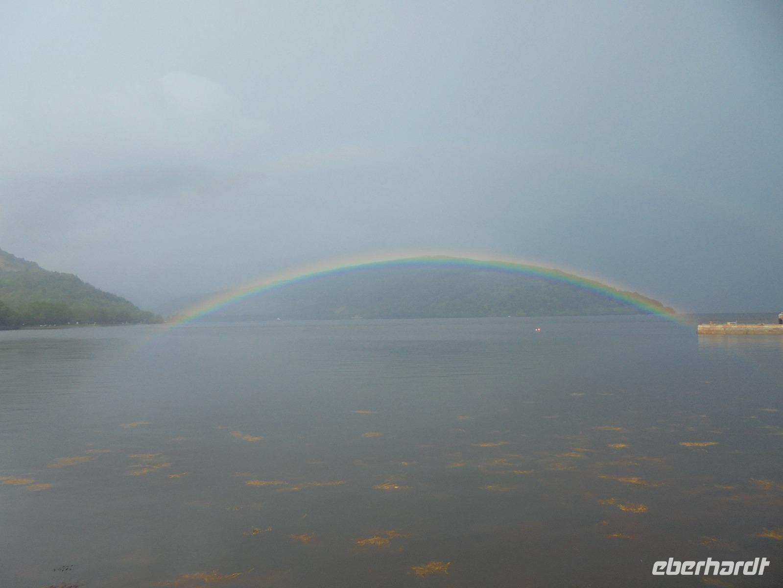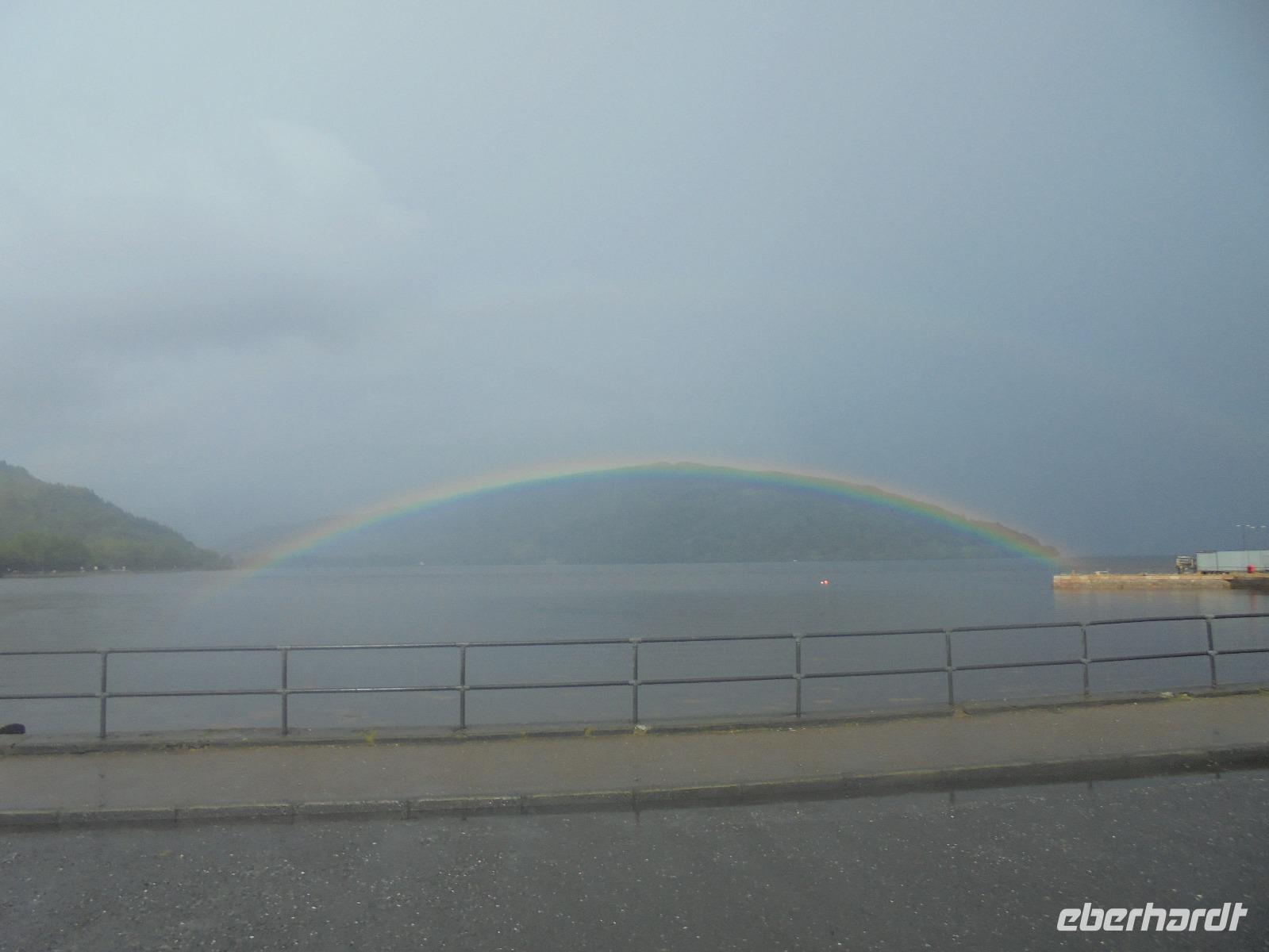 Nach dem Frühstück fuhren wir von Glsgow aus bei leider sehr unfreundlichem Wetter über die Erskine Bridge nach Norden in Richtung auf die vielbesungenen schottischen Highlands. Dabei kamen wir zunächst - noch in den Lowlands - zu Schottlands größtem See, dem 71 km² großen Loch Lomond. Der deutsche Romancier und Schottlandkenner Theodor Fantane hatte diesen See einmal als „große noble Wasserfläche, der es wohl zukommt, als der König der Seen bezeichnet zu werden..." benannt. Malerisch liegt er da mit seinen etwa 30 Inseln. Wir machten einen Fotostopp und hörten auch das bekannte Lied, das dem Gewässer gewidmet ist und eine traurige Begebenheit aus der schottischen Geschichte besingthatte. Hier machten wir eine längere Kaffeepause, die natürlich viele der Gäste zum Gang zum See nutzten.