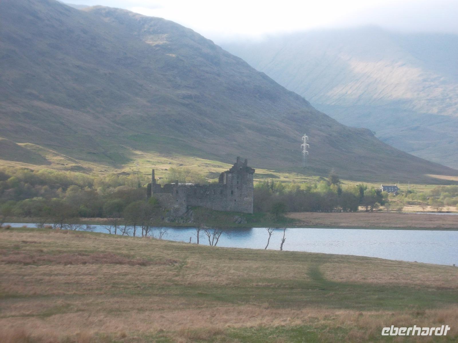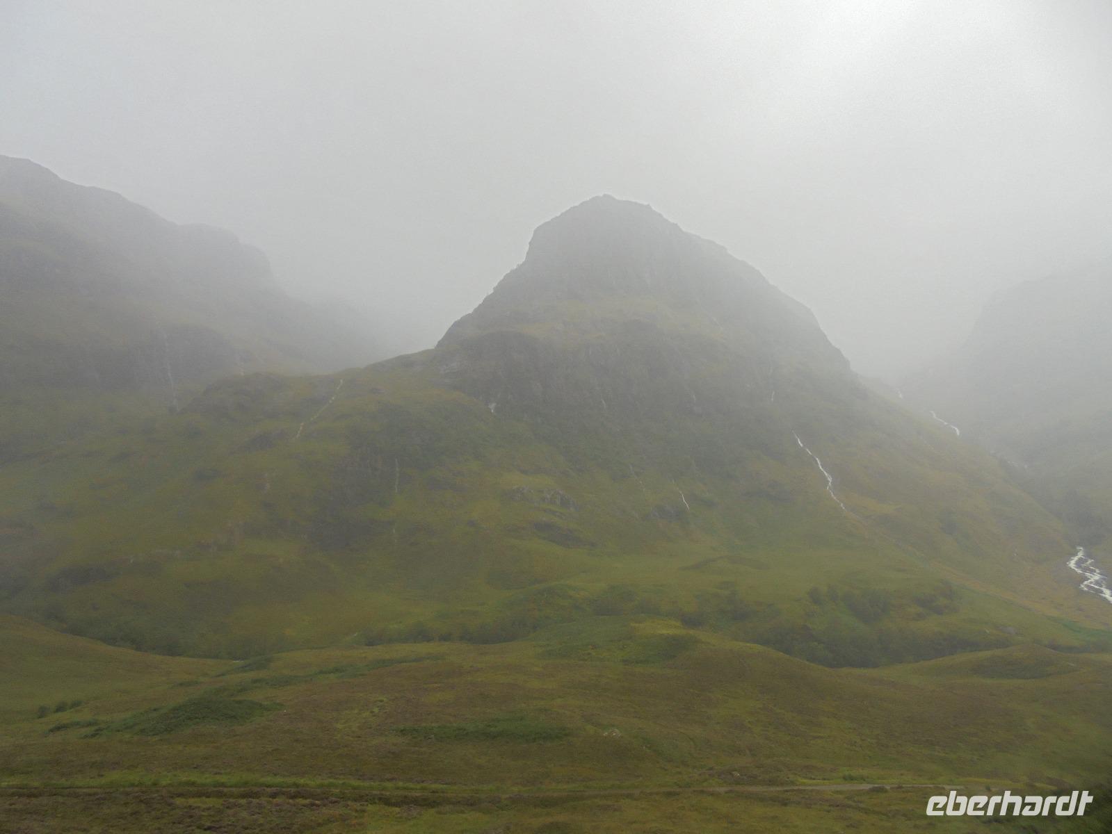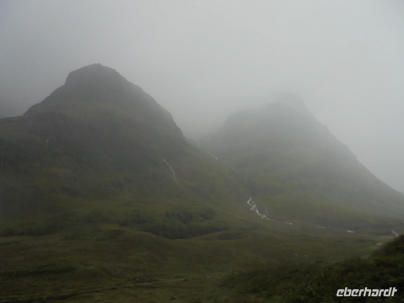 Durch das nordwärts vom See führende Tal gelangten wir dann in die „echten" Highlands und erreichten wenig später das Tal von Glencoe. Das immer noch schlechte Wetter und der verregnete Blick ins Tal ließ die gewaltigen Berge, die einst Vulkankegel waren, die gerundeten Trogtäler, den spärlichem Waldbewuchs und den weiten Flächen aus Moos und Heidekraut nur erahnen. Vorbei an einem hübschen Wasserfall fuhren wir durch das Tal von Glencoe, das durch Bäche und Rinnsale unterbrochen, seinen Höhepunkt mit zwei gewaltigen begleitenden Bergen findet, die wir in Regen und Dunst nur erahnen konnten. Hier ereignete sich eine weitere tragische historische Begebenheit, an der die schottische Geschichte so reich ist. Das Massaker von Glencoe, auch dieses in einem bekannten Lied verewigt, ereignete sich in diesem wunderschönen Tal im Februar 1693. Im Auftrag des englischen Königs war hier ein Massenmord an den Dorfbewohnern, Angehörigen des Hochland-Clans der McDonalds verübt worden.