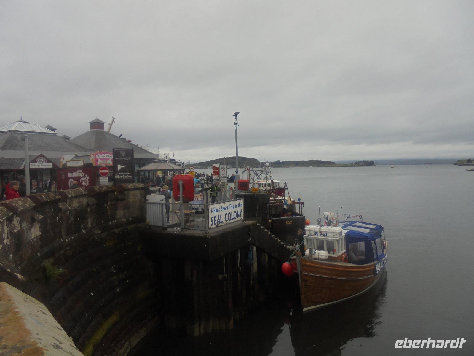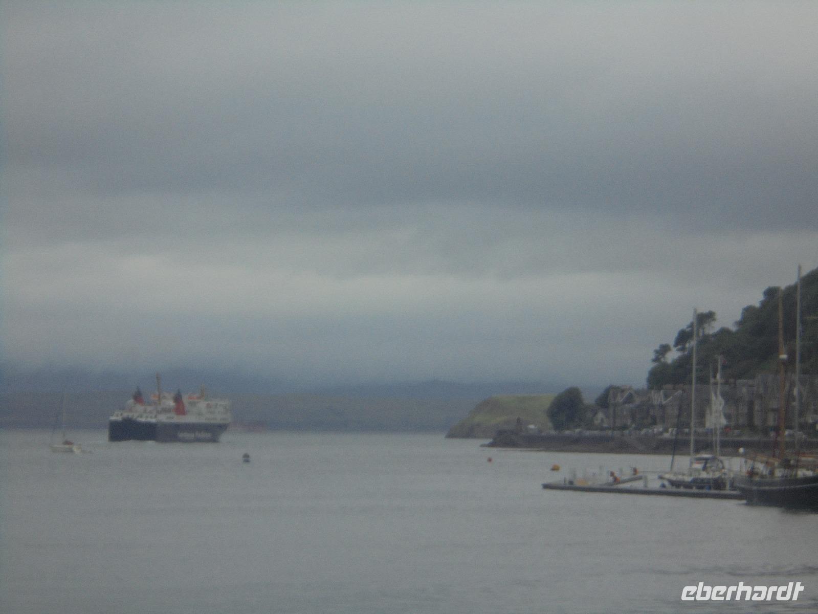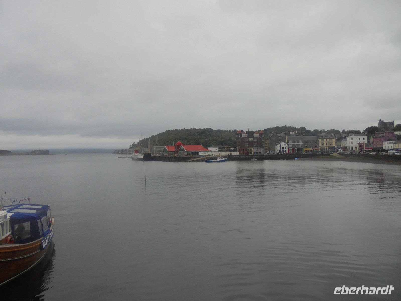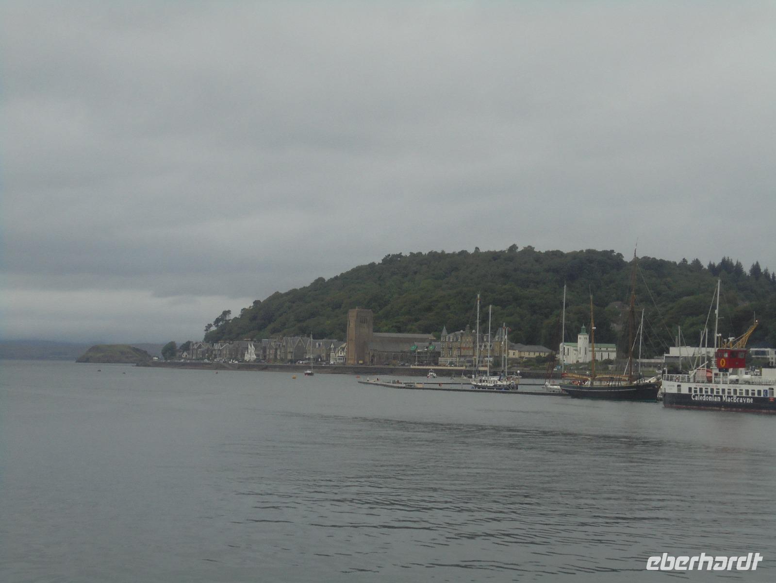 Überwiegend an der Küste entlang erreichten wir dann am frühen Nachmittag das Hafenstädtchen Oban. Es liegt durch eine vorgelagerte Insel geschützt am Atlantik und ist Ausgangshafen für viele Fähren zu verschiedenen Hebrideninseln. So ist hier am Hafen immer Betrieb, der Ort schmiegt sich malerisch in die Bucht und zeigt das typische Treiben einen Hafenstadt im schottischen Westen. Bekannt ist die Oban-Brennerei, die als eine der ältesteten schottischen Destillen seit 1794 Whisky hergestellt und Wahrzeichen der Stadt ist der McCaigs-Tower, ein an erhöhter Stelle errichteter und nie vollendeter Nachbau des Kolosseums in Rom.