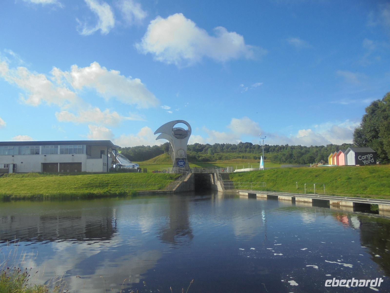 Gleich zu Anfang des Tages konnten wir ein schönes „Richtig reisen!"-Extra genießen: wir machten einen Abstecher zu einem Millenniumbauwerk. Das Falkirk Wheel ist erst seit 2002 in Betrieb und durch seine Konstruktion als eine Art Riesenrad das einzige rotierende Schiffshebewerk der Welt. Wir hatten die Möglichkeit zum Fotostopp und einem Blick auf die erstaunlich leicht wirkende Gesamtkonstruktion. Tatsächlich wiegt dioe ganze Anlage nur etwa 1800 Tonnen. Dabei wirkt sie gewaltig, denn ihr zentrales Rad, in dem sich zwei Gondeln mit jeweils 250 t Wasser enthaltenden Schiffströgen befinden, hat immerhin 35 m Durchmesser. Durch eine halbe Drehung des Förder-Rades können in wenigen Minuten die Schiffströge - mit den darin eingefahrenen Booten - in ihrer Position getauscht werden, wobei sie eine Ebene gehoben oder gesenkt und damit durch Überwinden eines Höhenunterschiedes von 24 Metern in das jeweils andere Kanalsystem gebracht werden.