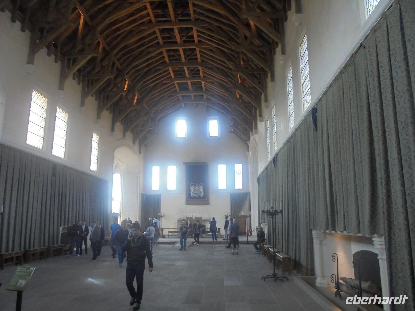 Wir besuchten den steil aufragenden Burgfelsen und konnten uns - nachdem ich rasch die Tickets geholt hatte, davon überzeugen, dass dadurch die Wehranlage von drei Seiten zuverlässig geschützt ist - der Nimbus der Unbezwingbarkeit war damit erklärt! Schon um 1100 gab es hier bereits eine starke Burg, die immer wieder umgebaut wurde, immer wieder zusätzlich befestigt, bis sie im Inneren mit Palastbauten versehen wurde. Heute zeigt die Burg, hauptsächlich aus der Mitte des 16. Jahrhunderts stammend, wohl eine Mischung aus Spätgotik und Renaissance. Der aufwendig königliche Palast, mehrfach umgebaut, zeigt dies ganz gut, besonderes Prunkstück der Burganlage aber ist die spätgotische Festhalle. Leicht erkennbar durch ihren beigefarbenen Anstrich sah sie des Königs Feste, aber auch zahlreiche Parlamentstagungen. Daniel Defoe, der den weltbekannten Roman „Robinson Crusoe" schrieb, bezeichnete die Festhalle als den majestätischsten Bau, den er je in Europa gesehen hätte.