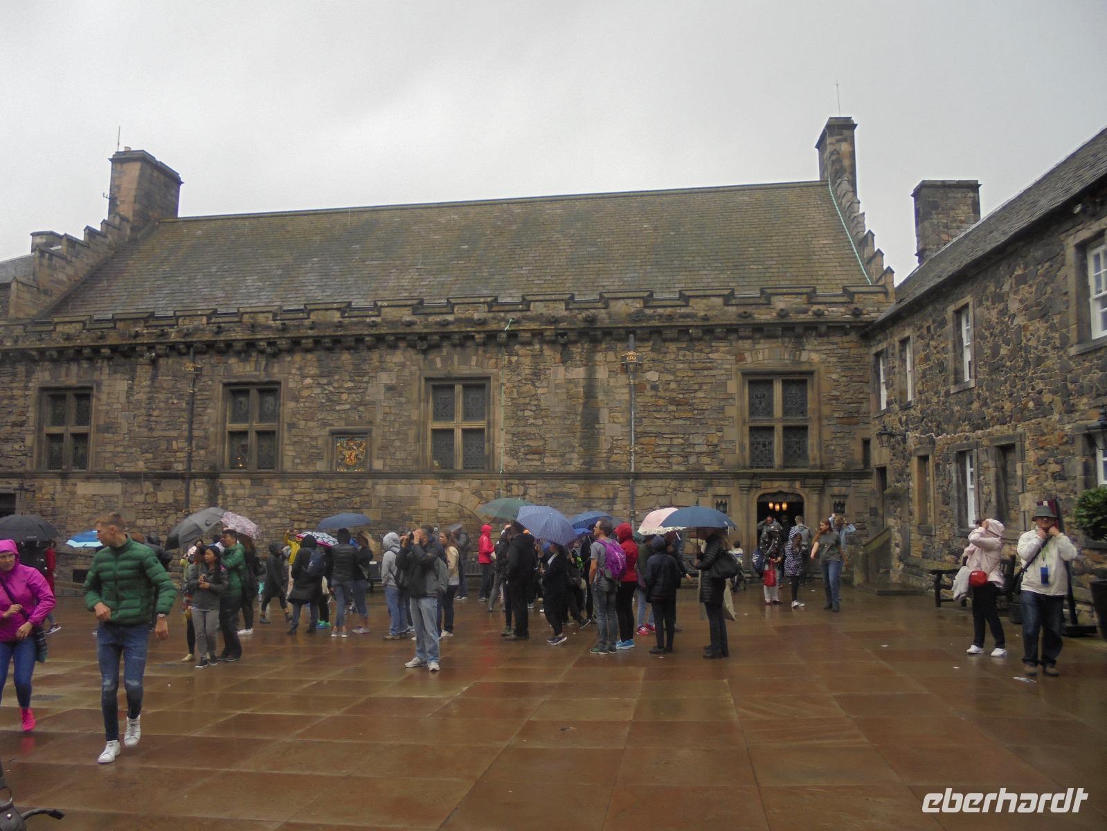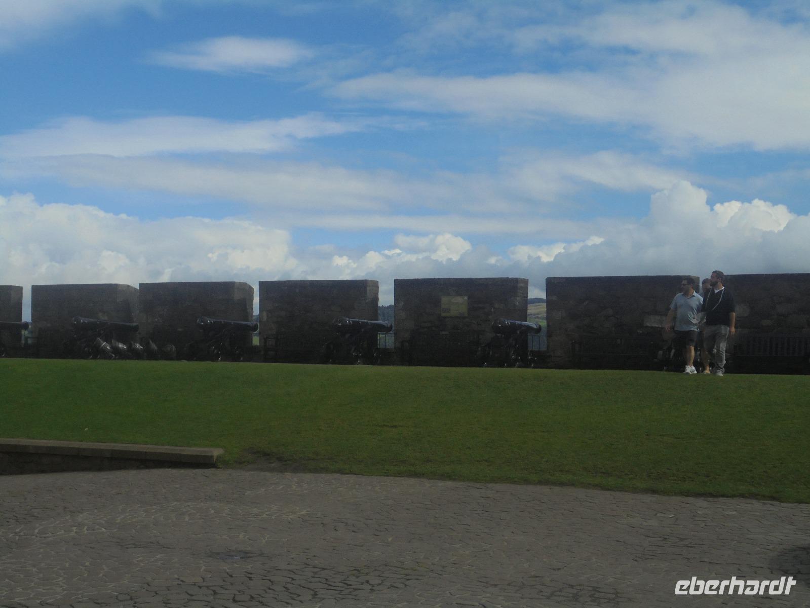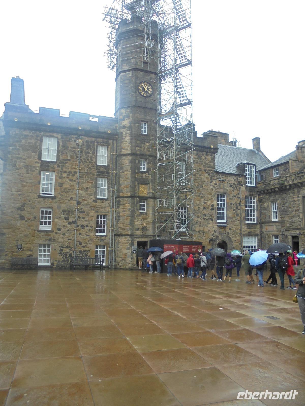 Wir verließen den Bus nahe dem Aufgang zur Burg und gingen dann gemeinsam zum großen Burgplatz. Der wurde großflächig von den Einrichtungen des „Military Tattoo" eingenommen, die uns schon einen Vorgeschmack auf die für den Abend zu erwartenden Ereignisse gaben. Nadine führte uns dann noch ein wenig durch die Burg, gab Erläuterungen zu ihrer immer noch währenden Funktion als Militärgelände. Dann sahen wir noch das älteste Gebäude Edinburghs, die Margaretenkapelle hoch oben im Edinburgh Castle und verabschiedeten uns vor dem Inneren Palast mit verschiedenen Ausstellungen und der Möglichkeit zum Besuch der schottischen Kronjuwelen. Danach hatten wir alle Freizeit, um uns bei individuellen Unternehmungen ins unglaubliche Getümmel der quirligen Festivalwoche in Edinburgh zu stürzen.