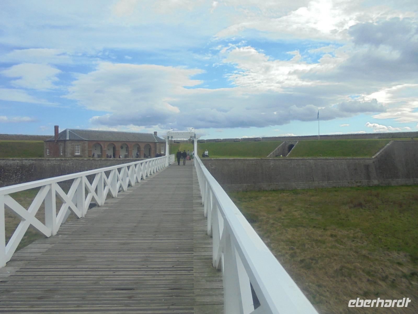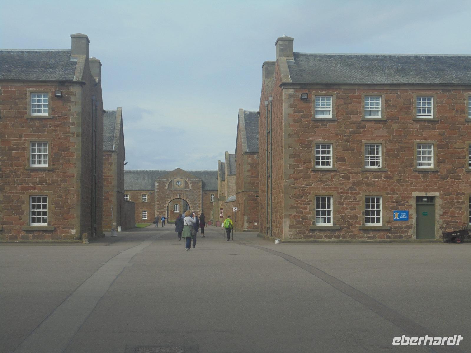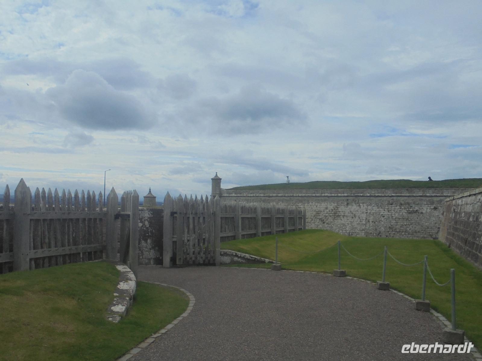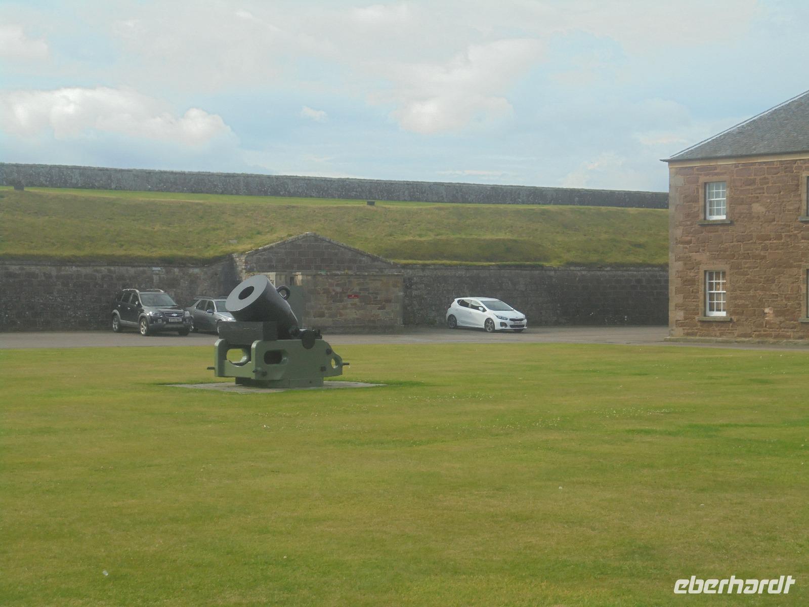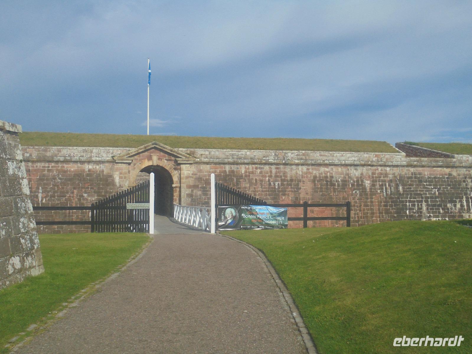 Eine Sehenswürdigkeit von europäischem Rang war heute unser erstes Ziel. Fort George, eine im 18. Jh. errichtete Artilleriefestung, liegt auf einer Landzunge, die in den zur Nordsee gehörenden Moray-Firth hineinreicht. Der Grund seiner Errichtung waren die Aufstände und Unruhen im Schottland der damaligen Zeit gegen die Engländer. In den Seeweg nach Inverness beherrschender Lage für eine große Garnison erbaut, hat die gewaltige, sternförmige Verteidigungsanlage die für ihre Zeit typische Bauweise. Sie wurde nie zerstört und ist noch komplett im Originalzustand erhalten. Durch sanft ansteigendes Gelände vor Blicken und direktem Beschuss von der Landseite geschützt, entdeckten auch wir die Festung erst sozuzsagen im letzten Augenblick. Dann jedoch konnten wir uns dem malerischen Anblick und der Bewunderung für die schier unglaublichen Ausmasse nicht entziehen. Wie vor dreihundert Jahren empfingen uns die mit Mauerwerk verstärkten, viele Meter dicken Erdumwallungen, die als Kugelfang dienen sollten und die schiffsbugartig vorspringenden dreieckigen Bastionen und Befestigungen trugen, von denen jeder Angreifer gleich mehrfach ins Kreuzfeuer genommen werden konnte. Feindliche Truppen konnten so geteilt, getrennt und vereinzelt werden, gleichzeitig schirmte man die eigenen Befestigungen damit ab. In den Wällen und an den von ihnen geschützten dahinterliegenden Höfen und Apellplätzen sind bis heute Mannschaftsunterkünfte, Offizierswohnen und Aufbewahrungsräume erhalten, die Erdwälle verbergen tonnengewölbte Kasematten die als Munitionsbunker und - im Angriffsfall - wohl auch als Schutzräume dienten.