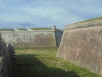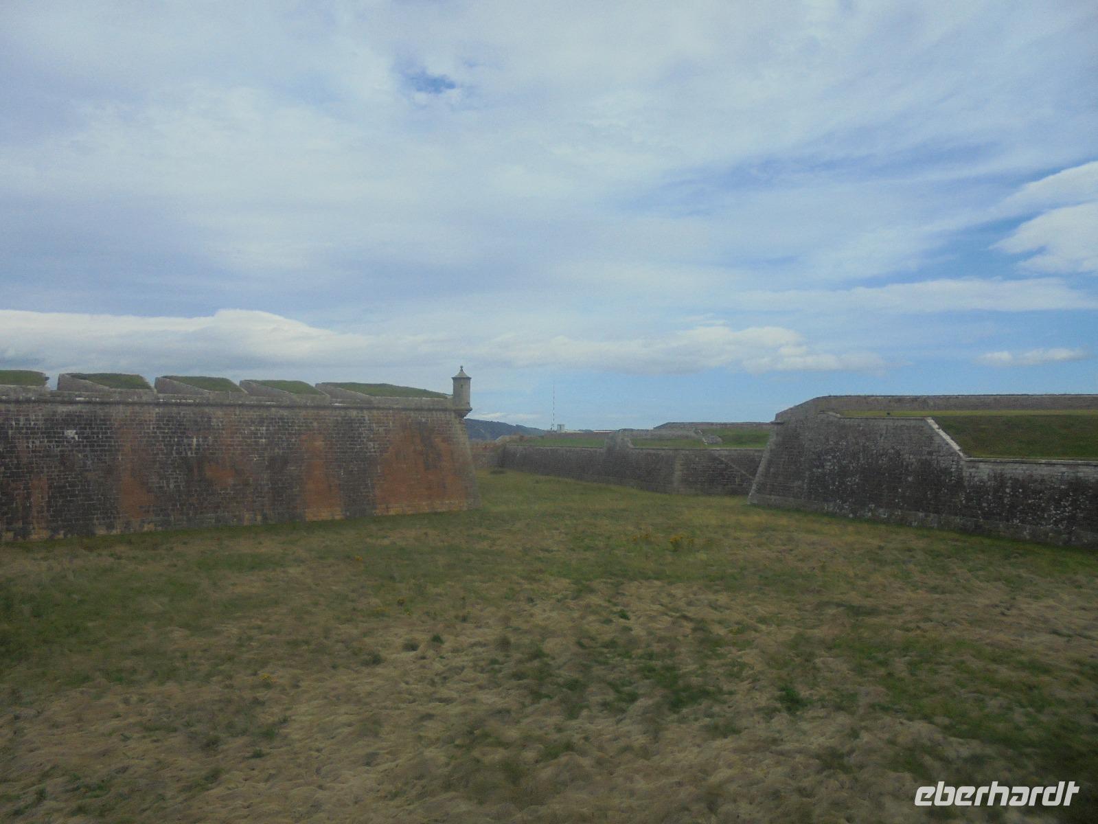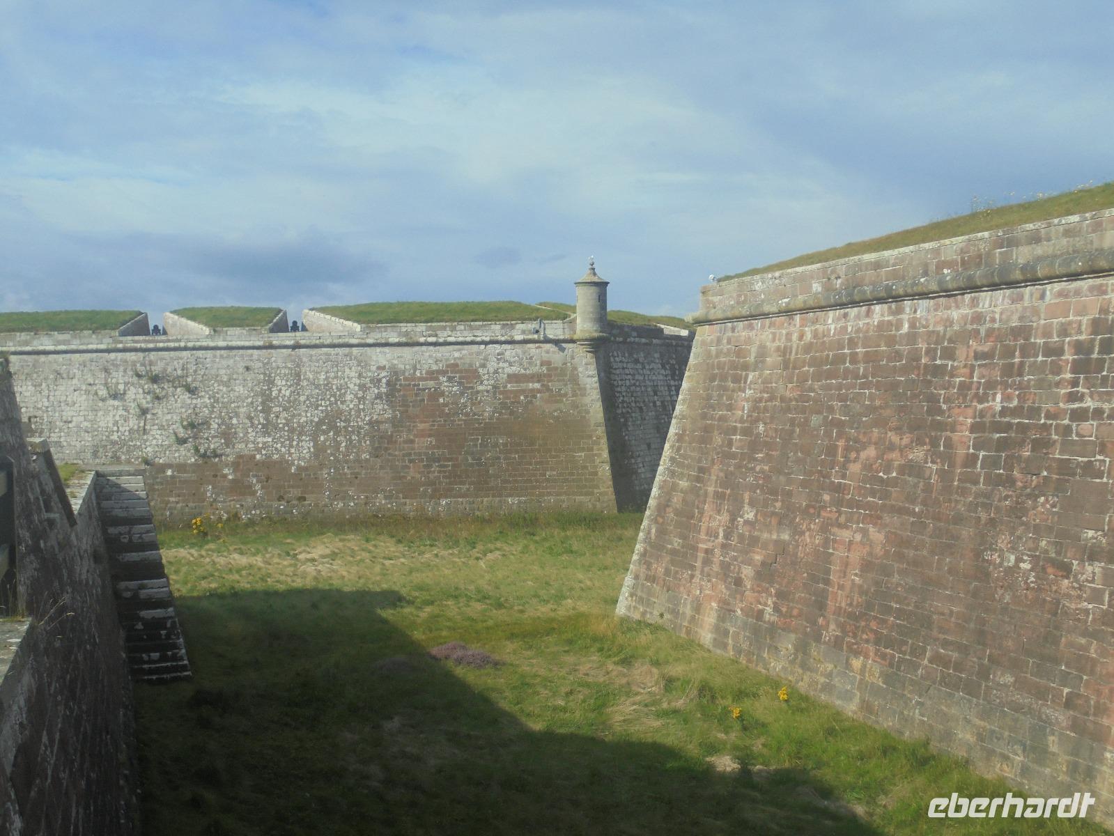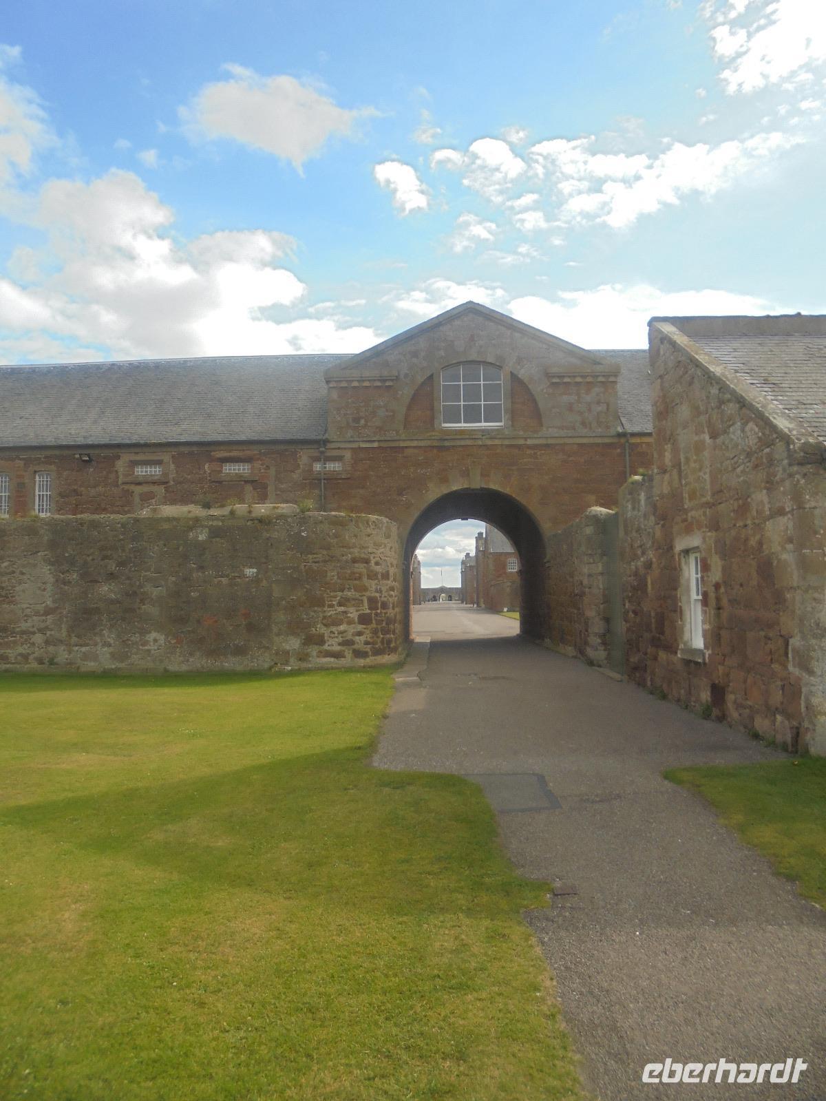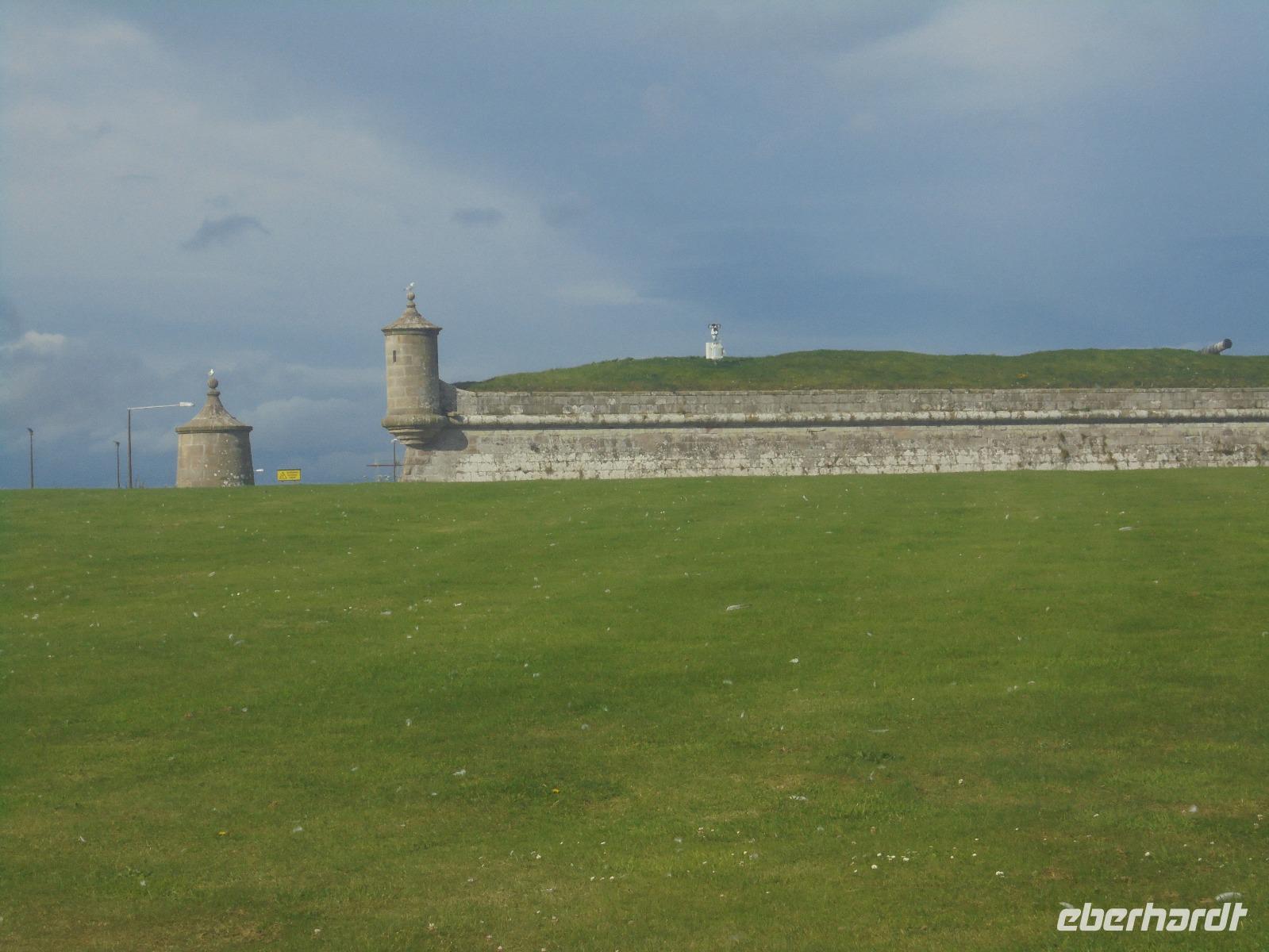 Eine Sehenswürdigkeit von europäischem Rang war heute unser erstes Ziel. Fort George, eine im 18. Jh. errichtete Artilleriefestung, liegt auf einer Landzunge, die in den zur Nordsee gehörenden Moray-Firth hineinreicht. Der Grund seiner Errichtung waren die Aufstände und Unruhen im Schottland der damaligen Zeit gegen die Engländer. In den Seeweg nach Inverness beherrschender Lage für eine große Garnison erbaut, hat die gewaltige, sternförmige Verteidigungsanlage die für ihre Zeit typische Bauweise. Sie wurde nie zerstört und ist noch komplett im Originalzustand erhalten. Durch sanft ansteigendes Gelände vor Blicken und direktem Beschuss von der Landseite geschützt, entdeckten auch wir die Festung erst sozuzsagen im letzten Augenblick. Dann jedoch konnten wir uns dem malerischen Anblick und der Bewunderung für die schier unglaublichen Ausmasse nicht entziehen. Wie vor dreihundert Jahren empfingen uns die mit Mauerwerk verstärkten, viele Meter dicken Erdumwallungen, die als Kugelfang dienen sollten und die schiffsbugartig vorspringenden dreieckigen Bastionen und Befestigungen trugen, von denen jeder Angreifer gleich mehrfach ins Kreuzfeuer genommen werden konnte. Feindliche Truppen konnten so geteilt, getrennt und vereinzelt werden, gleichzeitig schirmte man die eigenen Befestigungen damit ab. In den Wällen und an den von ihnen geschützten dahinterliegenden Höfen und Apellplätzen sind bis heute Mannschaftsunterkünfte, Offizierswohnen und Aufbewahrungsräume erhalten, die Erdwälle verbergen tonnengewölbte Kasematten die als Munitionsbunker und - im Angriffsfall - wohl auch als Schutzräume dienten.