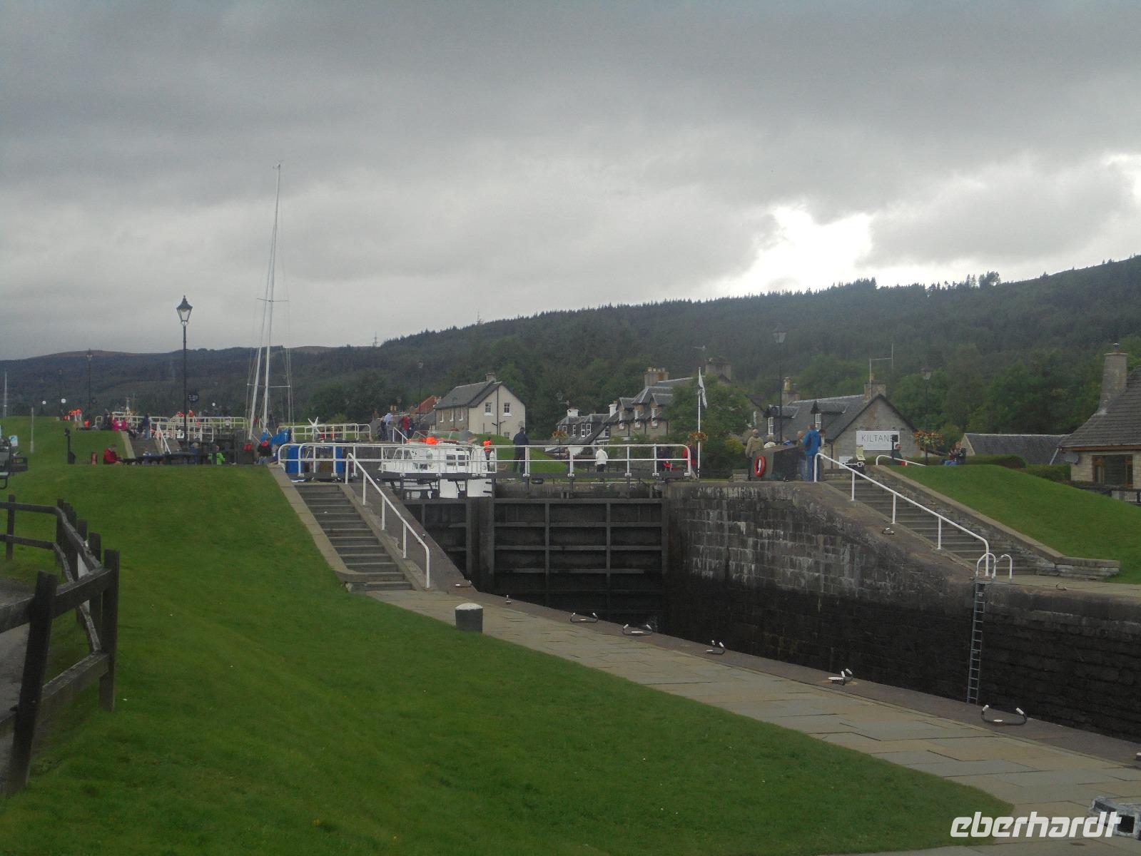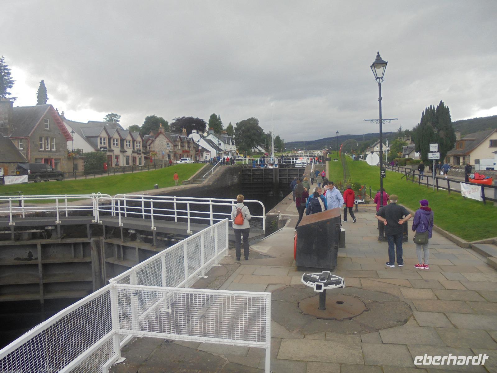Allerdings hatten wir Gelegenheit, uns vom Technik-Wunder zu überzeugen, als wir in Fort Augustus eine der „Neptunes staircases" besichtigten. „Neptuns Treppenhaus" werden die Schleusentreppen genannt, Abfolge mehrerer direkt hintereinander liegenden Schleusen. Sehr eindrucksvoll ist hier in Fort Augustus eine mit einer Gesamtlänge von 200 m. Fünf hintereinander angeordnete Schleusen überwinden mit Ausgleich ihrer Wasserstände den imposanten Höhenunterschied von insgesamt 17 m.