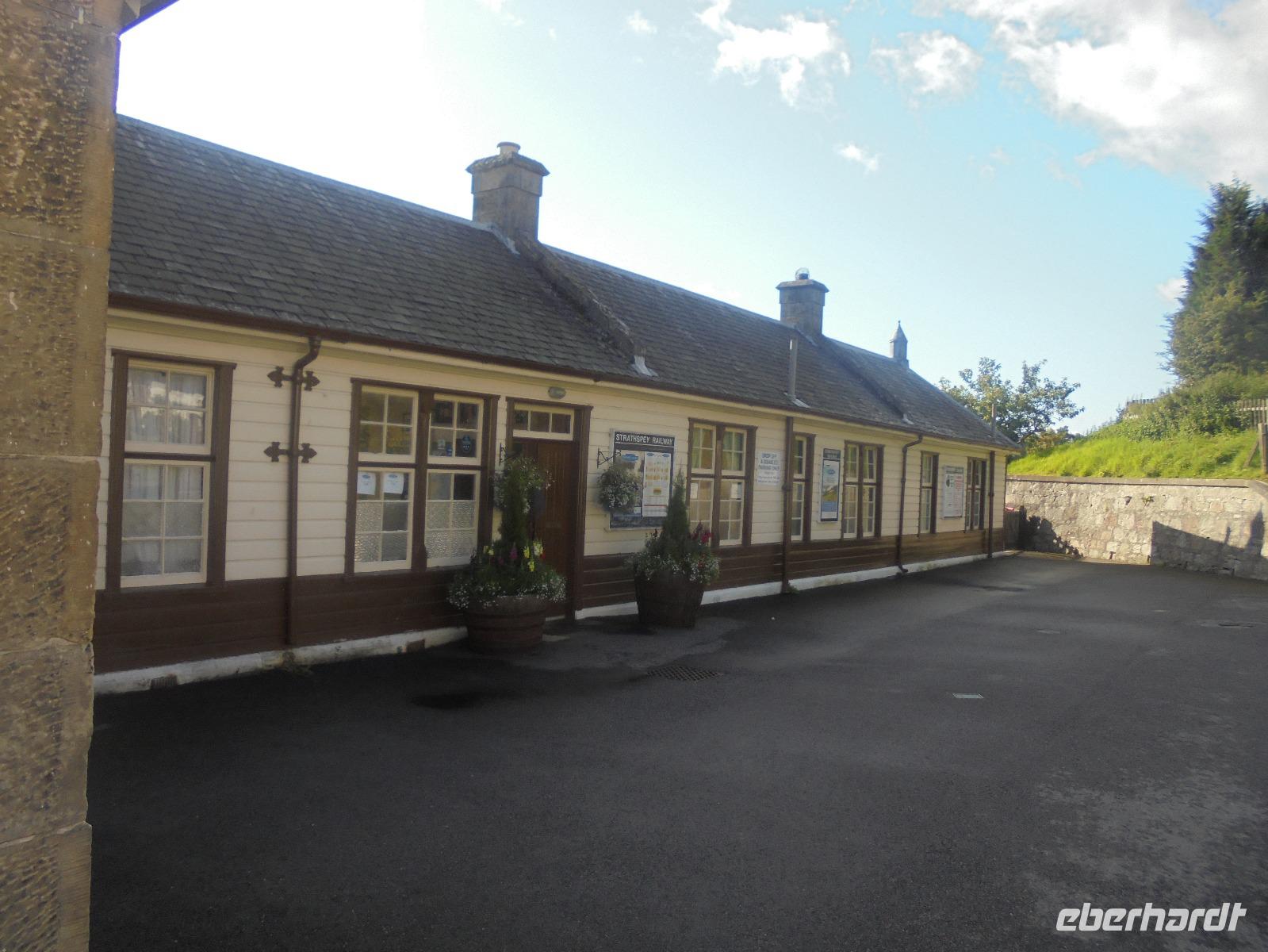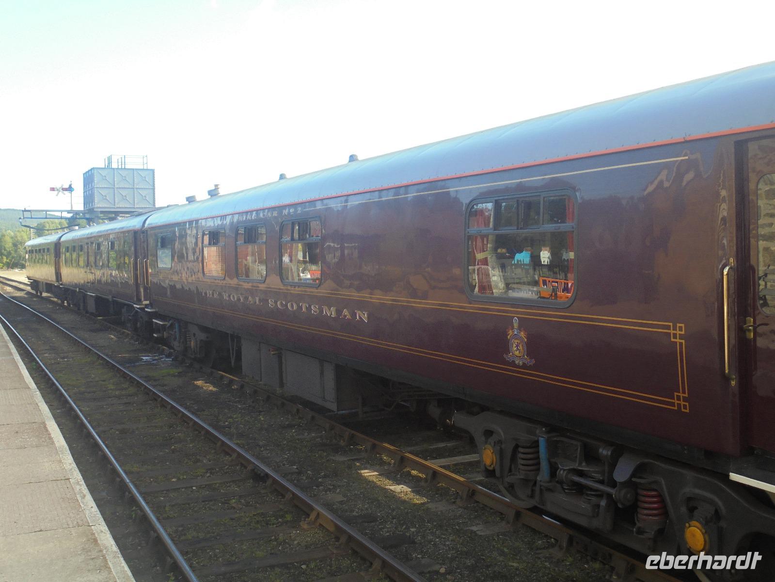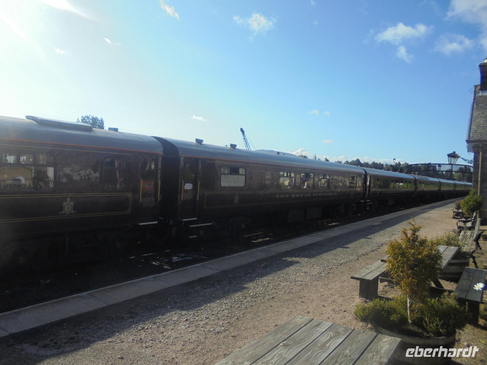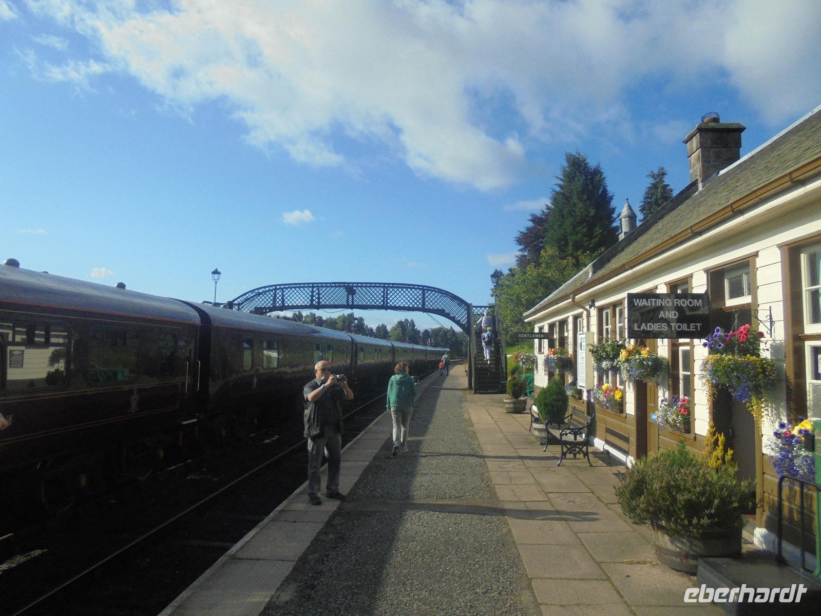 Zunächst einmal erreichten wir schon nach wenigen Minuten ein idyllisches Dörfchen, das als Post- und Eisenbahnstützpunkt gegründet wurde. Boat of Garten liegt an der Strecke der ehemals durch das Spey-Tal führenden Eisenbahn, die in den 60er Jahren des 20. Jh. stillgelegt, kurz darauf aber als Museumseisenbahn wiederbelebt wurde. Der Bahnhof ist noch im Original erhalten, hier verkehren nach wie vor die Museumszüge und wir hatten das Glück, einige Salonwagen des legendären Royal Scotsman auf den Schienen zu entdecken und zu fotografieren.