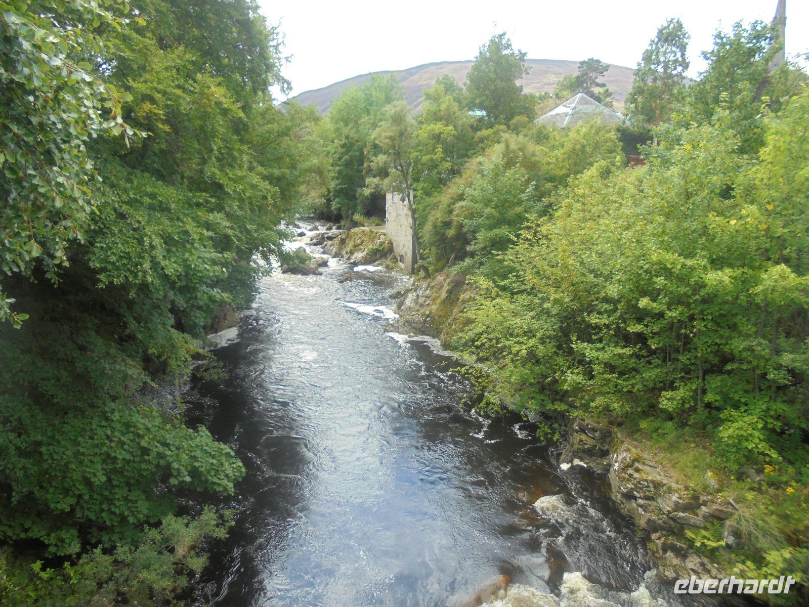 Das Gebirge der Grampians ist höchst interessant. Als eines der erdgeschichtlich ältesten Gebirge überhaupt existierte es schon vor dem Auseinanderdriften von Europa und Amerika und findet seine Fortsetzung in den nordamerikanischen Appalachen. Die Straße, die wir naghmen, folgte dem bedeutendsten Taleinschnitt auf der Südseite des Gebirges und wir gelangten in das unter Denkmalschutz stehende hübsche Städtchen Dunkeld. Obwohl nur eine Kleinstadt, ist der Ort von großer historischer Bedeutung für Schottland. Der Missionar Columban habe hier ein Kloster gegründet und seit dem 9. Jh. war Dunkeld das religiöse Zentruim des Landes. Das erklärt such seine gewaltige, prachtvolle Kathedralenruine, die malerisch an einer Biegung des Flusses Tay liegt. Heute sind für das Städtchen sein dreieckiger Marktplatz und die traditionell weißgetünchten Häuser charakteristisch.