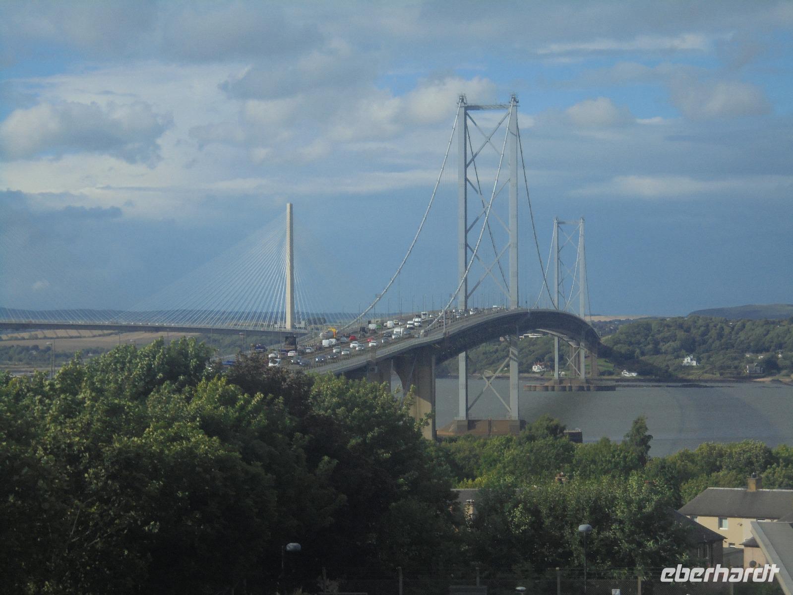 Von hier aus fuhren wir der Stadt Linvingston und unserem Übernachtungshotel zu, unterbrachen unsere Fahrt aber noch für einen längeren Fotostopp. Unbedingt sehenswert sind die Forth-of-Forth-Bridges, inzwischen drei an der Zahl. Die neueste Straßenbrücke ist noch nicht einmal eröffnet. Wir benutzten die längste Straßenbrücke Großbritanniens, die seit 1964 in Betrieb ist. Besonders interessant aber ist der Blick auf die danebenliegende legendäre Eisenbahnbrücke von 1890. 2015 wurde sie sogar in die Liste des UNESCO-Weltkulturerbes aufgenommen und ist unbestreitbar eine ingenieurtechnische Meisterleistung.