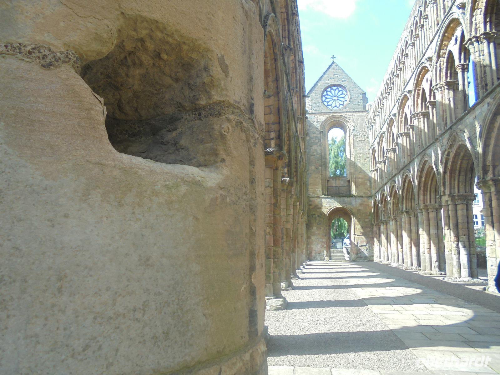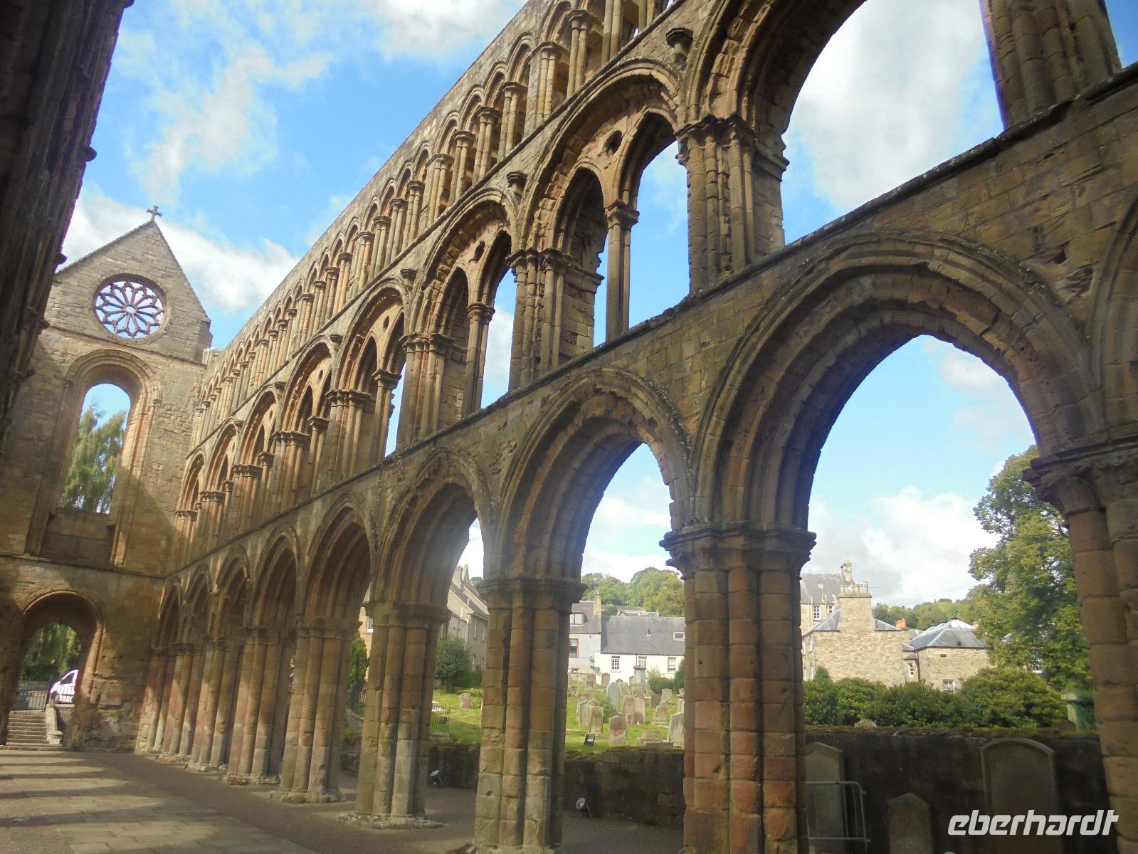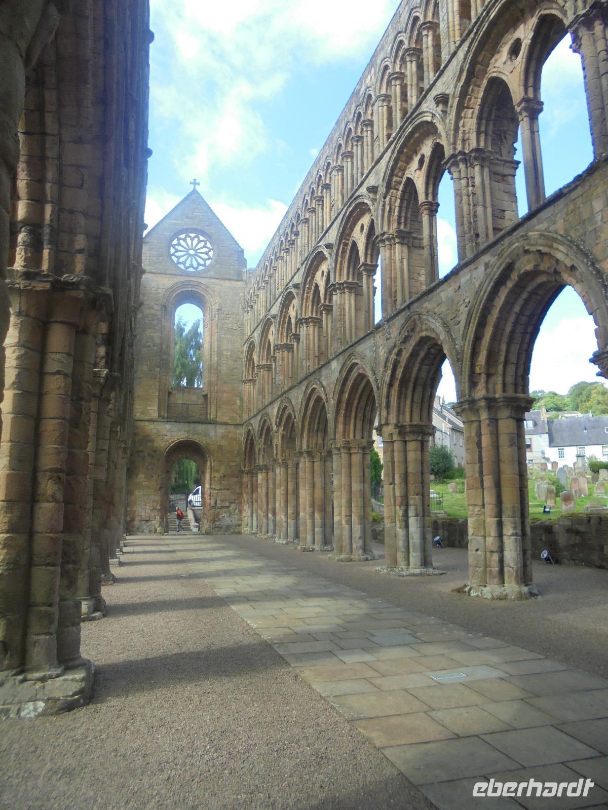 Höhepunkt unseres Aufenthaltes in Jedburgh war aber der Besuch der gewaltigen Abteiruine, der größten der sogenannten Border-Abbeys. Stolz, trotzig und vornehm überragt Jedburgh-Abbey das Flußtal. Die Rerste des ehemaligen Augustinerklosters stammen aus dem 12. Und 13. Jh. und zeigen Stilelemente der Romanik wie der Frühgotik, in der gutr erhaltenen Fassade eine schöne Fensterrosette. Immer noch - trotz der Unvollständigkeit einer Ruine - hat das Bauwerk eine gewaltige Raumwirkung.