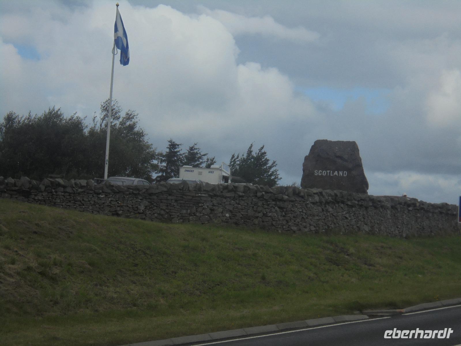 Für den Besuch hier hatten wir genügend Zeit, auch noch für einen Bummel und Freizeit in der kleinen Jedburgher Altstadt, die ein altes - derzeit mit Bauarbeiten versperrtes - Gefängnis, ein historischem Marktkreuz und ein historisches Haus besitzt, von dem die Leute behaupten, Königin Maria Stuart habe vor ihrer Flucht nach England hier gewohnt. Jetzt ging es unaufhaltsam fort von Schottlans! Etwas südlich von Jedburgh stoppten wir noch am Grenzstein - jenem berühmten, „Carter Bar" genannten Ort, wo sich passenderweise auch heute wieder ein Dudelsackspieler einfand und für ein typisch schottisches Abschiedsständchen sorgte.