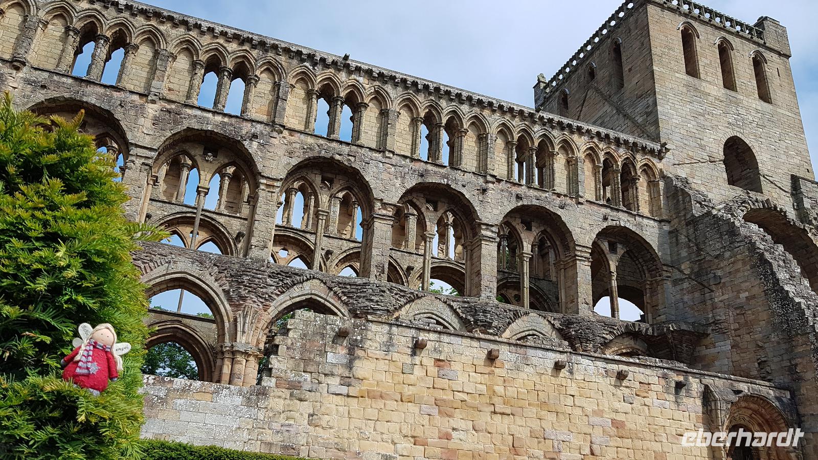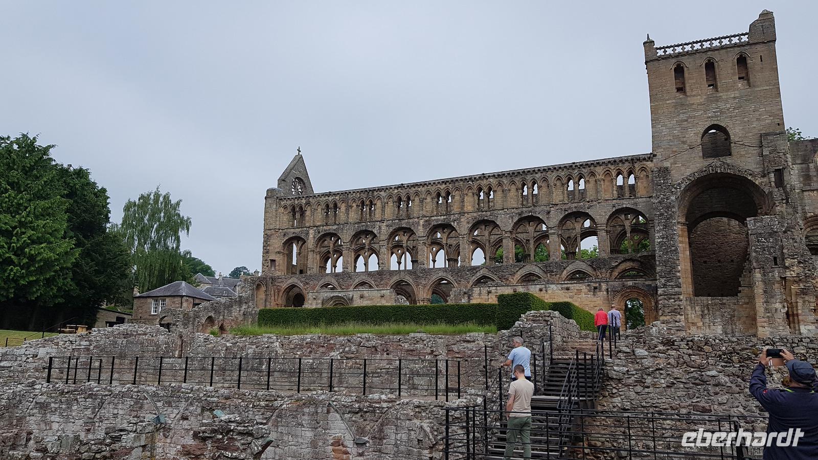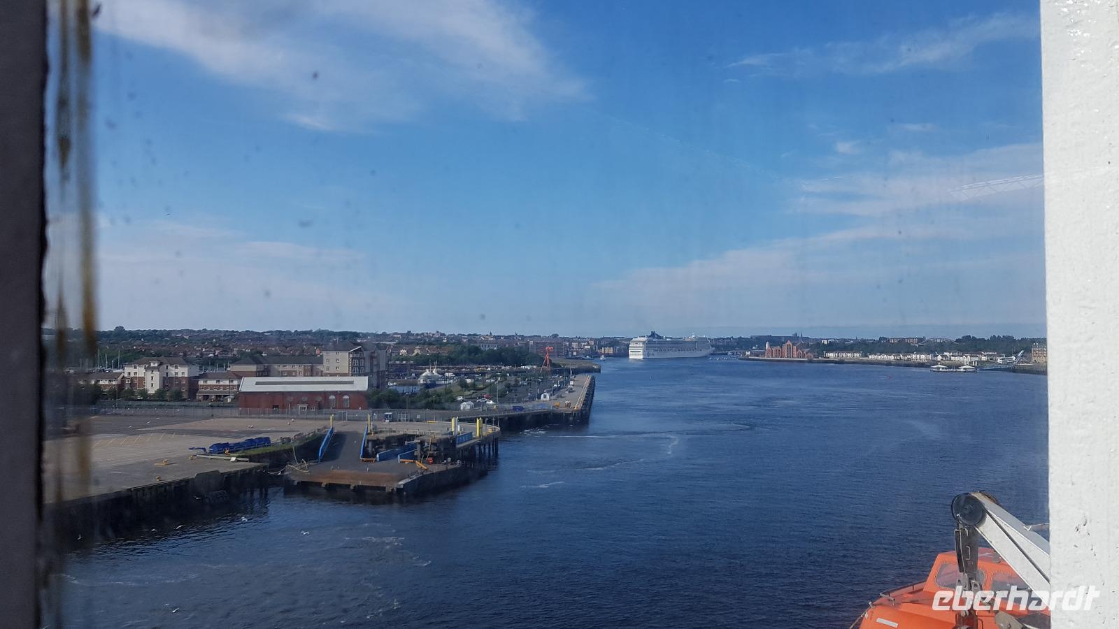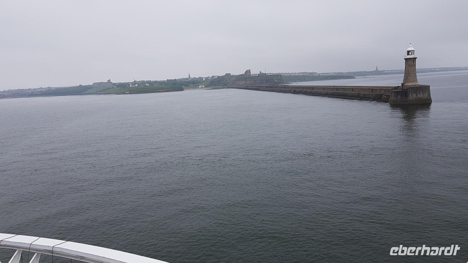 Zum Frühstück sehen wir uns alle noch einmal, dann verabschieden wir uns voneinander. Die Bus-Gruppe fährt zuerst los, dann werden auch die Flug-Gäste von ihren Transfers zum Flughafen abgeholt. Bis Frankfurt klappt auch alles mit den Flügen, dann aber verhindern Unwetter vor Ort die Weiterflüge. Es bleibt also eine abenteuerliche Reise. Die Bus-Gruppe hat es da besser, Unsere Fahrt Richtung Süden führt uns durch die Lowlands in die Border-Region, die Grenzregion. Hier besuchen wir kurz Melrose Abbey, eine der 4 Border-Abbeys. Mit jeder Menge Fotos im Gepäck geht es weiter nach Jedburgh. Hier ist genug Zeit, die hiesige Abbey zu besuchen, also holen wir Tickets und Audio Guides und besuchen diesen geschichtsträchtigen Ort. Einige nutzten auch die Zeit für einen kleinen Abstecher zum Haus der Maria Stuart, hier hatte sie einst übernachtet auf ihrer Flucht und daher gibt es ein kleines Museum. Dann geht es weiter, hinauf die Cheviot Hills nach Carter Bar- der Grenze zwischen England und Schottland. Natürlich ist unser Freund, der Dudelsack-Spieler da und verabschiedet uns herzlich mit einigen bekannten Weisen. Da sind wir also wieder in England, ein kurzer Stopp noch mit Bordservice inmitten der Weiden hier, dann erreichen wir auch schon Newcastle. Perfektes Timing: wir können ohne Wartezeiten einchecken, fahren gemeinsam durch die Zollkontrolle und gehen an Bord unserer Fähre. Zum Abendessen treffen wir uns wieder und hören hier die Hiobsbotschaften von den Fluggästen. Weitere Unwetter in Frankfurt führten zu Flugausfällen. In der Hoffnung, dass auch sie gut nach Hause gebracht werden genießen wir unser Dinner vom Buffett und lassen den Tag ruhig ausklingen.