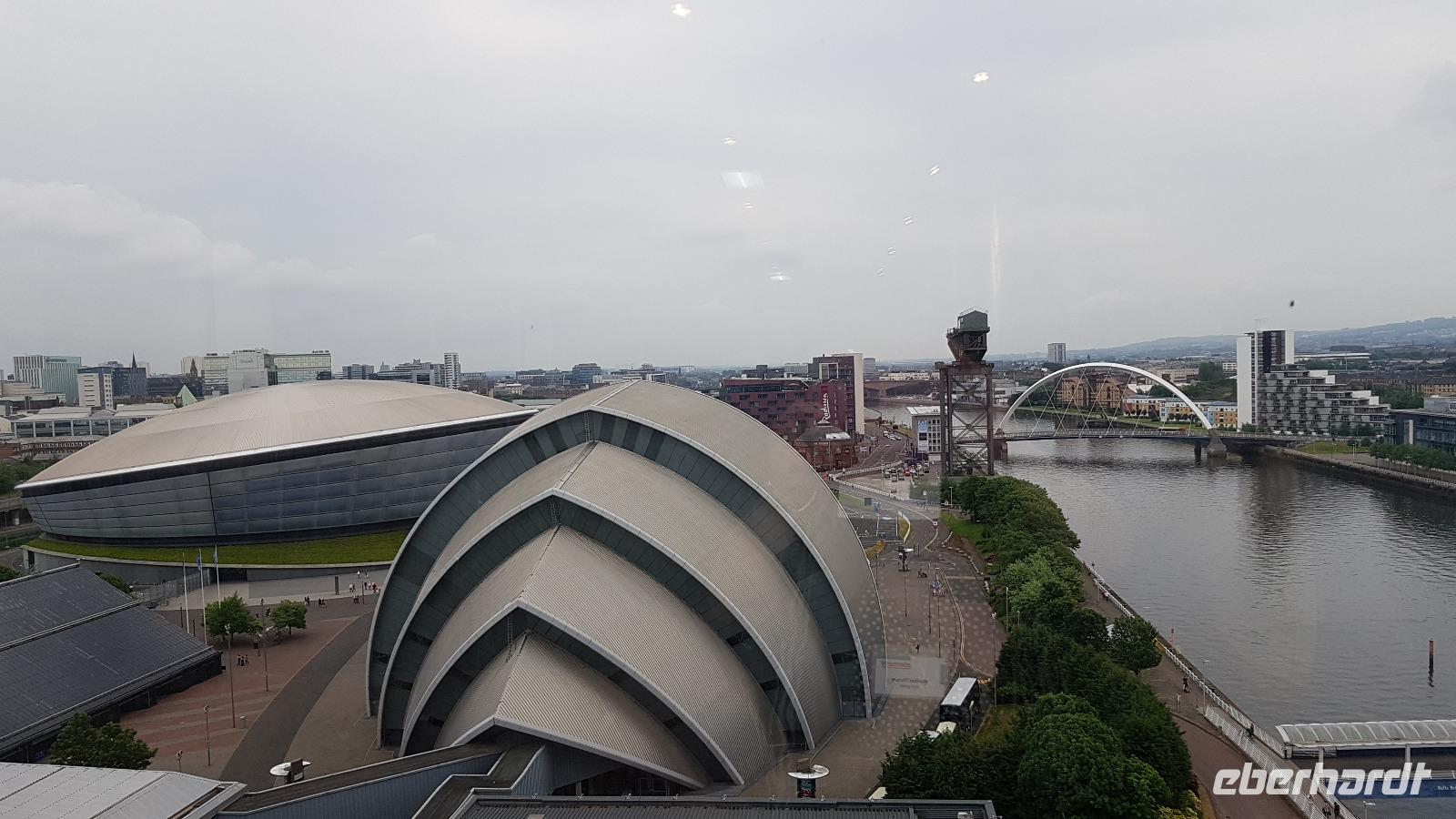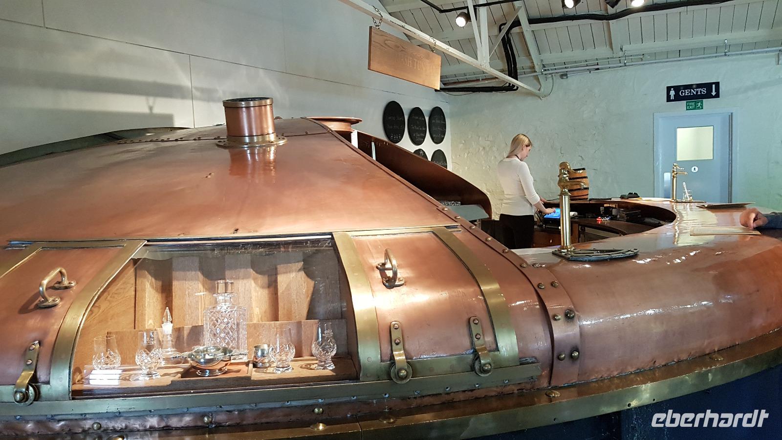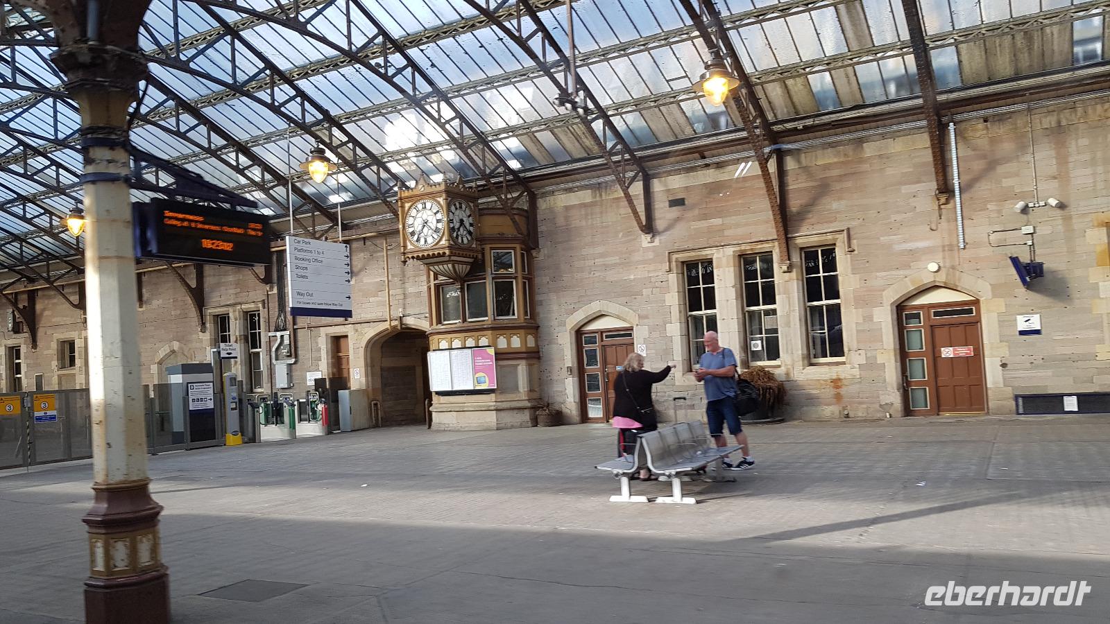 Am Morgen wartete eine böse Überraschung auf uns. Wir hatte Thoralf, unseren Busfahrer bereits vermisst beim Frühstück, da winkte er mich sichtlich schockiert hinaus. Vandalen hatten die Scheibe unseres Busses eingeschlagen- und das auf einem bewachten und beleuchteten Hotel-Parkplatz! Nun war guter Rat teuer, die Polizei rasch verständigt- aber wie kommen wir an eine neue Scheibe für den Bus- und wann ist der dann fertig? Fragen über Fragen, da hieß es erst einmal ruhig bleiben. Wir ließen unsere Koffer im Hotel einschließen denn eigentlich wollten wir ja via Stirling nach Newtonmore und dort übernachten. Es gab Kaffee und Tee für alle und wir warteten... Zwischenzeitlich nutzen wir die Chance: für einen verlorengegangenen Ausweis mußten neue Passbilder her, also ab ins Taxi, in die Stadt und retour. Als auch am späten Vormittag noch nichts entschieden war besuchten wir kurzentschlossen die Clydeside Distillery in Glasgow. Ich hatte vorher angefragt und so konnten wir, aufgeteilt in 2 Gruppen, diese neue Anlage besichtigen. Sie wurde erst im November 2017 in Betrieb genommen, dafür wurde das alte Pumpenhaus des Queensdock umgebaut und erweitert. Mit einer Verkostung je eines Whiskys aus den Lowlands, den Highlands und von der Insel Islay konnte sich jeder selber davon überzeugen, welchen Einfluß das Mälzen mit und ohne Torf und die Wahl der Fässer auf den späteren Geschmack haben. Nur den hauseigenen Whisky konnten wir nicht probieren- logisch, schließlich muss der mindestens 3 Jahre und 1 Tag in Eichenfässern reifen bevor er sich Whisky nennen darf. Da heißt es also : Wiederkommen! Es war bereits Nachmittag und immer mehr zeichnete sich ab, dass unser Bus nicht fertig wird. Vergeblich haben auch alle Verantwortlichen im Hintergrund versucht, einen Ersatzbus zu chartern, uns blieb also nichts anderes übrig, als den Zug zu nehmen. Doch erst einmal war Stärkung angesagt: das Hotel bereitete für uns Kaffee und Tee sowie Sandwiches. Dann ging es los, mit dem Taxi zum Bahnhof Queenstreet, hier Tickets holen (Gott sei dank gibt es überall außerordentlich freundliche Service-Mitarbeiter) und los zum Bahnsteig. Dann kam auch schon der Zug und wir enterten die Abteile, als wir das Zeichen bekamen, einsteigen zu können. Regelrechte Kofferburgen haben wir auf den Sitzen bauen müssen, es durfte keiner im Gang stehen bleiben, denn da kam ja noch die nette Frau mit ihrem Wagen für Erfrischungen, Kaffee und Snacks. In Stirling leerte sich der Zug bereits etwas und wir konnten das Castle und das Wallace Monument vom Zug aus sehen. Unsere Fahrt führte uns dann via Perth und Bair Atholl durch den Cairngorn Nationalpark bis nach Aviemore. Hier hieß es dann nach zwei-einhalb-stündiger Zugfahrt aussteigen und in Taxis zum Hotel in Newtonmore umsteigen. Wieder erwies es sich als ausgesprochen schwierig, das viele Gepäck und die Passagiere in ein Fahrzeug zu bekommen. So mußten denn auch die letzten ziemlich lange auf ihr Taxi warten. Sie schafften es dann endlich gegen 21:30 Uhr auch, im Hotel anzukommen, alle anderen hatten bereits ihre Zimmer bezogen und machten es sich bei Live-Musik im Pub unten gemütlich. Groß dann die Freude, als es noch einmal Sandwiches für alle gab und mit einem zünftigen „Black", einem dunklen Bier, stießen wir auf diesen abenteuerlichen Tag an.