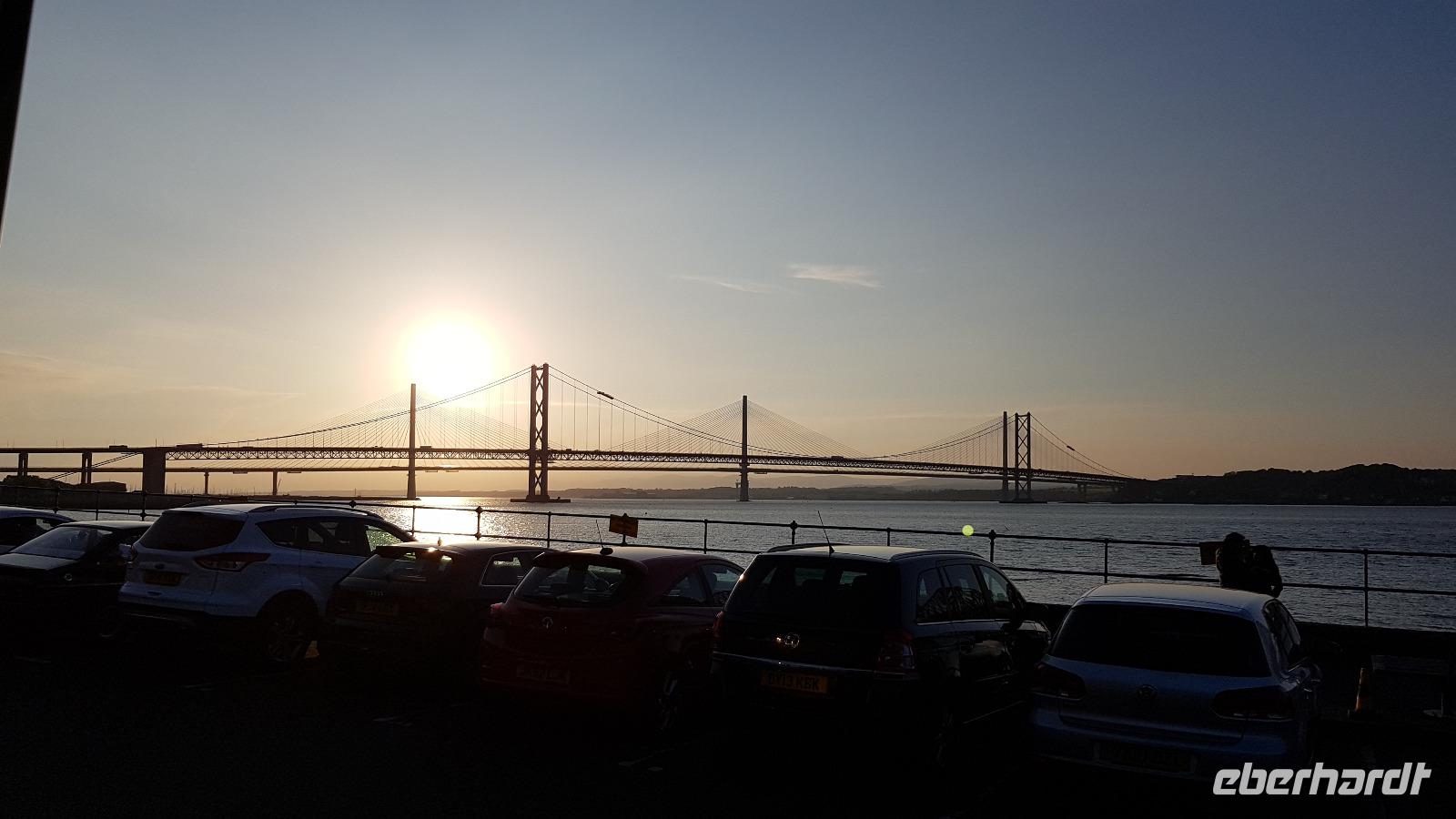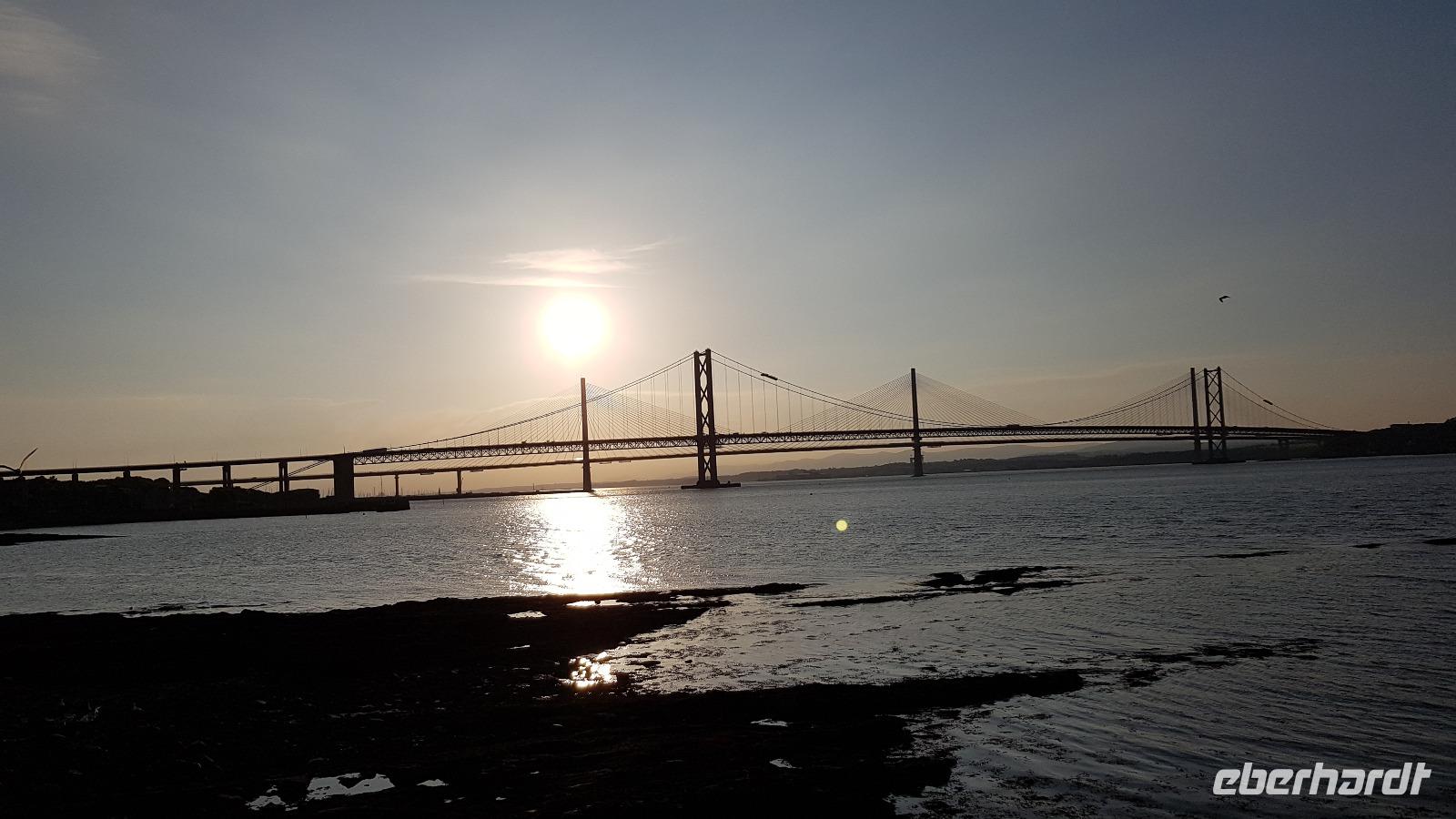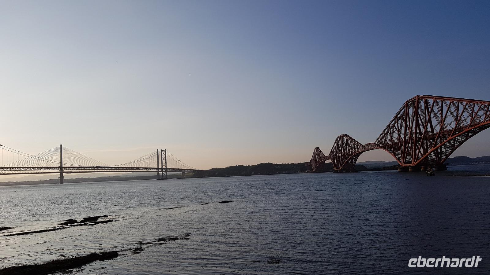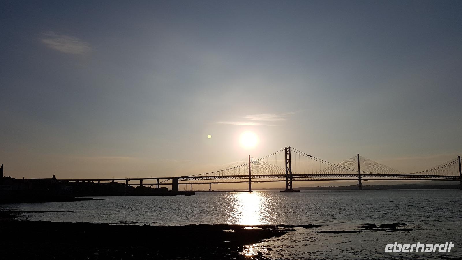 Es ist nix passiert letzte Nacht und so kann der Tag heute mit dem Ausflug nach Edinburgh beginnen. Hannah wartet auf uns am Waterloo-Place. Sie wird uns heute durch ihre Stadt führen. Und wir beginnen gleich am Carlton Hill mit einem kleinen Spaziergang den Hügel hinauf. Hier verstehen wir, warum es heißt „Akropolis", der Nachbau ist zwar nur zur Hälfte fertig geworden- na gut. Gleich daneben das Kuppelgebäude, das einmal eine Sternwarte werden sollte- aber mit dem Nebel von der See und dem Smog über der Stadt war Sterne gucken schwierig- man verlegte die Sternwarte und aus dem Gebäude wird nun ein Künstler-Cafe. Interessant auch die Säule für Admiral Nelson mit der Kugel auf dem Dach, sie sollte mittags 12 Uhr herabfallen, damit alle auf See es sehen und ihre Instrumente kalibrieren können- wie gesagt, bei Nebel und Smog keine gute Idee für optische Informationen...Man einigte sich schließlich auf die Kanone am Castle, die nun mittags 1 Uhr einen Schuß abgibt (12 wären auf Dauer zu teuer, wir sind in Schottland, daher die Verschiebung auf 1 Uhr). Wir jedenfalls genießen die grandiose Aussicht zumal Hannah noch erzählt, dass in den letzten Tagen Dauernebel herrschte und nix zu sehen war. Unsere Fahrt führt uns dann weiter vorbei an General Wellington auf seinem Pferd Kopenhagen, dem Sir Walter Scott Monument, mit 60 Metern Höhe das höchste Denkmal, das je einem Literaten gebaut wurde. Über die Hannover Street kommen wir zum Charlotte Square. Hier findet einmal im Jahr das Bücher-Festival statt. Am Holyrood Palace schließlich legen wir eine kleine Pause ein bevor wir über die Royal Mile fahren, das National-Museum sehen und natürlich auch die Geschichte von Bobby hören, dem kleinen Hund, der seinem Herrchen 14 Jahre die Treue hielt und an seinem Grab wachte. Am Uni-Viertel vorbei erreichten wir den Grassmarket - die Hinrichtungsstätte früher. Dann thronte sie über uns- Edinburgh Castle- die stolze Burg auf einem der 7 Hügel der Stadt. Hier bekamen wir unsere Tickets und jeder konnte die Burg individuell erkunden. Ihre Freizeit genossen viele von uns im Freien in einem Cafe oder bummelten durch die Royal Mile. Am späten Nachmittag trafen wir uns und fuhren Richtung Leath, heute ein Stadtteil von Edinburgh. In der Nähe war der Pub, in dem wir heute Abend gemeinsam essen wollen aber wir haben noch Zeit und so statten wir der Britannia einen kurzen Besuch ab. Die königliche Yacht liegt hier seit 1997 als Museumsschiff und man sagt, dass die Queen Tränen in den Augen hatte, als sie das letzte Mal von Bord ging. Im „The Mash Tun", das heißt soviel wie Maischebottich, sind wir dann herzlich willkommen und man serviert uns ein leckeres 3-Gänge-Menü. Wir lassen es uns gut gehen aber spätestens beim Dessert merken wir, dass es doch ein langer Tag heute war. So entschließen wir uns zur Rückkehr in unser Hotel. So einfach können wir diesen letzten gemeinsamen Tag nicht ausklingen lassen dachten wir (Thoralf und ich) uns und so fuhren wir noch hinauf nach Queensferry. Was für ein Glück- die Sonne am Untergehen und alle 3 Brücken vor uns. Wenn das kein toller Foto-Stopp zum Abschluss unserer Reise ist! Alle sind restlos begeistert und manch einer kann sich gar nicht trennen, so schön ist es. Die Überraschung ist uns also gelungen und wird noch mit einem Puschmannschen Heidelbeer- oder Kräuterlikör gekrönt. Auf dem Weg ins Hotel ist es dann wirklich Zeit Adieu zu sagen und alle gemeinsam singen wir ein Abschiedslied: Auld lang Syne.