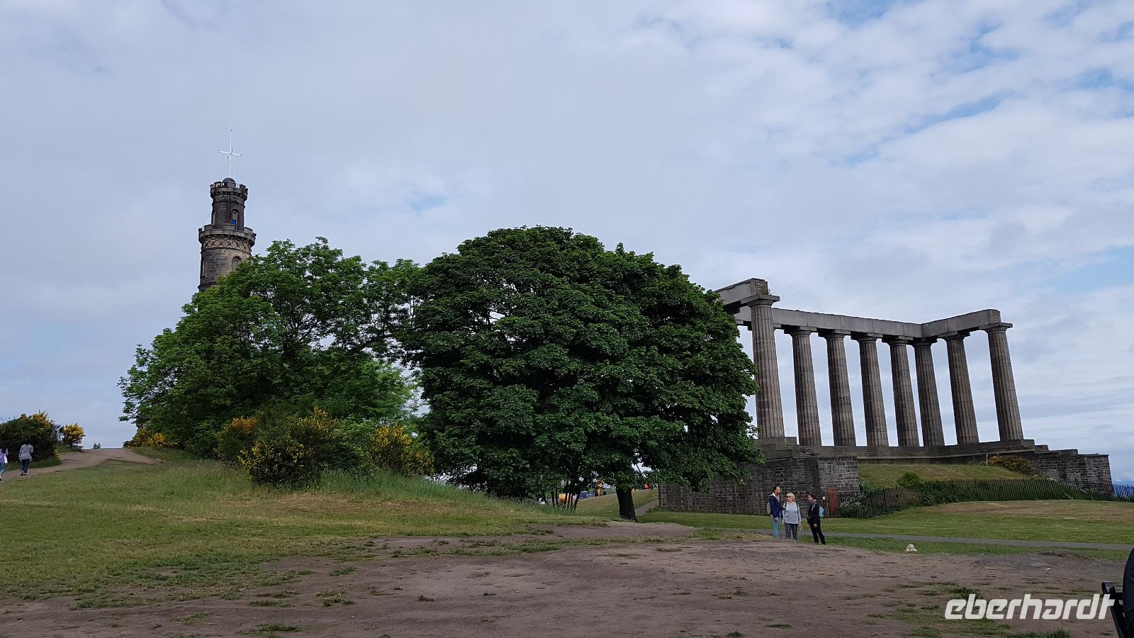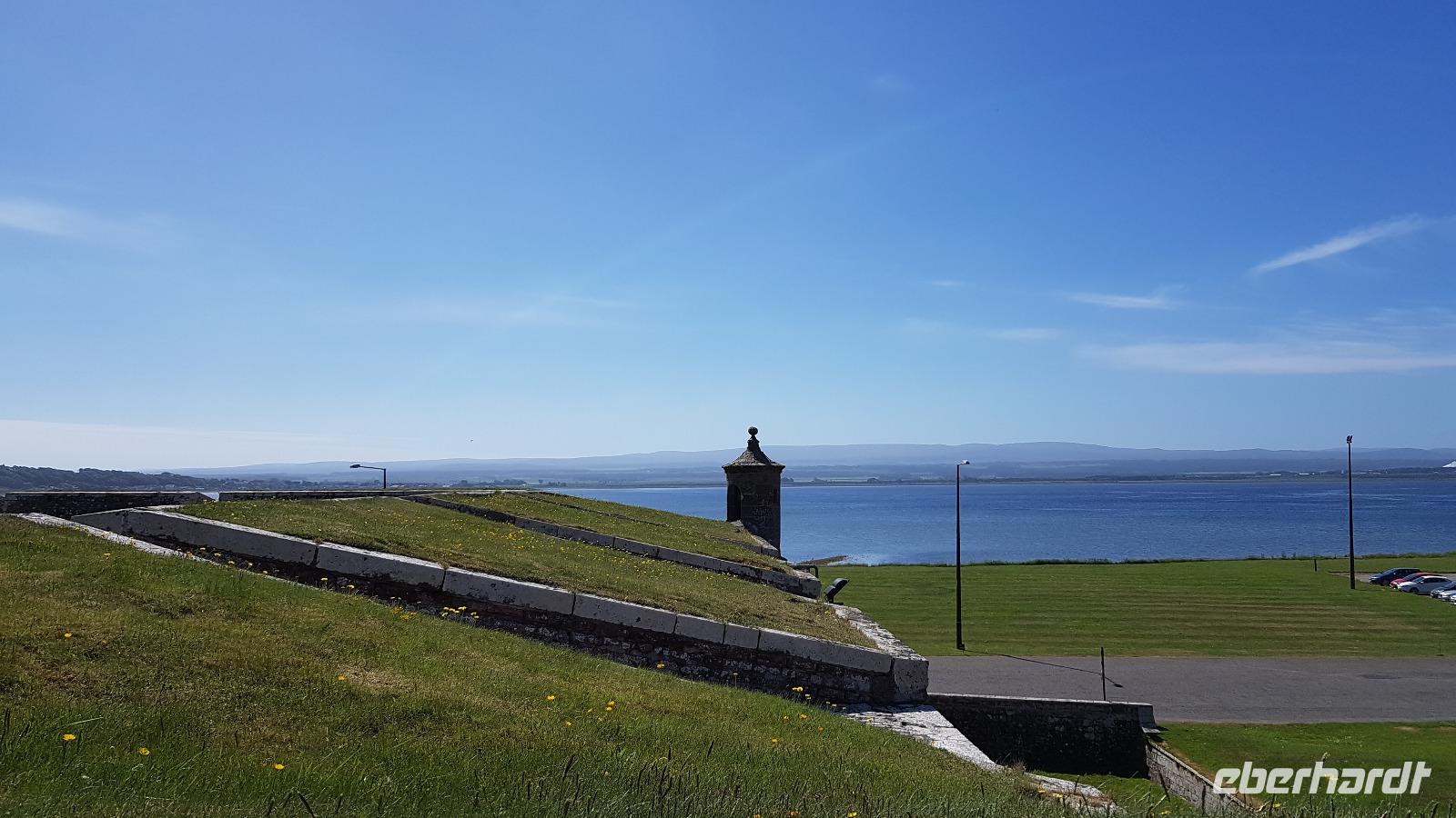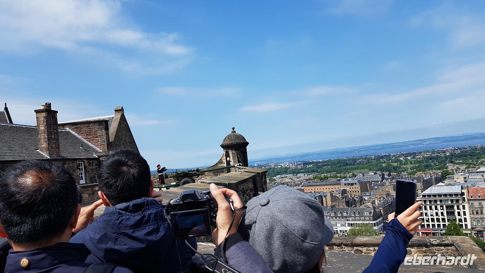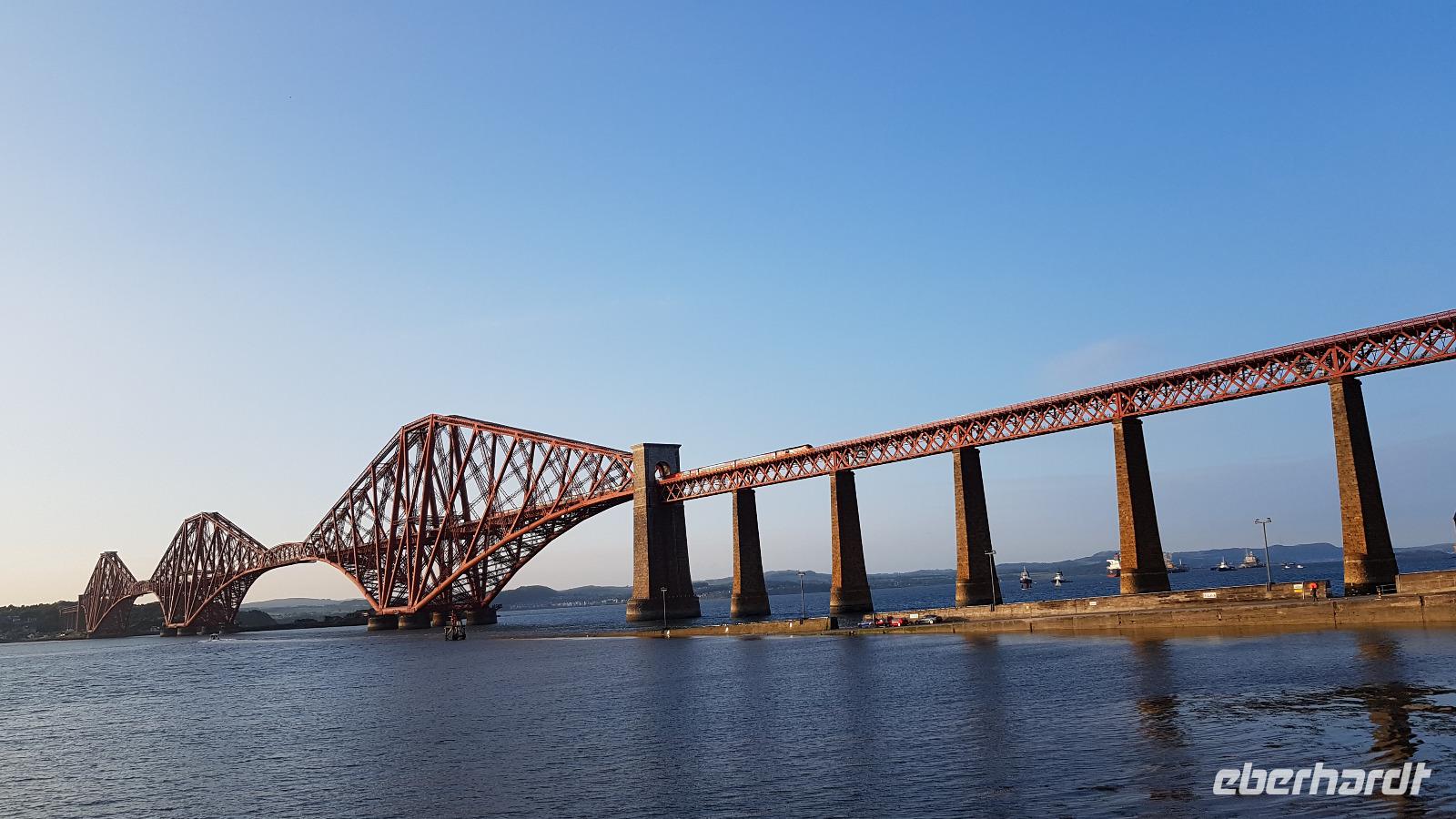 Es ist nix passiert letzte Nacht und so kann der Tag heute mit dem Ausflug nach Edinburgh beginnen. Hannah wartet auf uns am Waterloo-Place. Sie wird uns heute durch ihre Stadt führen. Und wir beginnen gleich am Carlton Hill mit einem kleinen Spaziergang den Hügel hinauf. Hier verstehen wir, warum es heißt „Akropolis", der Nachbau ist zwar nur zur Hälfte fertig geworden- na gut. Gleich daneben das Kuppelgebäude, das einmal eine Sternwarte werden sollte- aber mit dem Nebel von der See und dem Smog über der Stadt war Sterne gucken schwierig- man verlegte die Sternwarte und aus dem Gebäude wird nun ein Künstler-Cafe. Interessant auch die Säule für Admiral Nelson mit der Kugel auf dem Dach, sie sollte mittags 12 Uhr herabfallen, damit alle auf See es sehen und ihre Instrumente kalibrieren können- wie gesagt, bei Nebel und Smog keine gute Idee für optische Informationen...Man einigte sich schließlich auf die Kanone am Castle, die nun mittags 1 Uhr einen Schuß abgibt (12 wären auf Dauer zu teuer, wir sind in Schottland, daher die Verschiebung auf 1 Uhr). Wir jedenfalls genießen die grandiose Aussicht zumal Hannah noch erzählt, dass in den letzten Tagen Dauernebel herrschte und nix zu sehen war. Unsere Fahrt führt uns dann weiter vorbei an General Wellington auf seinem Pferd Kopenhagen, dem Sir Walter Scott Monument, mit 60 Metern Höhe das höchste Denkmal, das je einem Literaten gebaut wurde. Über die Hannover Street kommen wir zum Charlotte Square. Hier findet einmal im Jahr das Bücher-Festival statt. Am Holyrood Palace schließlich legen wir eine kleine Pause ein bevor wir über die Royal Mile fahren, das National-Museum sehen und natürlich auch die Geschichte von Bobby hören, dem kleinen Hund, der seinem Herrchen 14 Jahre die Treue hielt und an seinem Grab wachte. Am Uni-Viertel vorbei erreichten wir den Grassmarket - die Hinrichtungsstätte früher. Dann thronte sie über uns- Edinburgh Castle- die stolze Burg auf einem der 7 Hügel der Stadt. Hier bekamen wir unsere Tickets und jeder konnte die Burg individuell erkunden. Ihre Freizeit genossen viele von uns im Freien in einem Cafe oder bummelten durch die Royal Mile. Am späten Nachmittag trafen wir uns und fuhren Richtung Leath, heute ein Stadtteil von Edinburgh. In der Nähe war der Pub, in dem wir heute Abend gemeinsam essen wollen aber wir haben noch Zeit und so statten wir der Britannia einen kurzen Besuch ab. Die königliche Yacht liegt hier seit 1997 als Museumsschiff und man sagt, dass die Queen Tränen in den Augen hatte, als sie das letzte Mal von Bord ging. Im „The Mash Tun", das heißt soviel wie Maischebottich, sind wir dann herzlich willkommen und man serviert uns ein leckeres 3-Gänge-Menü. Wir lassen es uns gut gehen aber spätestens beim Dessert merken wir, dass es doch ein langer Tag heute war. So entschließen wir uns zur Rückkehr in unser Hotel. So einfach können wir diesen letzten gemeinsamen Tag nicht ausklingen lassen dachten wir (Thoralf und ich) uns und so fuhren wir noch hinauf nach Queensferry. Was für ein Glück- die Sonne am Untergehen und alle 3 Brücken vor uns. Wenn das kein toller Foto-Stopp zum Abschluss unserer Reise ist! Alle sind restlos begeistert und manch einer kann sich gar nicht trennen, so schön ist es. Die Überraschung ist uns also gelungen und wird noch mit einem Puschmannschen Heidelbeer- oder Kräuterlikör gekrönt. Auf dem Weg ins Hotel ist es dann wirklich Zeit Adieu zu sagen und alle gemeinsam singen wir ein Abschiedslied: Auld lang Syne.