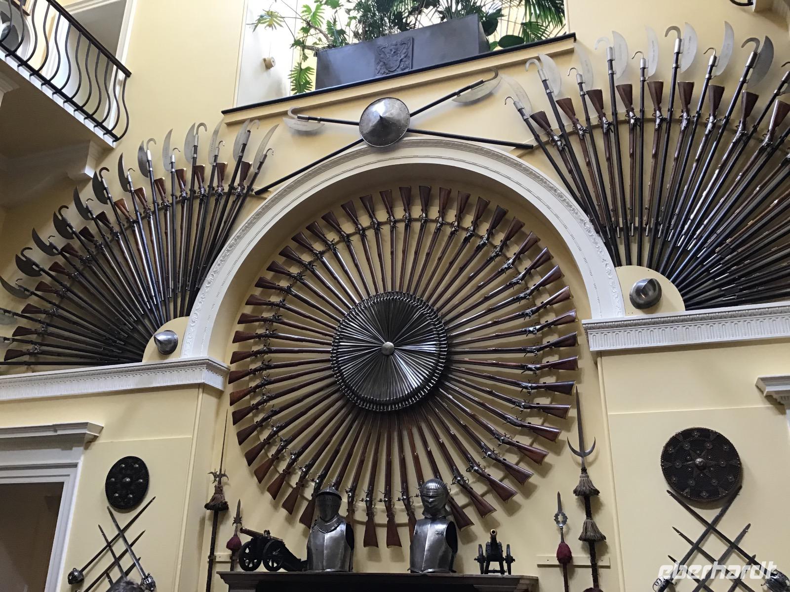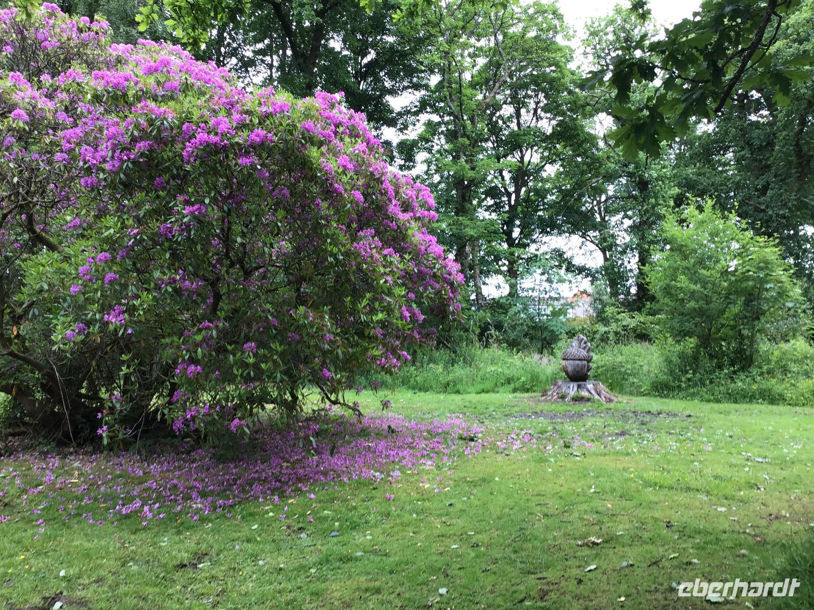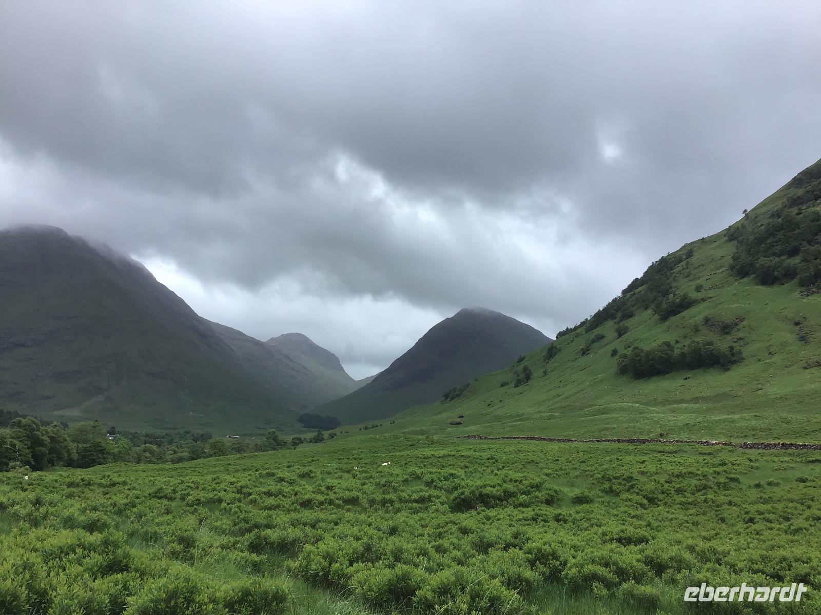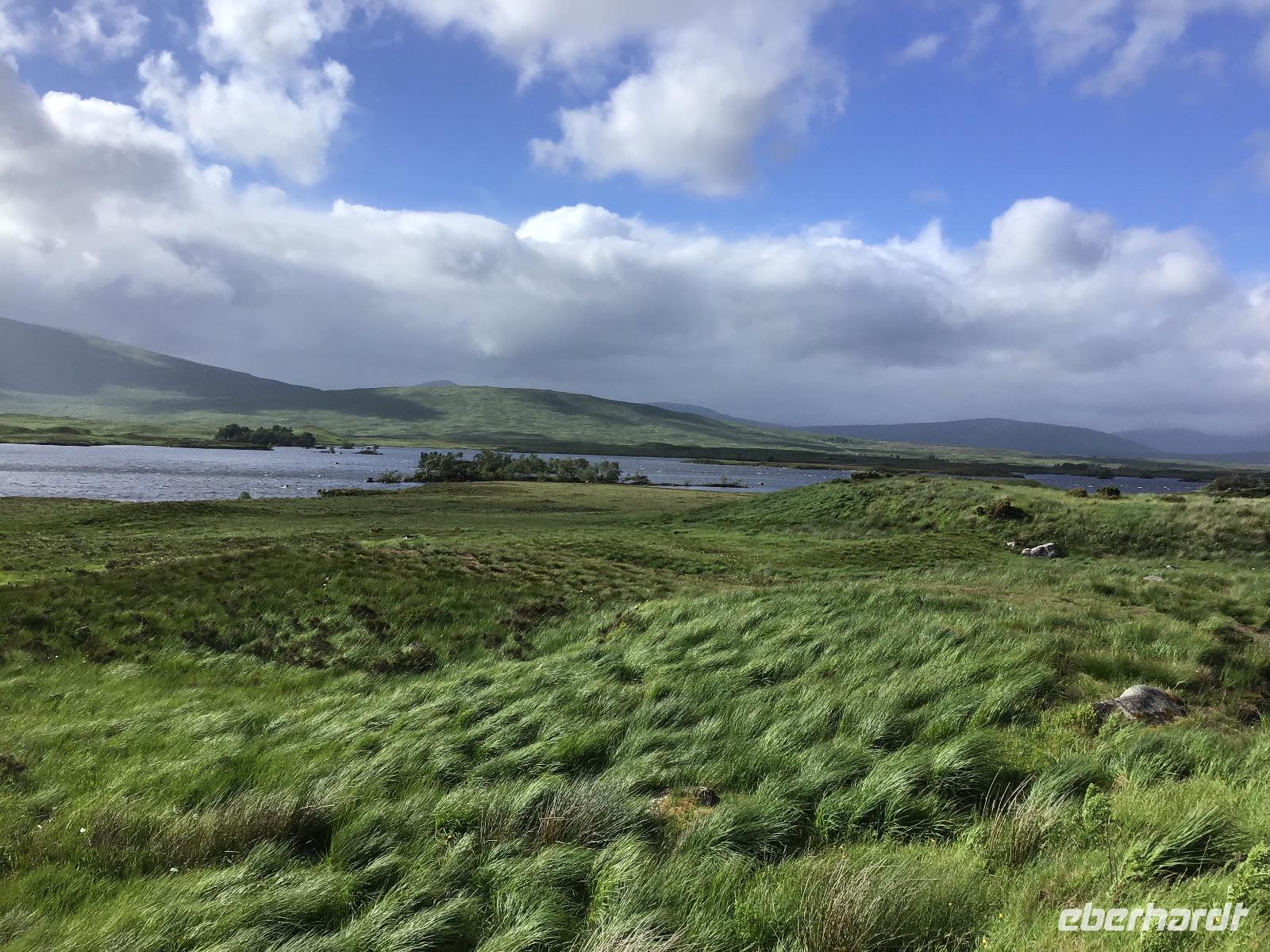 Zum Frühstück gibt es schottische Spezialitäten, zum Beispiel Black Pudding, dicke Bohnen, Würstchen und Hash Browns. Für die, die das nicht mögen, sind auch Rührei, Weißbrot oder Brötchen im Angebot. Um acht machen wir uns auf den Weg. Unser erstes Ziel ist der Loch Lomond. Im Balloch Castle Country Park unternehmen wir einen gemütlichen Vormittagsspaziergang. Nach zwanzig Minuten erreichen wir das Balloch Castle. Von hier haben wir einen traumhaften Ausblick auf den Loch Lomond. Das Wetter ist typisch schottisch: wechselhaft. Dicke Wolken, Nieselregen und Sonne wechseln sich ab. Als wir am See ankommen, müssen wir uns noch unter unsere Schirme flüchten. Doch kaum wenden wir uns zum Gehen, zeigt sich Klärchen und beleuchtet Loch Lomond. Nach einem gemütlichen Spaziergang zurück zum Parkplatz fahren wir weiter nach Inverary. Hier besichtigen wir das Castle mit seiner beeindruckenden Waffensammlung. Sogar ein paar Dolchscheiden aus dem Nachlass von Rob Roy, dem schottischen Robin Hood, sind hier zu bewundern. In Oban lädt der kleine Hafen zum Verweilen ein. Nachmittags durchqueren wir Glenn Coe, das Tal der Tränen und denken an das Massaker, das sich hier Mitte des 17. Jahrhunderts ereignet hat. Heute ist es friedlich hier. Viele Lochs (Seen) und Glenns (Täler) warten darauf, fotografiert zu werden und in unsere Reisetagebücher zu wandern.