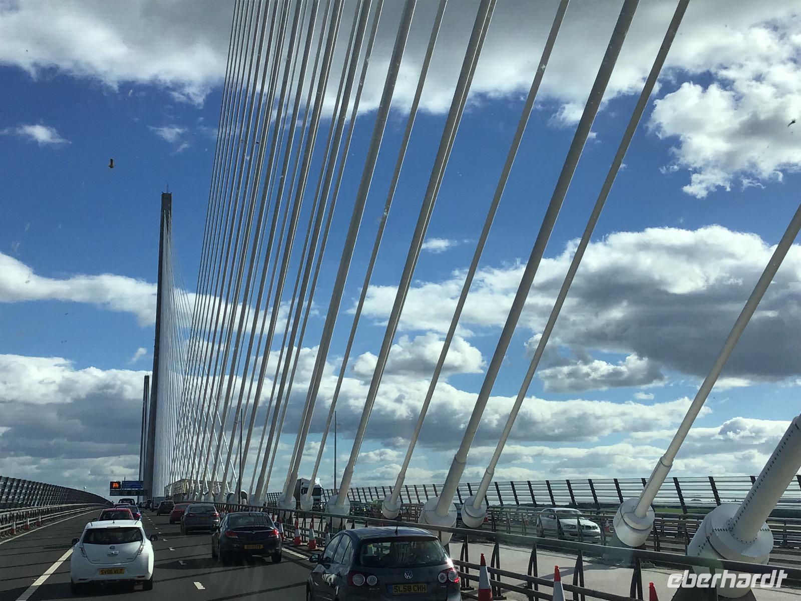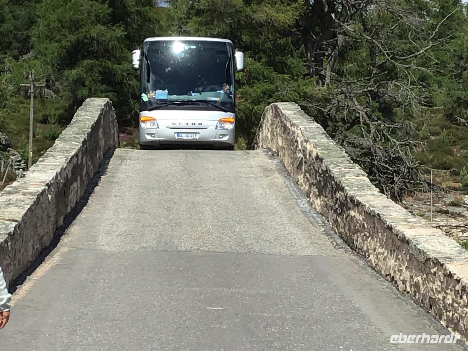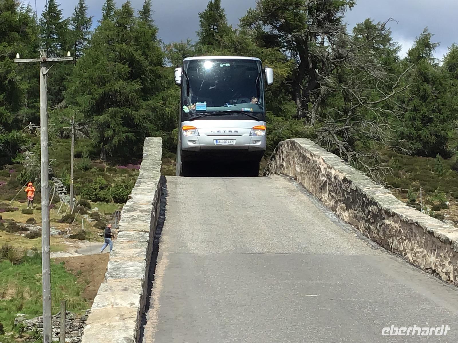 Der Genuss der einzigartigen schottischen Landschaft steht heute im Mittelpunkt unseres Tagesprogramms. Doch bevor wir uns zurück lehnen, gibt es eine weitere Überraschung. Wir besuchen eine Böttcherei. Die Speyside Cooperation ist die einzige Böttcherei, die zum Whisky-Trail gehört. Alles andere sind Whisky-Brennereien. Rechts und links von der Straße können wir die einzelnen Brennereien sehen. In der Böttcherei werden gebrauchte Fässer repariert und wieder einsatzfähig gemacht. Zunächst schauen wir einen Film, der mit leichter Animation arbeitet. Es zischt aus einem Rohr und wir werden rot und heiß angestrahlt, als im Film ein Fass ausgebrannt wird. Nach dem Film können wir einen Blick in die Werkstatt werfen. In diesem Jahr sind es 14 Arbeiter und 4 Lehrlinge, die hier schuften. Bezahlt werden sie pro Fass, das heißt, Leistung zahlt sich aus. Wie wir sehen, ist die Arbeit sehr hart. Der älteste Arbeiter ist 65 Jahre alt. Er arbeitet aber nur noch drei Tage in der Woche. Auch mit einem Weltmeister glänzt der Betrieb. John kann ein Fass in drei Minuten und drei Sekunden binden. Na: Herzlichen Glückwunsch! Fünf Minuten von der Böttcherei entfernt, steht die Keksfabrik Walkers Shortbread. Nun, wir können es uns nicht entgehen lassen, hier einen Stopp zum Einkaufen einzulegen. Dann beginnt unsere Fahrt durch den Cairngorm Nationalpark. Zu Vivaldis „Vier Jahreszeiten" schwebt unser Bus durch die malerische, schon von Theodor Fontane gelobte, Landschaft. Plötzlich ein STOPP! Vor uns liegt eine Brücke mit einem spitzen Winkel. Wie soll der Bus da nur unbeschadet rüberkommen? Wir steigen aus und lassen Christian allein wirbeln. Wir wollen das Experiment mit unseren Kameras dokumentieren. Fast sieht es aus, als ob der vordere Teil des Busses vom Boden abhebt, bevor er nach vorne kippt und der hintere Teil nach oben stößt. Aber es klappert und knirscht nichts, Christian und der Bus kommen heil hinüber. Na dann können wir ja auch wieder einsteigen. In Braemar, dem Zentrum der Highland Games legen wir unseren nächsten Stopp ein. Wer will, kann im Hungrigen Highlander Fish and Ships essen oder alternativ zum Stadion laufen. Dort befindet sich unter anderem eine königliche Loge, denn die Königsfamilie mit Charles und Camilla kommt jährlich im September hierher, um sich die Spiele anzusehen. Nun müssen wir uns aber auf den Weg machen, bis zum Firth of Forth ist es noch weit. Als wir diesen erreichen, stellen wir fest, dass die neue Autobrücke endlich eröffnet wurde. Wir überqueren diese und legen auf der anderen Seite unseren letzten Fotostopp für heute ein. Drei Brücken, eine aus dem 19., eine aus dem 20. und eine aus dem 21. Jahrhundert sind hier dicht nebeneinander zu sehen und bilden ein eindrucksvolles Ensemble.