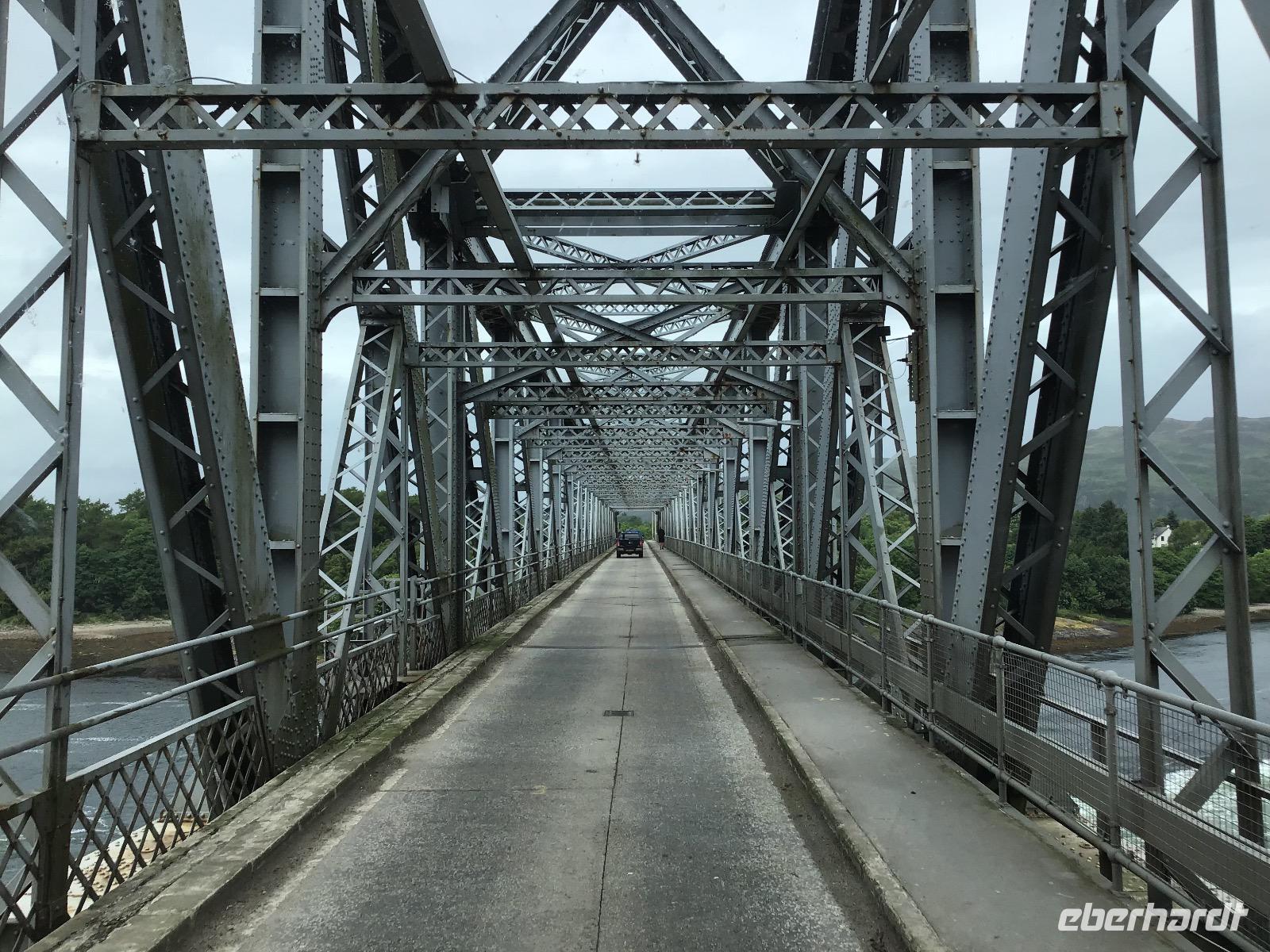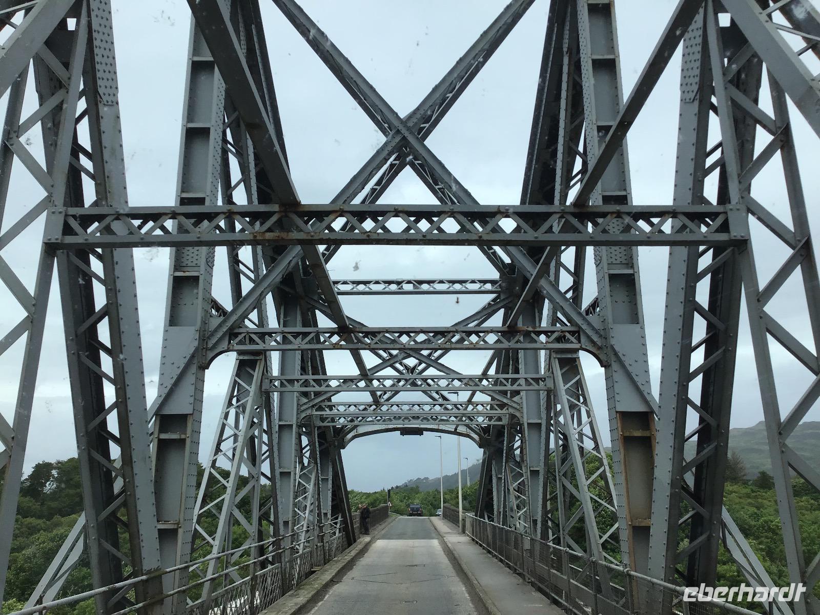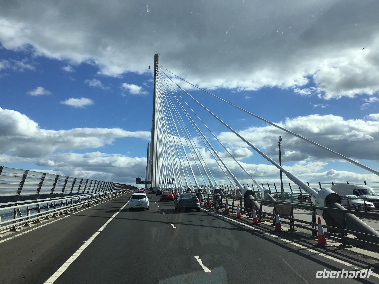 Der Genuss der einzigartigen schottischen Landschaft steht heute im Mittelpunkt unseres Tagesprogramms. Doch bevor wir uns zurück lehnen, gibt es eine weitere Überraschung. Wir besuchen eine Böttcherei. Die Speyside Cooperation ist die einzige Böttcherei, die zum Whisky-Trail gehört. Alles andere sind Whisky-Brennereien. Rechts und links von der Straße können wir die einzelnen Brennereien sehen. In der Böttcherei werden gebrauchte Fässer repariert und wieder einsatzfähig gemacht. Zunächst schauen wir einen Film, der mit leichter Animation arbeitet. Es zischt aus einem Rohr und wir werden rot und heiß angestrahlt, als im Film ein Fass ausgebrannt wird. Nach dem Film können wir einen Blick in die Werkstatt werfen. In diesem Jahr sind es 14 Arbeiter und 4 Lehrlinge, die hier schuften. Bezahlt werden sie pro Fass, das heißt, Leistung zahlt sich aus. Wie wir sehen, ist die Arbeit sehr hart. Der älteste Arbeiter ist 65 Jahre alt. Er arbeitet aber nur noch drei Tage in der Woche. Auch mit einem Weltmeister glänzt der Betrieb. John kann ein Fass in drei Minuten und drei Sekunden binden. Na: Herzlichen Glückwunsch! Fünf Minuten von der Böttcherei entfernt, steht die Keksfabrik Walkers Shortbread. Nun, wir können es uns nicht entgehen lassen, hier einen Stopp zum Einkaufen einzulegen. Dann beginnt unsere Fahrt durch den Cairngorm Nationalpark. Zu Vivaldis „Vier Jahreszeiten" schwebt unser Bus durch die malerische, schon von Theodor Fontane gelobte, Landschaft. Plötzlich ein STOPP! Vor uns liegt eine Brücke mit einem spitzen Winkel. Wie soll der Bus da nur unbeschadet rüberkommen? Wir steigen aus und lassen Christian allein wirbeln. Wir wollen das Experiment mit unseren Kameras dokumentieren. Fast sieht es aus, als ob der vordere Teil des Busses vom Boden abhebt, bevor er nach vorne kippt und der hintere Teil nach oben stößt. Aber es klappert und knirscht nichts, Christian und der Bus kommen heil hinüber. Na dann können wir ja auch wieder einsteigen. In Braemar, dem Zentrum der Highland Games legen wir unseren nächsten Stopp ein. Wer will, kann im Hungrigen Highlander Fish and Ships essen oder alternativ zum Stadion laufen. Dort befindet sich unter anderem eine königliche Loge, denn die Königsfamilie mit Charles und Camilla kommt jährlich im September hierher, um sich die Spiele anzusehen. Nun müssen wir uns aber auf den Weg machen, bis zum Firth of Forth ist es noch weit. Als wir diesen erreichen, stellen wir fest, dass die neue Autobrücke endlich eröffnet wurde. Wir überqueren diese und legen auf der anderen Seite unseren letzten Fotostopp für heute ein. Drei Brücken, eine aus dem 19., eine aus dem 20. und eine aus dem 21. Jahrhundert sind hier dicht nebeneinander zu sehen und bilden ein eindrucksvolles Ensemble.