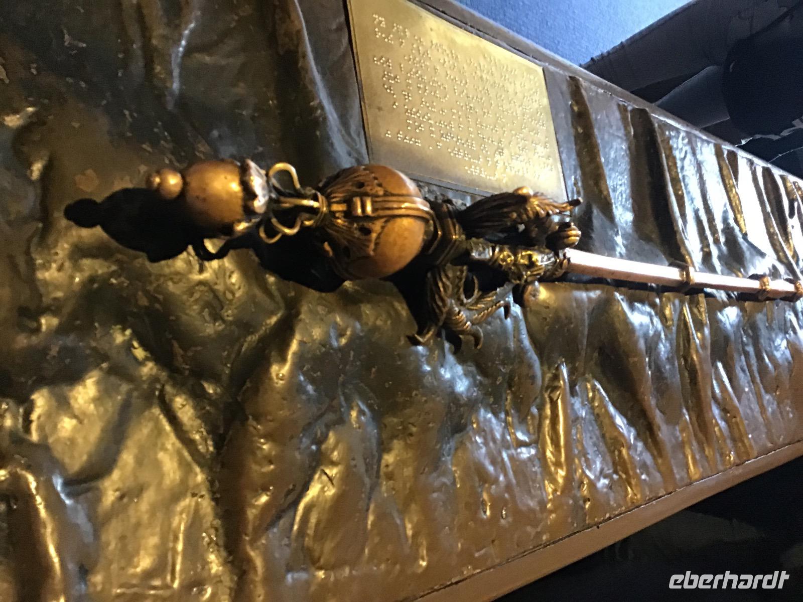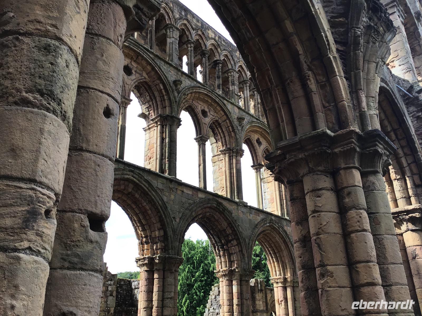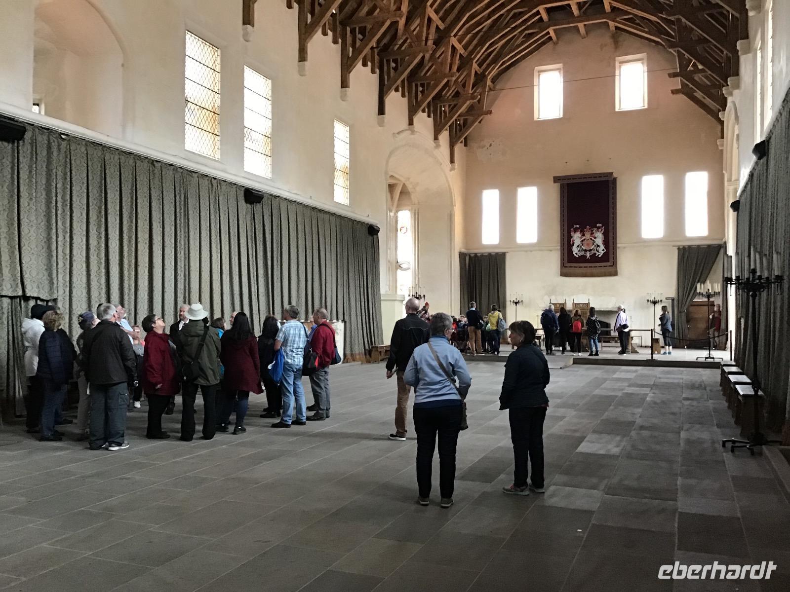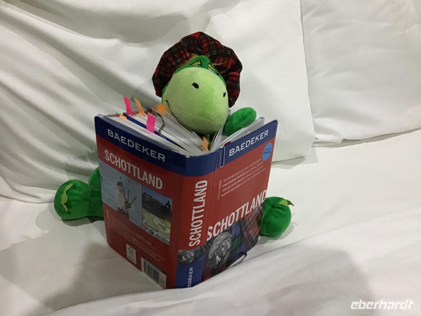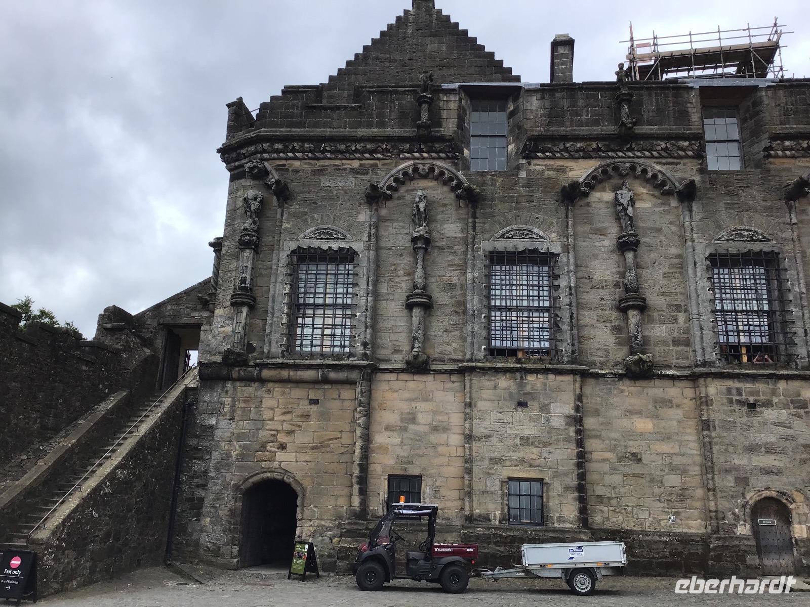 Das Motto von Eberhardt TRAVEL ist „Richtig reisen!" und so nehmen wir mit, was auf dem Weg liegt. Heißt in unsrem Fall heute, bevor wir mit dem geplanten Programm beginnen, fahren wir zum Falkirk Wheel. Dieses ist ein Schiffshebewerk und in seiner Bauweise einzigartig auf der Welt. Freizeitschiffer fahren mit ihren Booten in eine Art Trog und dieser wird dann, wie in einem Riesenrad, von einer Ebene zur anderen befördert. Schade, dass es noch so früh ist, das Falkirk Wheel nimmt seine Arbeit erst ab zehn Uhr auf, wir haben heute aber noch viel vor. Wir fahren zum Stirling Castle. Die Burg liegt auf einem 76 Meter hohen erloschen Vulkanfelsen. Maria Steward wurde hier gekrönt und ihr Sohn getauft. Besonders interessant ist auch die Küche, in der sich ein (Plastik) Schweinchen am Spieß dreht.