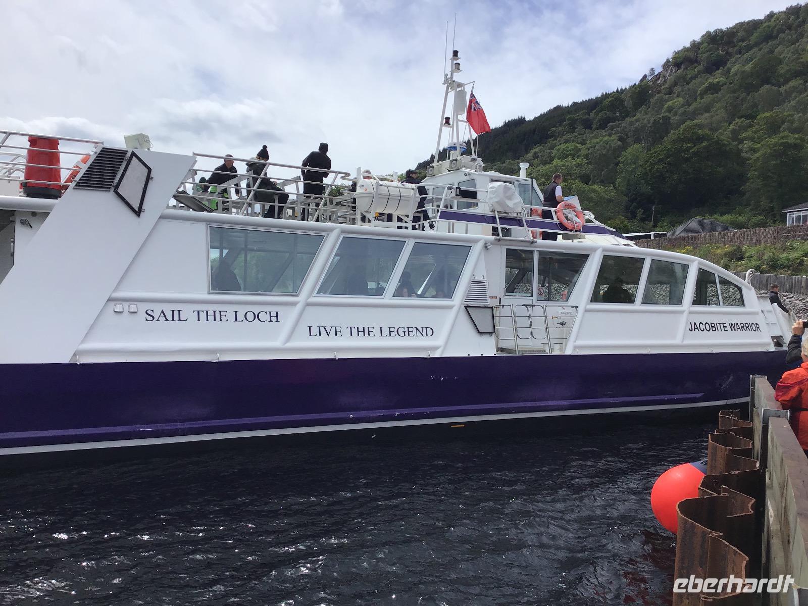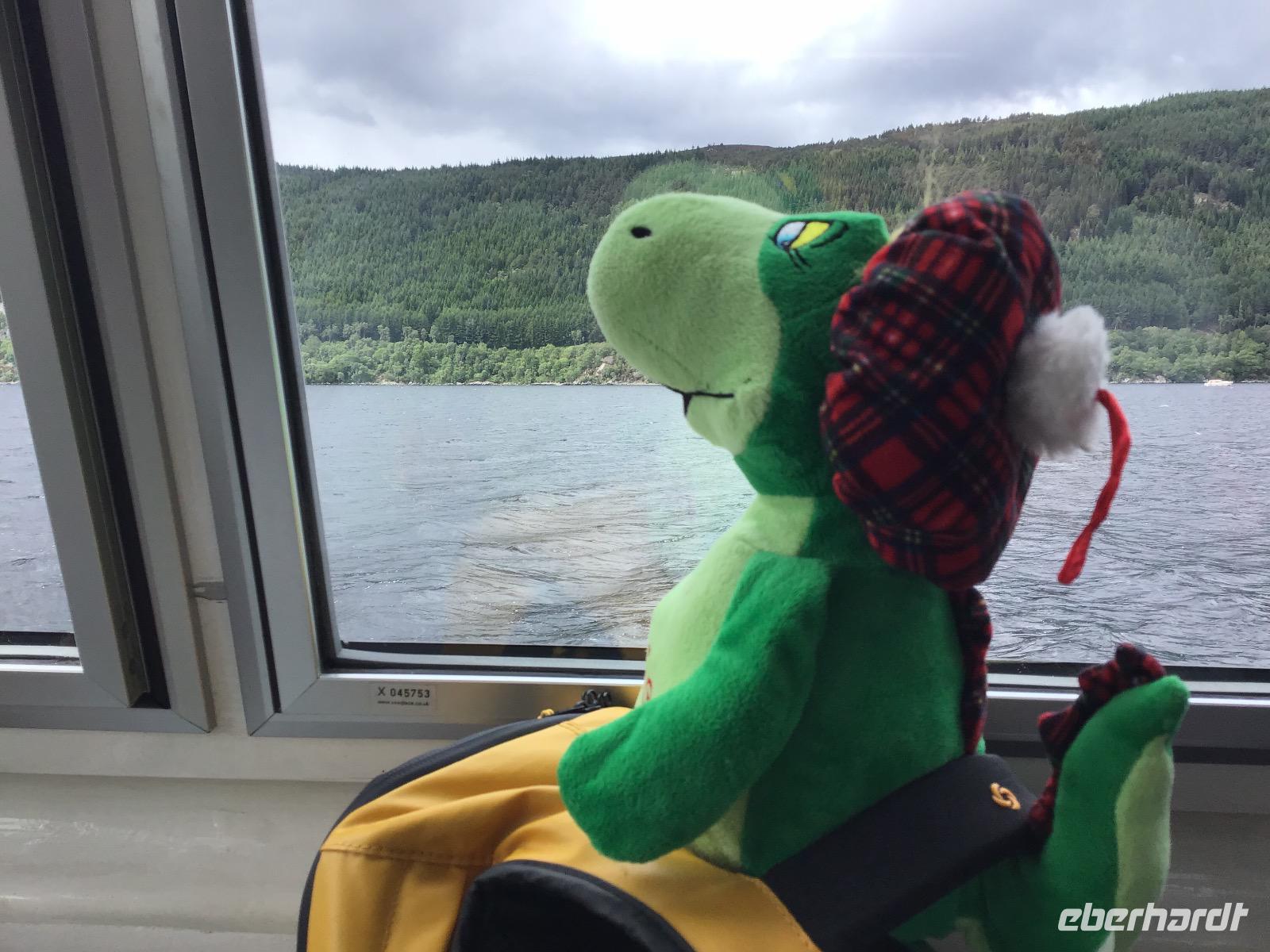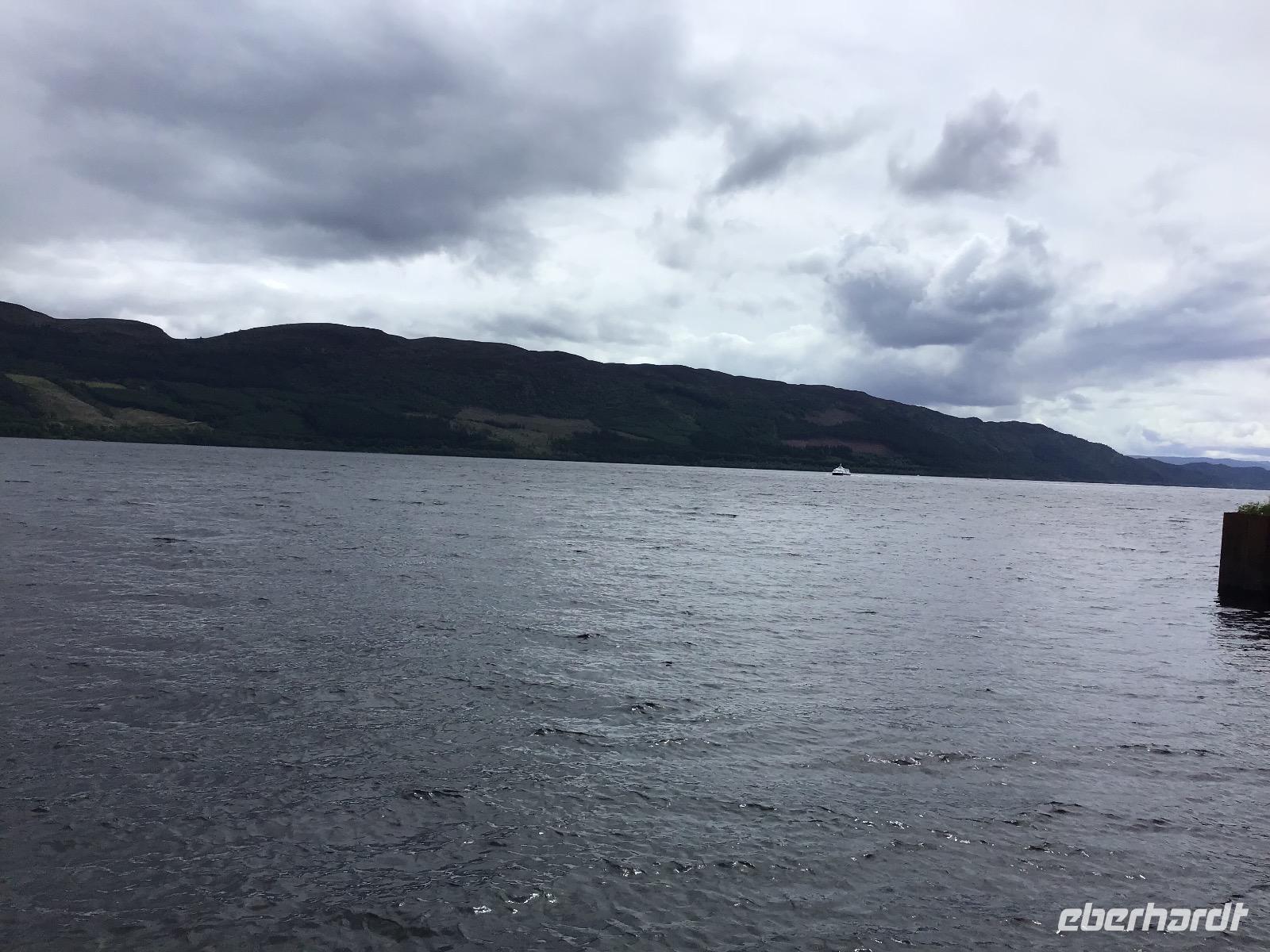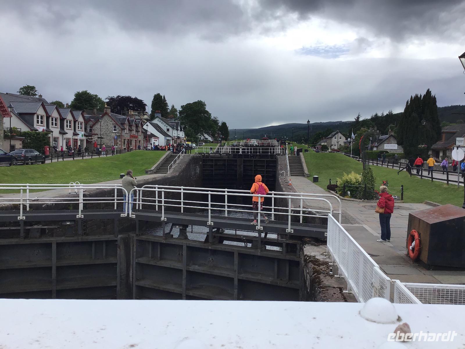 Am Nachmittag unternehmen wir eine Bootstour auf dem Loch Ness. Natürlich ist deutlich zu sehen, dass Nessi unter der Wasseroberfläche schwimmt :-). Nach einer halben Stunde kommen wir am Urquhart Castle an. Bisher war uns das Wetter hold, es regnete nur, wenn wir im Bus waren. Hier erwischt uns ein leichter Nieselregen, der aber bald wieder aufhört. Halb vier treffen wir uns am Bus und fahren weiter nach Fort Augustus. Eine fünfstufige Schleusentreppe muss von Schiffen hier bewältigt und kann von uns bewundert werden. Auf unserem weiteren Weg legen wir noch einen Stopp am Commando-Memorial ein, einem Denkmal für Soldaten, die im Zweiten Weltkrieg gefallen sind.