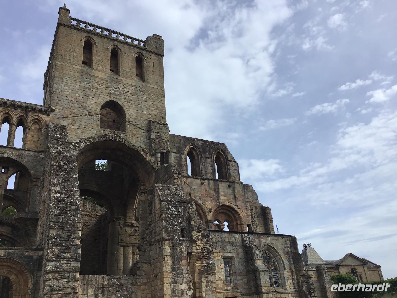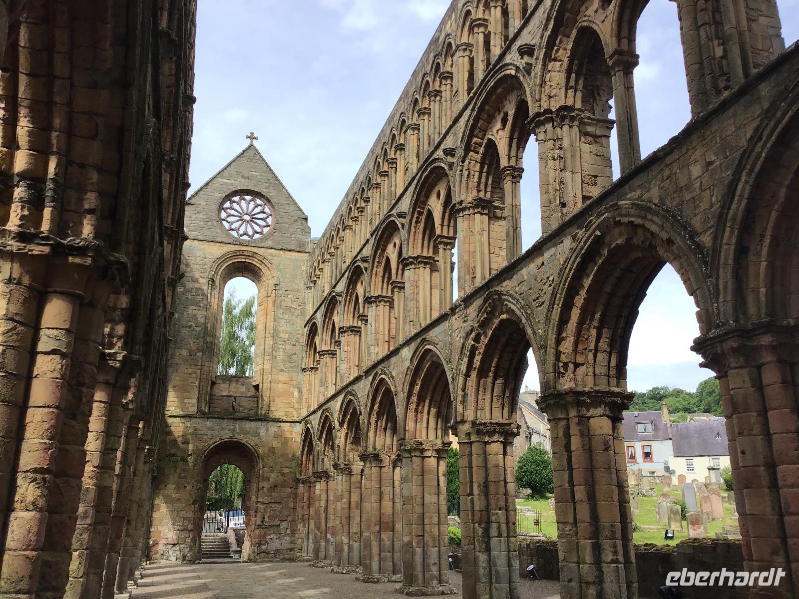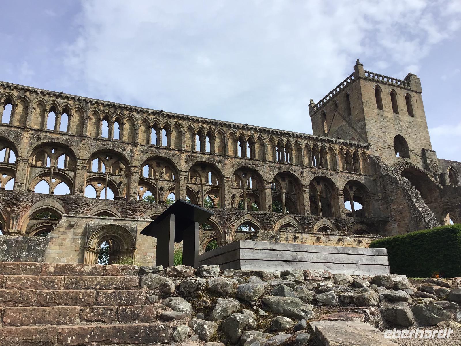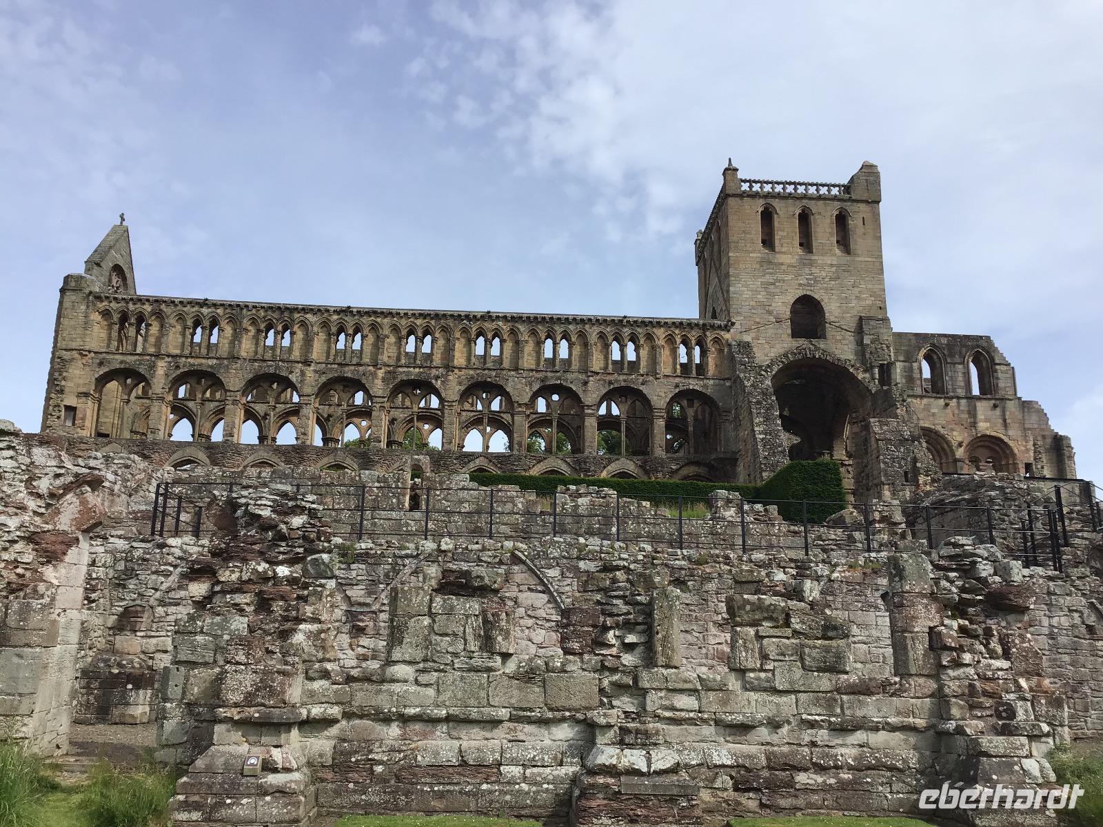 Unterwegs halten wir jedoch nochmals an. Zuerst in Jedburgh, wo wir die Ruine der Abbey besuchen, die hier tausend Jahre lang das bedeutendste Bauwerk der Region war. Außerdem ist Zeit, das Mary Steward Haus zu besichtigen und durch das Städtchen zu bummeln. Eine viertel Stunde weiter befindet sich die Grenze zwischen Schottland und England. Die Aussicht auf die Umgebung ist grandios. Außerdem ist der Dudelsackspieler da und lässt sich von uns geduldig fotografieren. Nun endet unsere Reise durch Schottland. Am Nachmittag erreichen wir Newcastle und fahren über Nacht mit der Fähre nach Hause.