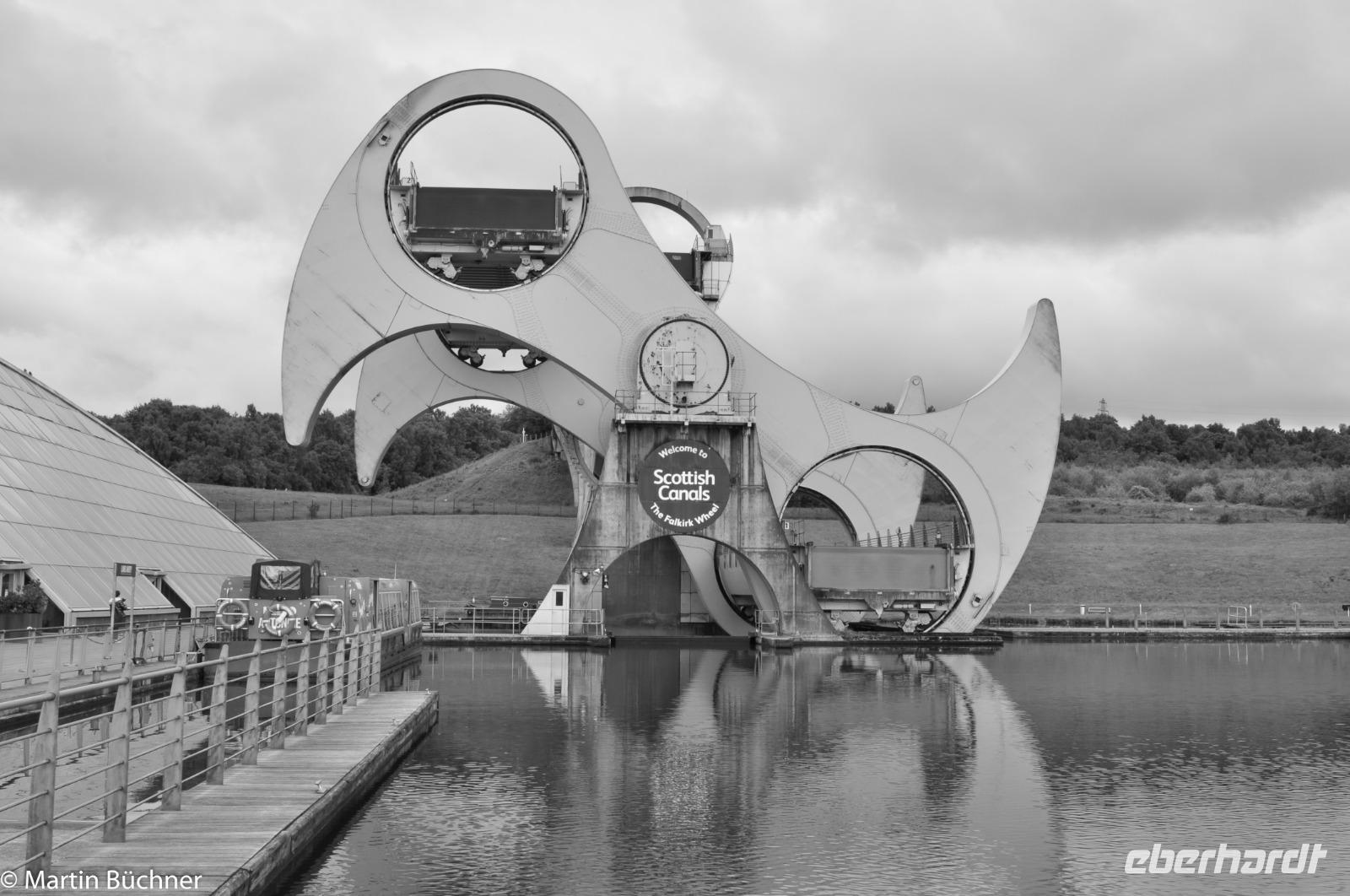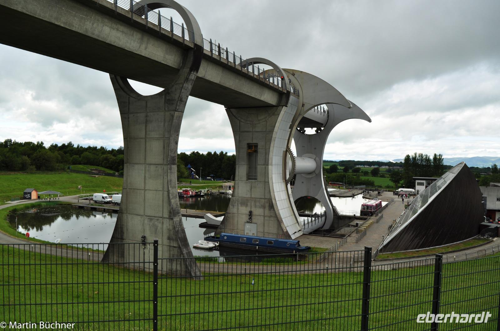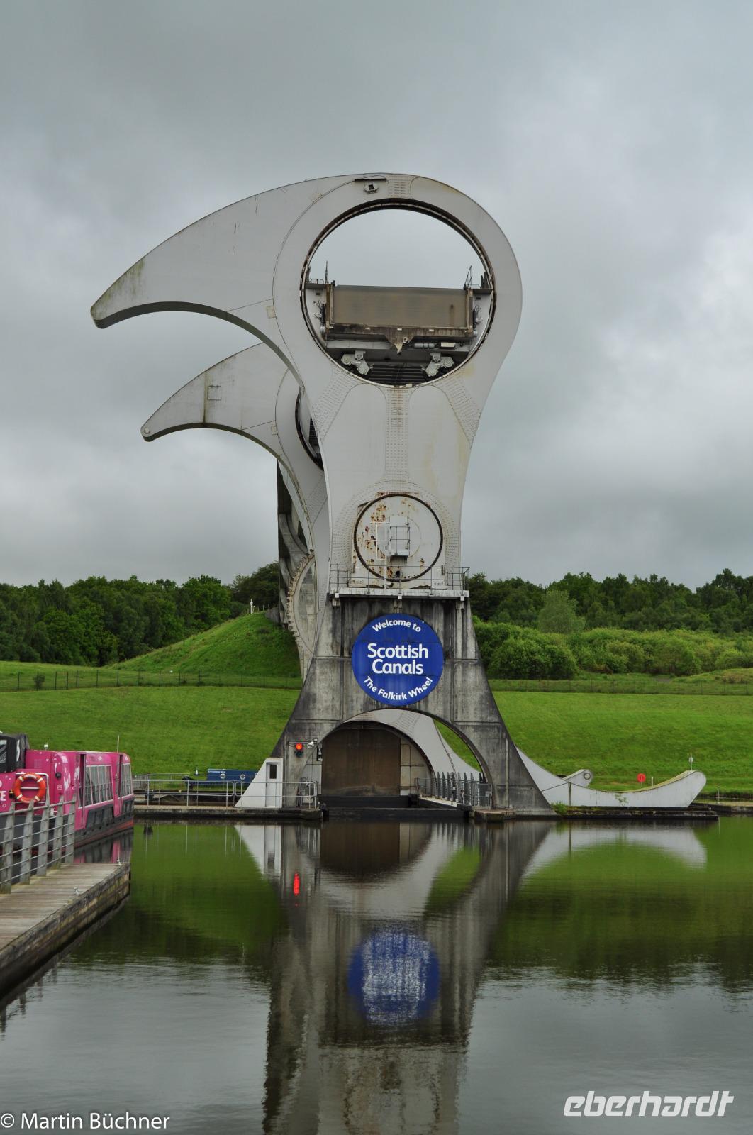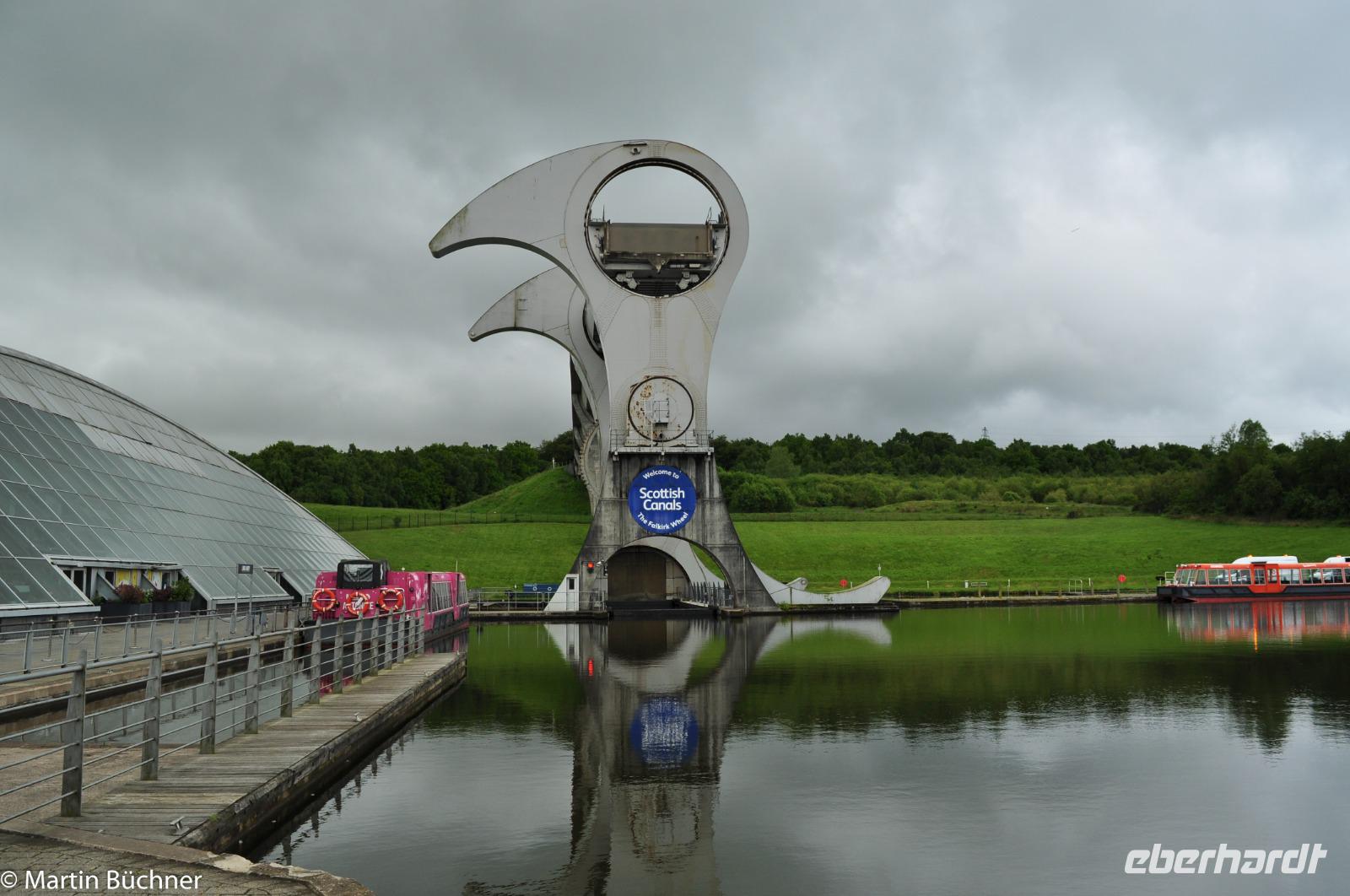 Wir starten zu einem Millennium Projekt, dem sogenannten Falkirk Wheel in Falkirk. Dabei handelt es sich um ein riesiges Schiffshebewerk in Form eines Riesenrades. Mit wenig Kraftaufwand können nach dem archimedischen Prinzip zwei Schiffe gleichzeitig befördert werden. Das Falkirk Wheel ersetzte eine baufällig gewordene Schleusentreppe am Union Canal, einer Narrowboat-Schiffsverbindung zwischen der Nordsee und der Irischen See, quer durch den Central Belt.