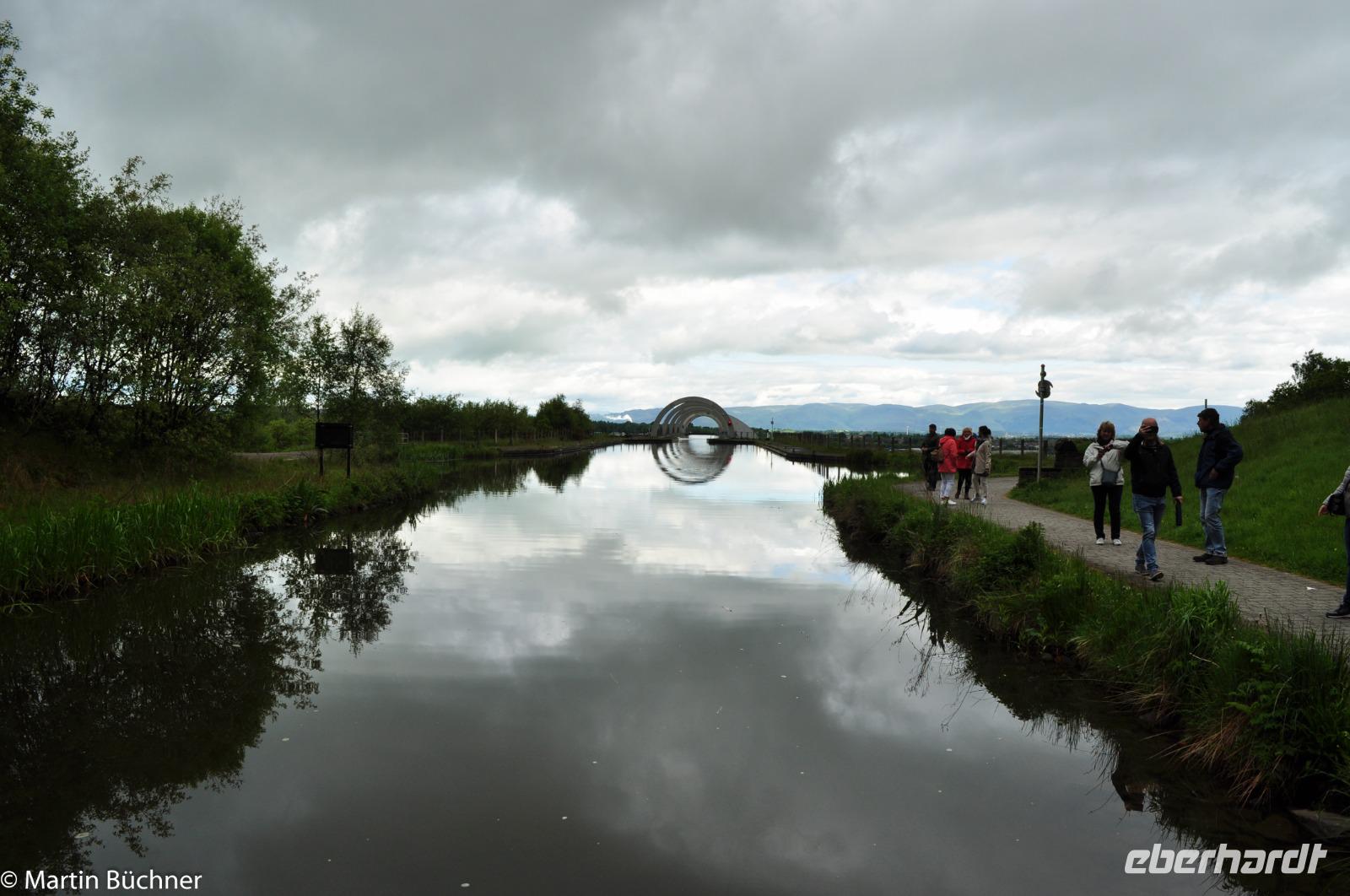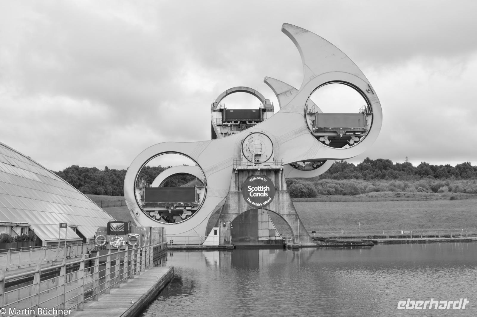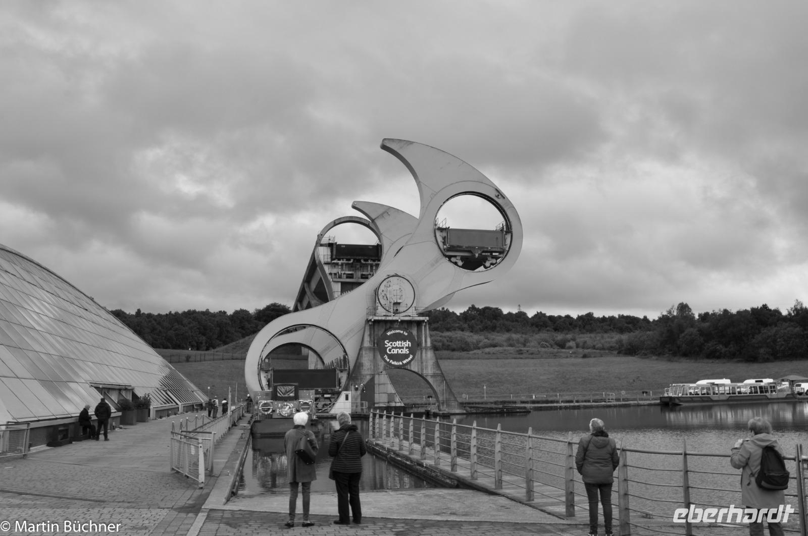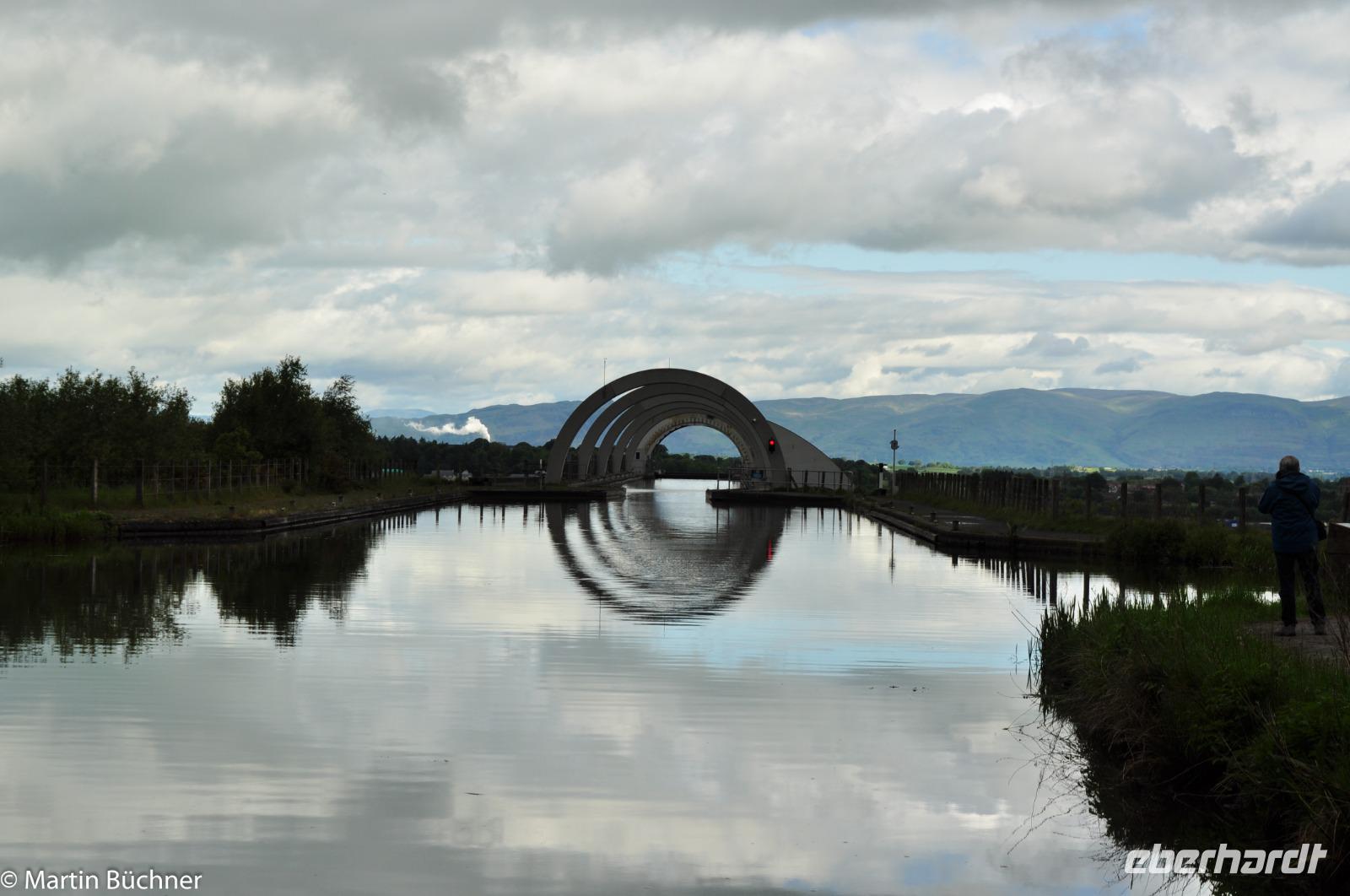 Wir starten zu einem Millennium Projekt, dem sogenannten Falkirk Wheel in Falkirk. Dabei handelt es sich um ein riesiges Schiffshebewerk in Form eines Riesenrades. Mit wenig Kraftaufwand können nach dem archimedischen Prinzip zwei Schiffe gleichzeitig befördert werden. Das Falkirk Wheel ersetzte eine baufällig gewordene Schleusentreppe am Union Canal, einer Narrowboat-Schiffsverbindung zwischen der Nordsee und der Irischen See, quer durch den Central Belt.