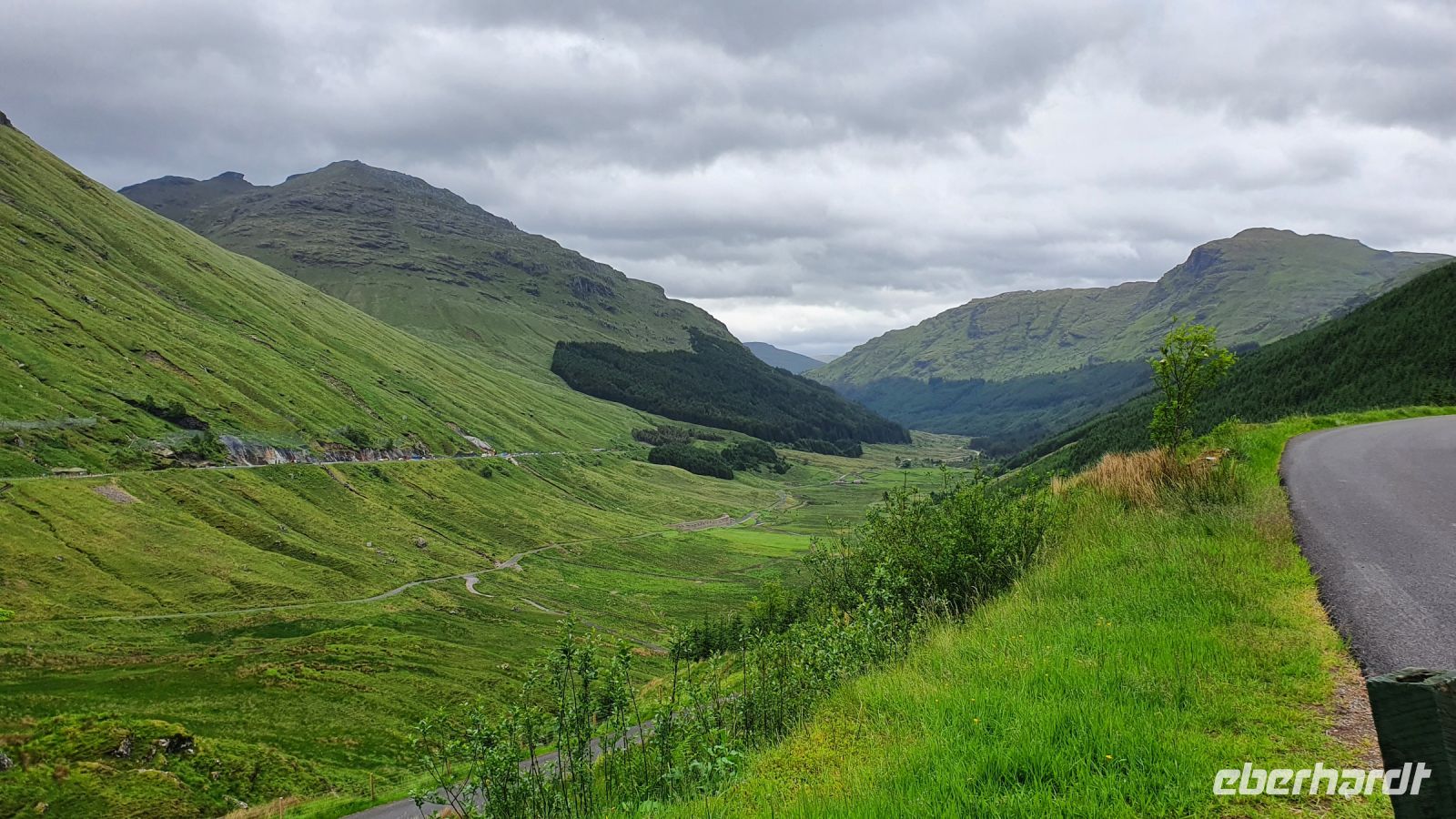 Wir frühstücken in der Lobby des Hotels in coolem Ambiente, alles hat mit Musik zu tun, selbst auf den Gängen erzeugen die eigenen Schritte einen Sound...Dann geht es los und Jan fährt uns erst einmal zu einem Überraschungsstopp: zum IBROX-Stadium der Glasgow Rangers, das muss man gesehen haben, zumal es ganz in der Nähe unseres Hotels ist. Nun aber weiter wie geplant: der schönste See Schottlands- der Loch Lomond- erwartet uns. In Luss halten wir an und spazieren gemeinsam zum Seeufer, hinter uns die Luss-Hills und am Nordufer des Sees der Ben Lomond- ein Munroe. Das heißt, er ist höher als 3000... Fuss. Auf dem Friedhof an der Kirche zeige ich einen Hogback- ein Grabstein, der auf die Wikinger zurückgeht. Weiter geht unsere Reise- nach Oban. Eigentlich heißt der Ort wörtlich übersetzt "kleine Bucht", heute ist er der größte Fährhafen zu den Inseln der Hebriden. Wir genießen am Hafen leckere Fish & Chips oder auch Scampi-Sandwiches und andere fangfrische Köstlichkeiten aus dem Meer. Wer möchte stattet dem Mc Caigs-Tower einen Besuch ab- ein Nachbau des Kolosseums in Rom- oder spaziert einfach durch die Stadt mit ihren Promenaden. So gestärkt geht es auf der Südroute zurück. Natürlich darf ein Stopp am Kilchurn Castle nicht fehlen und schließlich erreichen wir Inverary. Die erste am Reißbrett entstandene Stadt- die alte Stadt störte nämlich den Schlossherrn, den Duke of Argyll, sie nahm ihm die Sicht auf den See. Also ließ er sie abreißen und neu aufbauen. Natürlich halten wir am Inverary Castle- dem unschottischsten aller schottischen Castles- und statten dann dem Örtchen einen Besuch ab. Das Gefängnis-Museum hat heute bereits geschlossen, aber wir bummeln gern durch die High Street, stöbern im Whisky-Laden oder genießen ein Eis. Bei der Fahrt über die Brücke genießen wir noch einmal den Blick aufs Castle und dann geht es durch die Highlands nach Süden. Am Rastplatz "the rest &be thankfull" gelingen tolle Fotos von den Bergen, Seen und Tälern. Glasgow hat uns am Abend dann wieder und ein gemeinsames Essen in der "Villa Toscana" beendet unseren Tag.