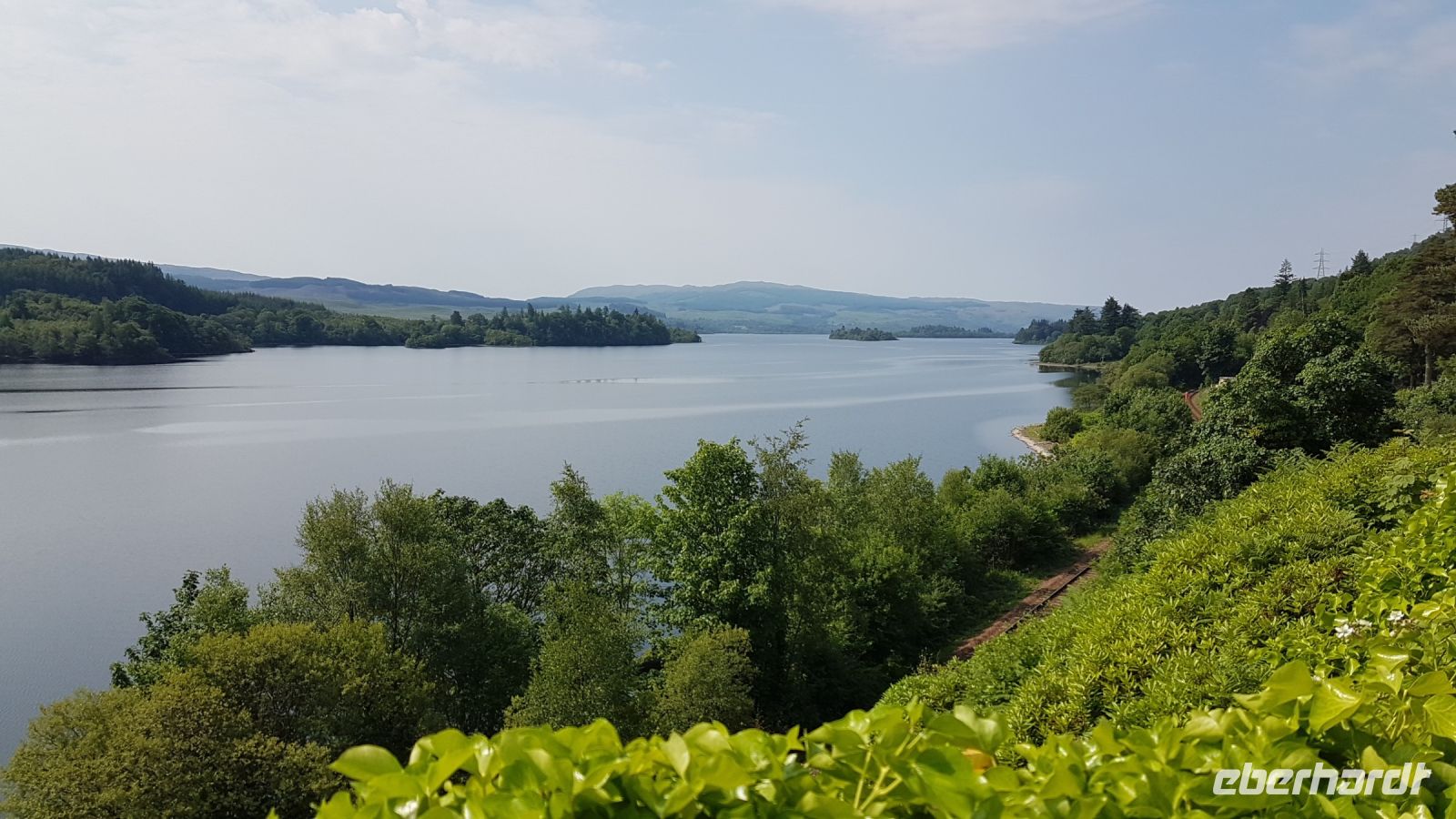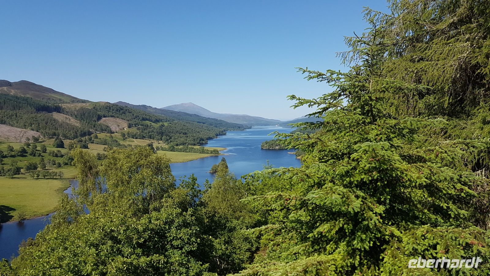 Bei wieder herrlichstem Sommerwetter verließen wir unser Hotel in Newtonmore und reisten durc den Cairngorms National Park mit seinen beeindruckenden Grampian Mountans in Richtung Süden. Wir fuhren zum Queens View, das ist ein Aussichtspunkt mitten in der herrlichen Landschaft mit Blick auf Loch Tummel. Unsere Mittagspause verbrachten wir in Pitlochry. Das ist ein hübsches Städtchen in den Highlands mit bunten Geschäften und Cafés. Eine Besonderheit ist die Lachstreppe und eine Staumauer, über die wir spazieren konnten.