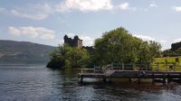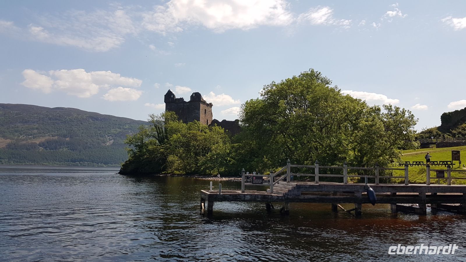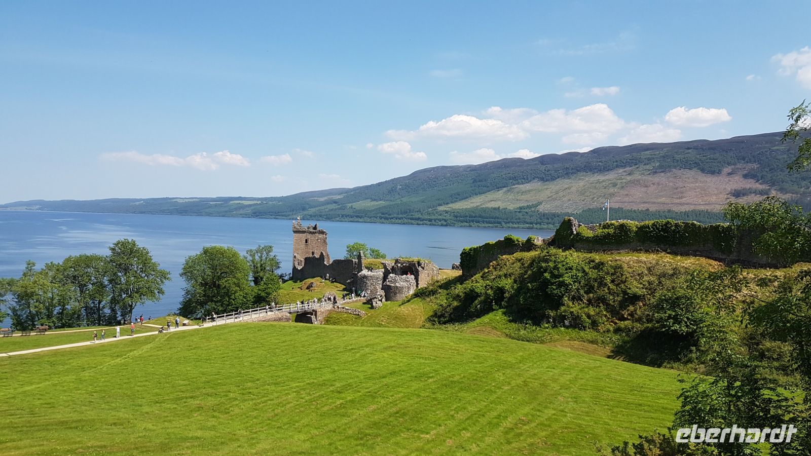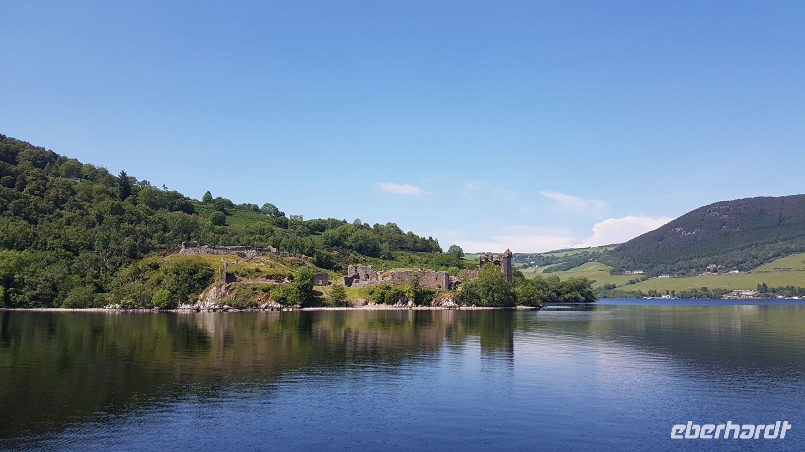 Der nächste Morgen führte uns zuerst nach Fort George, einer Militärfestung auf einer Landzunge am Moray Firth. Wir lernten einiges über das Leben der Soldaten dort, früher und heute. Man konnte sogar von den Festungsmauern aus Delphine im Wasser beobachten im Moray Firth. Nach dem Aufenthalt inFort George erreichten wir bald Culloden Battlefield, wo die schottischen Clans unter Bonnie Prince Charlie im Jahre 1746 eine verheerende Niederlage gegen die Engländer erlitten hatten. Wir sahen einen Teil des Schlachtfelds. Durch Inverness führte uns nun unser Weg in Richtung Loch Ness, dem See des berühmten Monsters Nessie. Am Clansman Hotel am Westufer des Sees bestiegen wir ein Schiff der "Jacobite Cruises" und fuhren eine halbe Stunde über den See bei heißem Sommerwetter. Trotz genauester Beobachtung der Wasseroberfläche hatte wohl niemand aus unserer Gruppe das Glück, Nessie tatsächlich zu entdecken. Wir legten an am Urquhart Castle, der Ruine einer alten Festung. Zwischen den Ruinen kann man umherspazieren, von hier aus genießt man einen herrlichen Blick über Loch Ness. Im Besucherzentrum wird ein Film über die Geschichte von Urquhart Castle gezeigt.