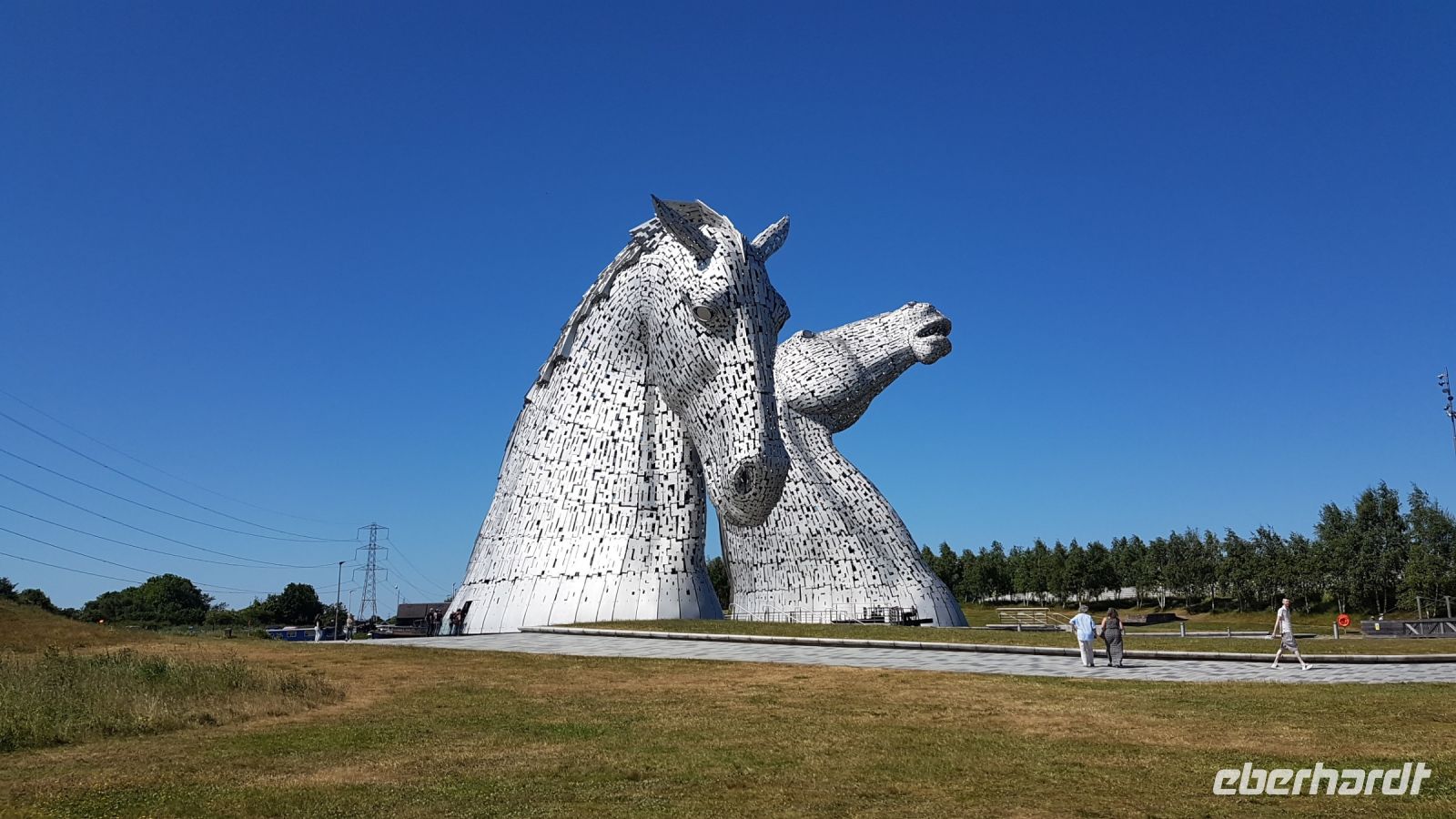 Unser weiterer Weg führte uns wieder an Stirling vorbei. Bald erreichten wir Falkirk Wheel – auch die verrückte Schleusentreppe genannt. Es handelt sich um ein Schiffshebewerk, dass die Boote in sich gegenüberliegenden gleich großen Wannen mittels Drehbewegung nach oben oder unten bringt, mit einer sehr geringen Anschubenergie. Wir bestaunten einen dieser Hebevorgänge. Danach fuhren wir in den Helix-Park, wo zwei 30 Meter hohe Pferdeköpfe aus Edelstahl schon von Weitem zu sehen sind. Sie erinnern an die Arbeit der Pferde im Dienste des Menschen, als die Kanäle noch zu Transportzwecken genutzt worden sind.