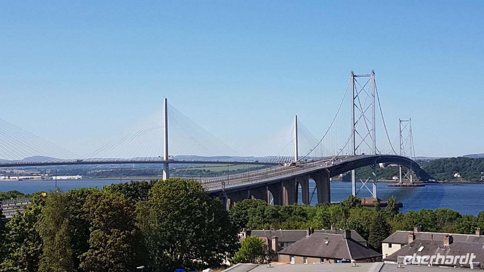 Bevor wir schließlich nach Edinburgh hinein fuhren, hielten wir noch einmal an, um einen Blick auf drei imposante Brücken zu fotografieren, die hier den Firth of Forth in einer Breite von über 2500 Metern überspannen.
