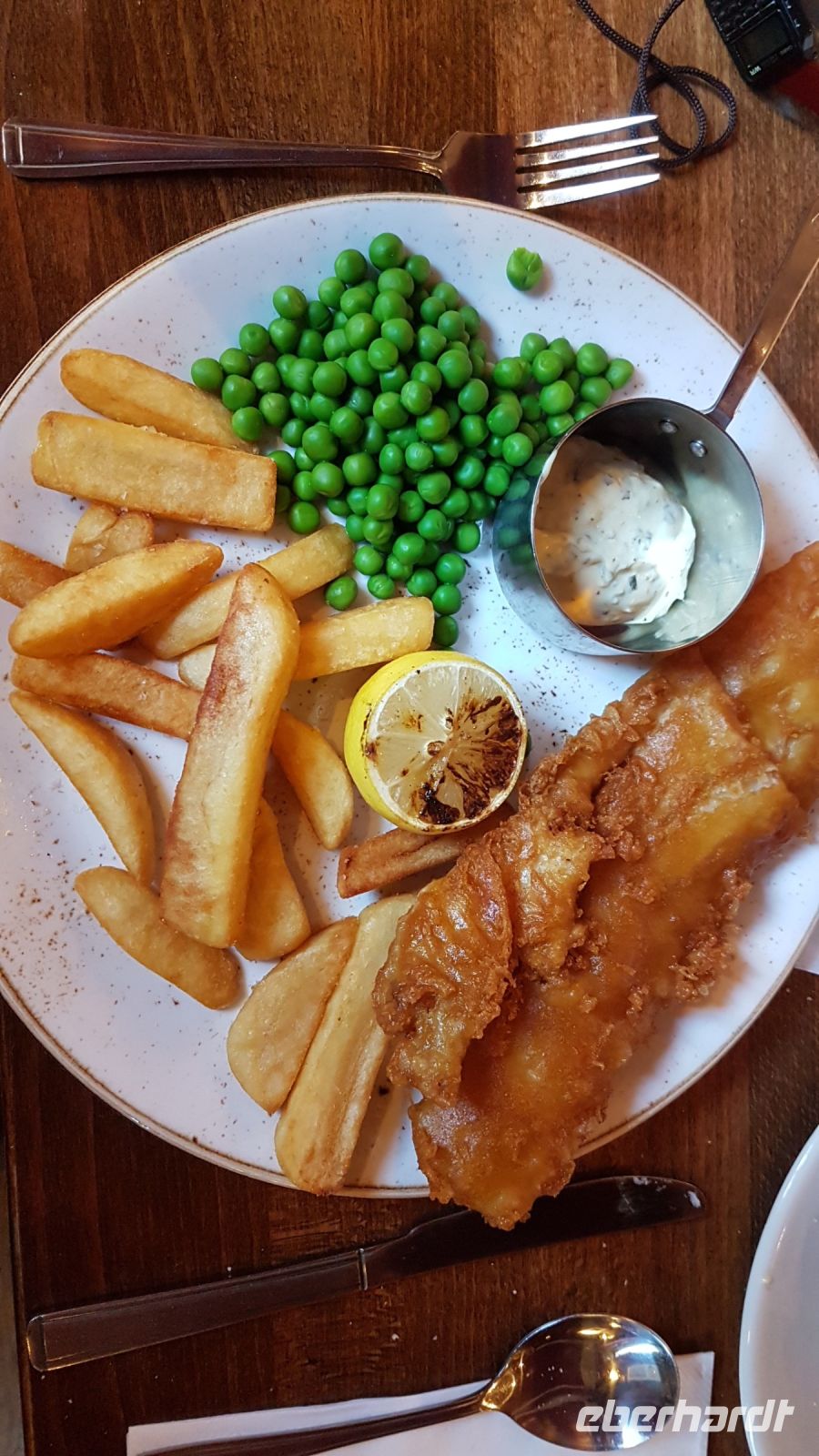 Am frühen Abend erreichten wir unser zentral gelegenes Hotel in Edinburgh. Von hier aus spazierten wir zum Grassmarket, wo wir im Pub Beehave Inn unser Abendessen bekamen – traditionell Fish and Chips.